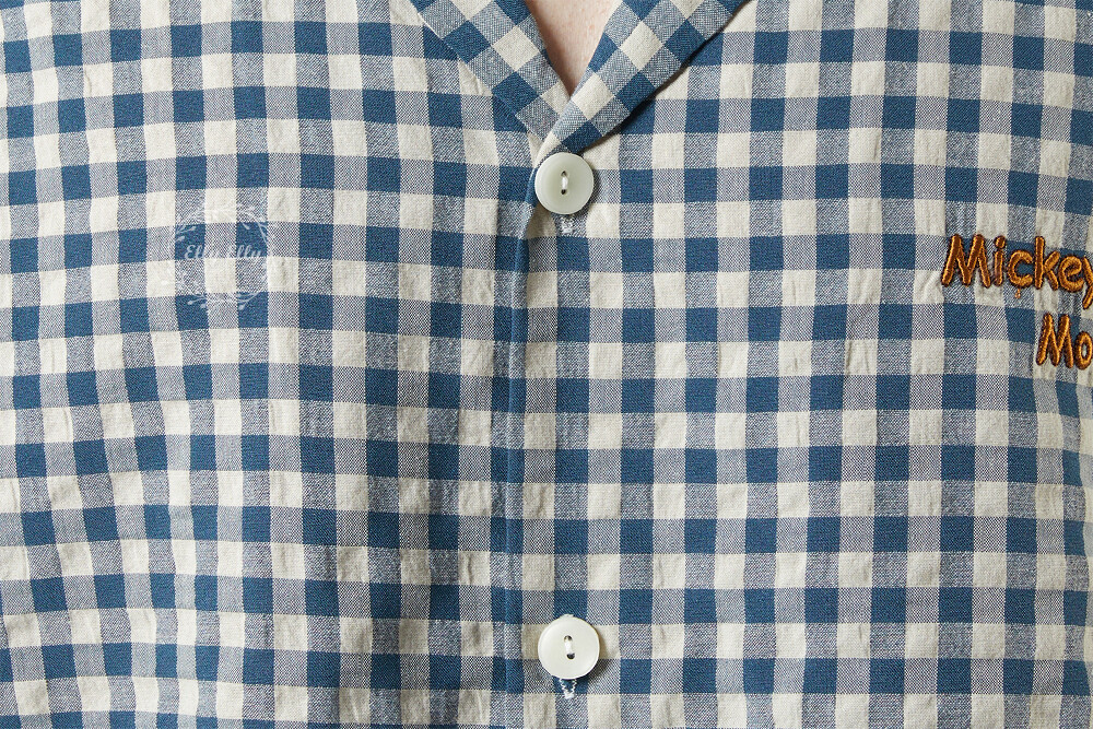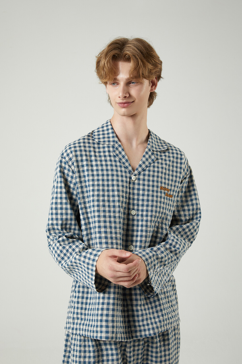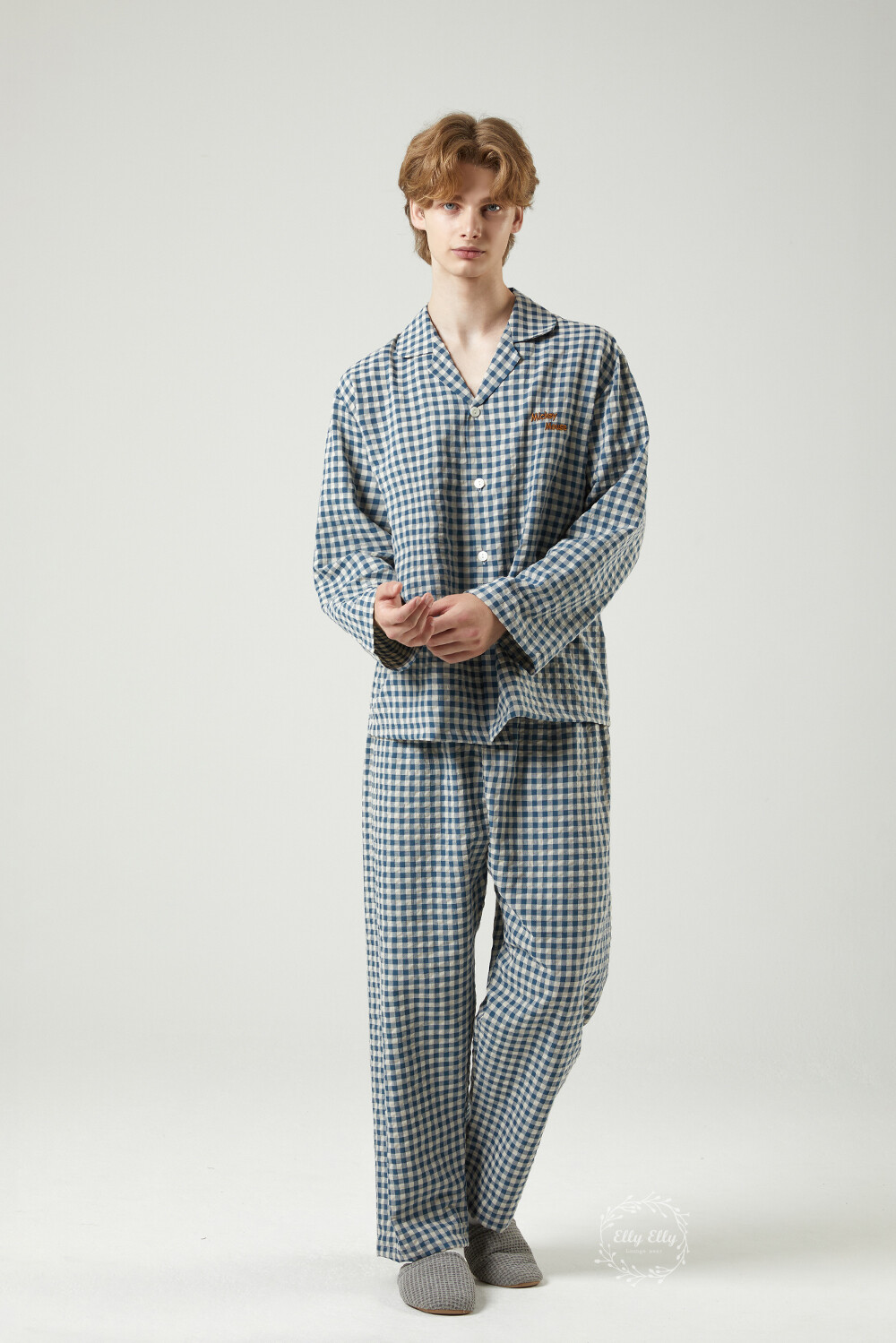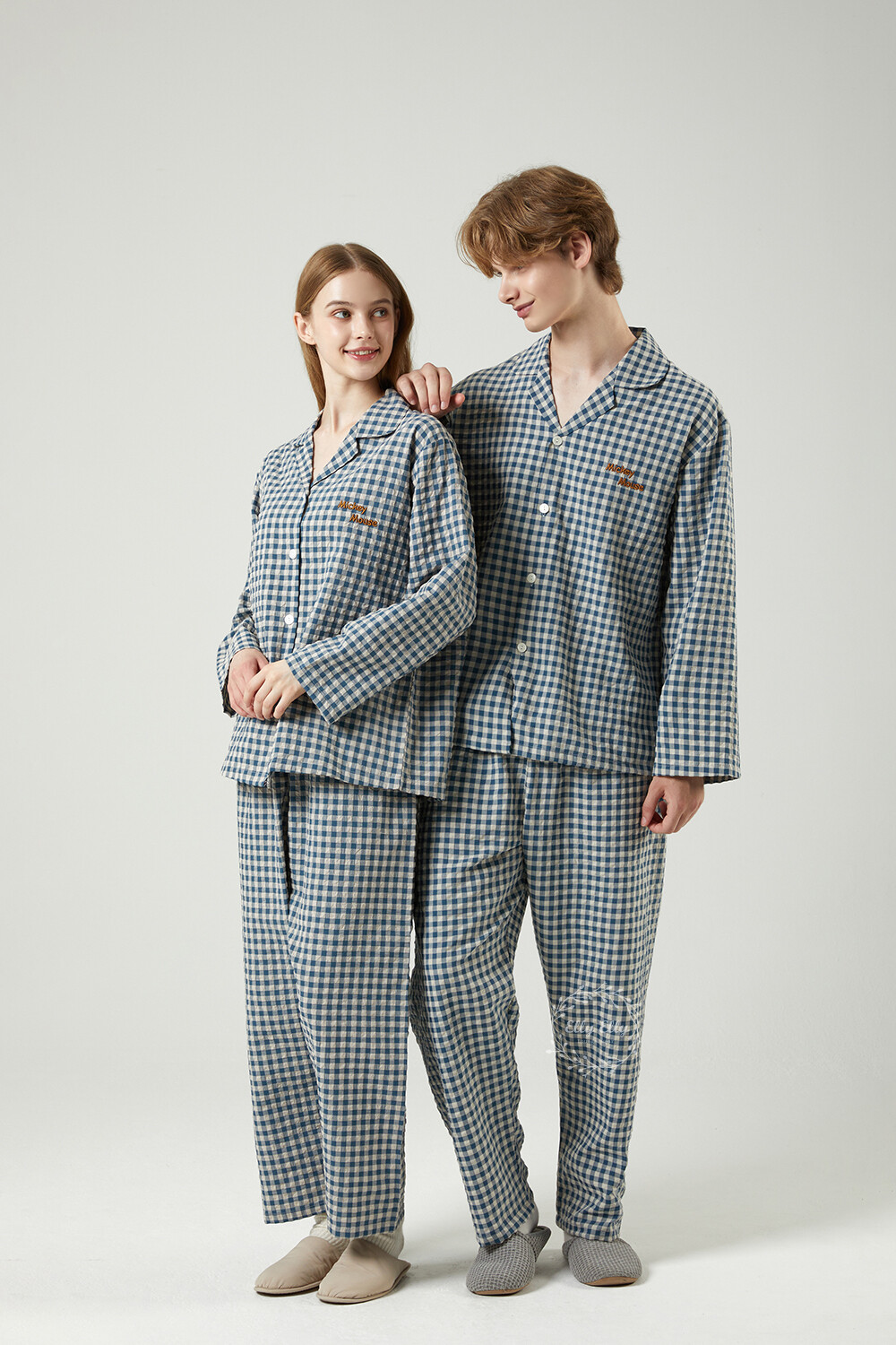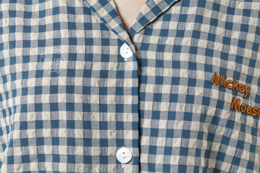 DK-5323 디즈니정품 미키마우스 체크무늬 와이카라 남여커플 잠옷세트 긴팔상하 뉴블루