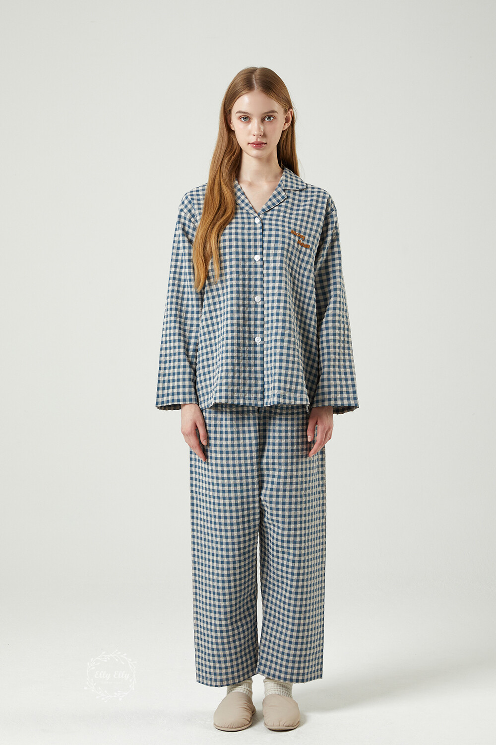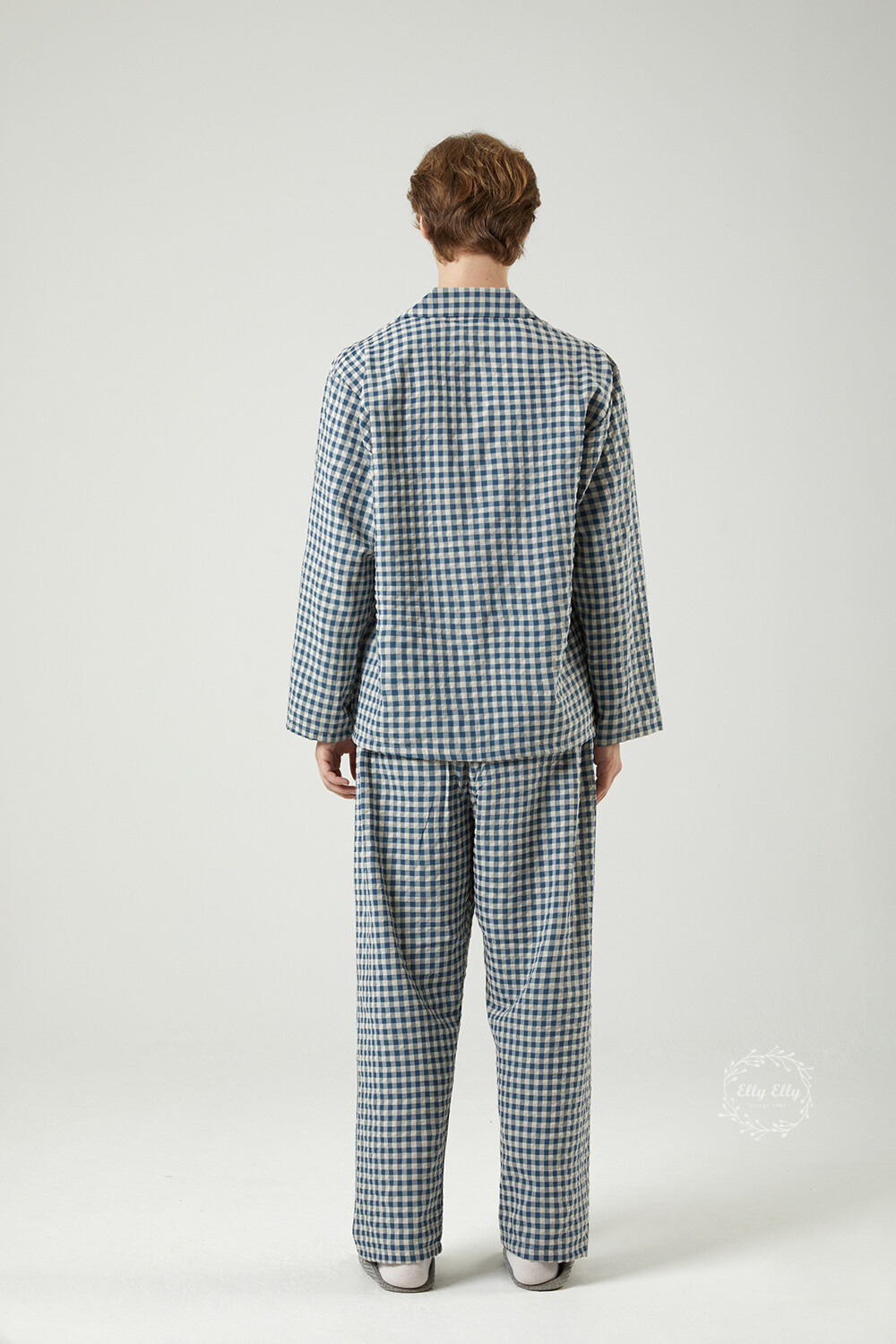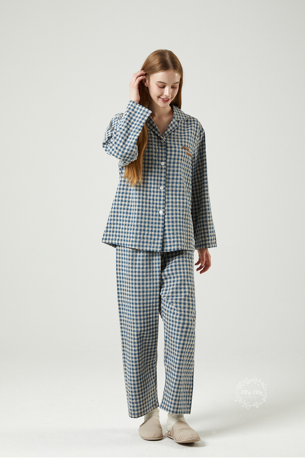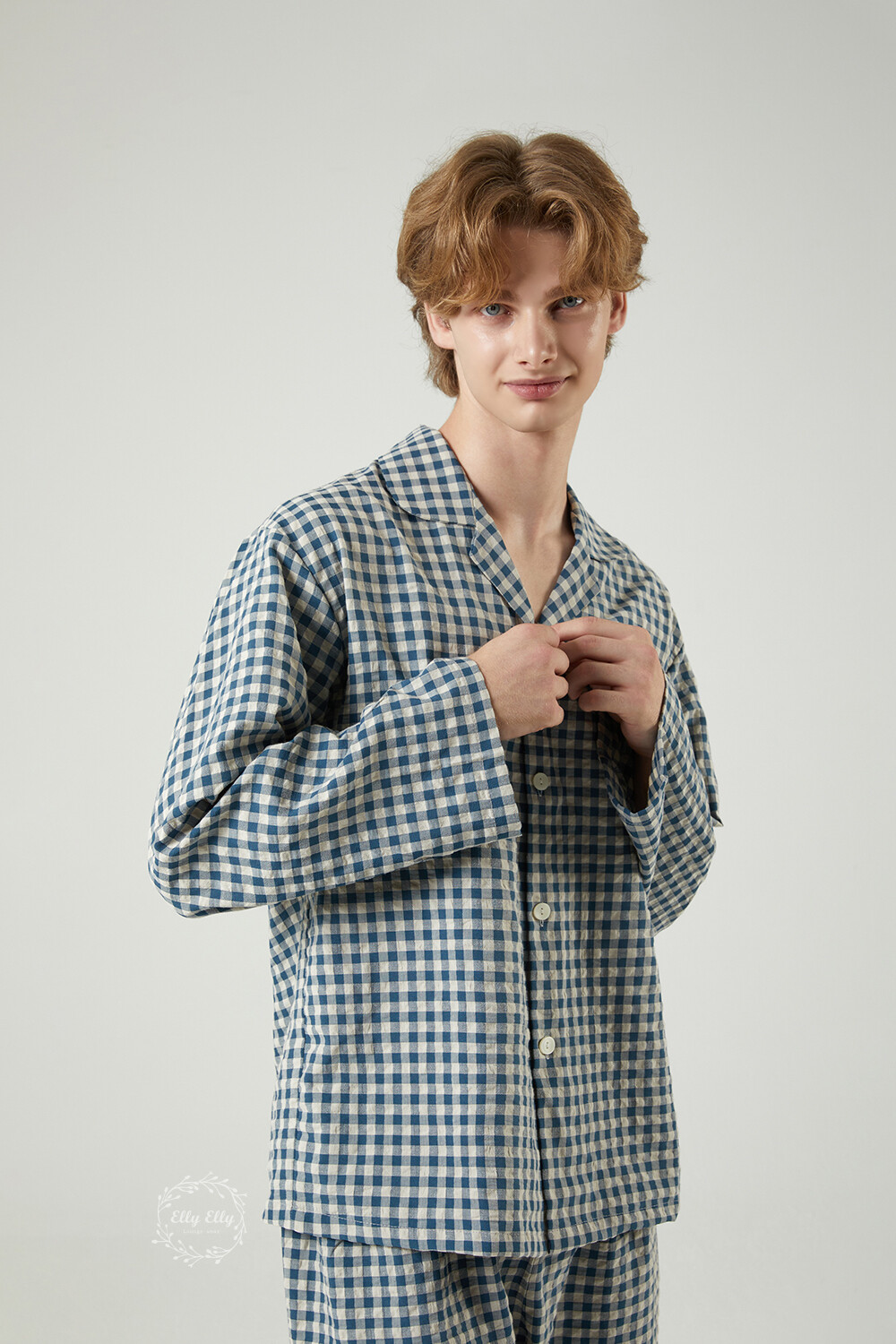 DK-5323 디즈니정품 미키마우스 체크무늬 와이카라 남여커플 잠옷세트 긴팔상하 뉴블루