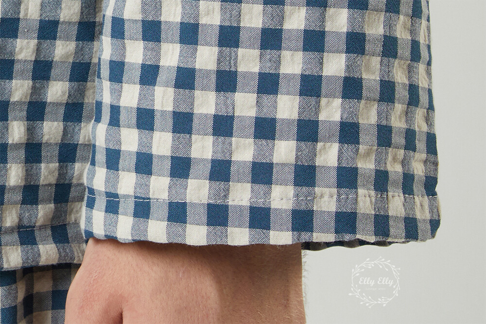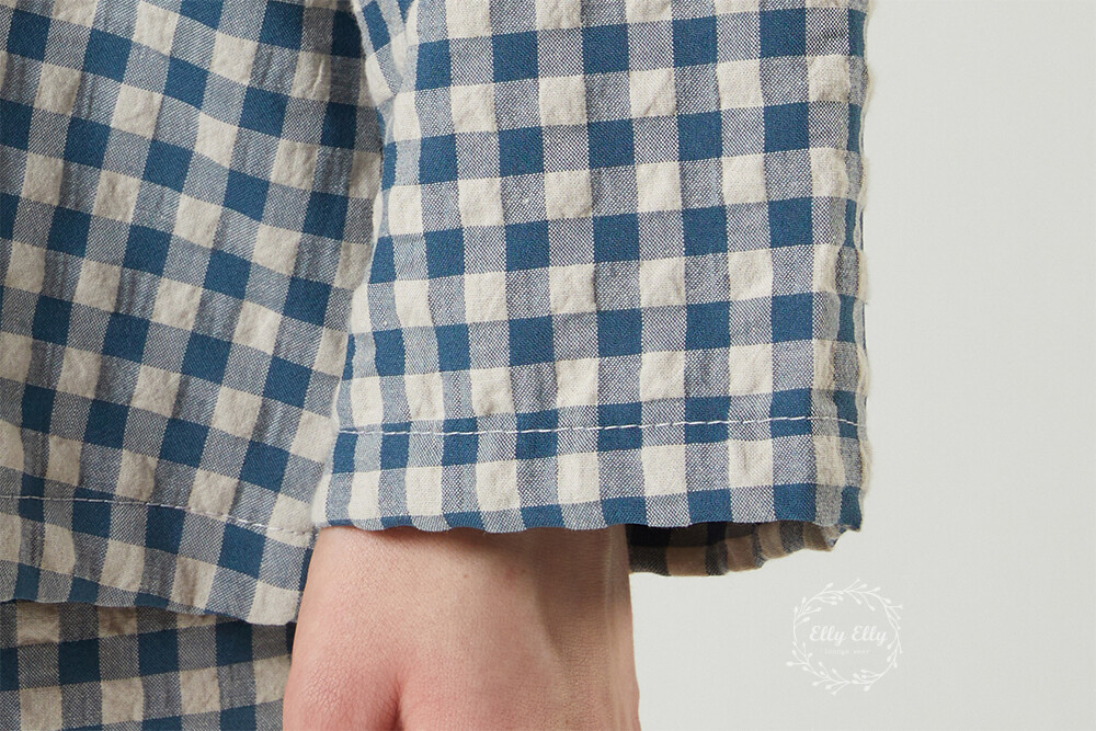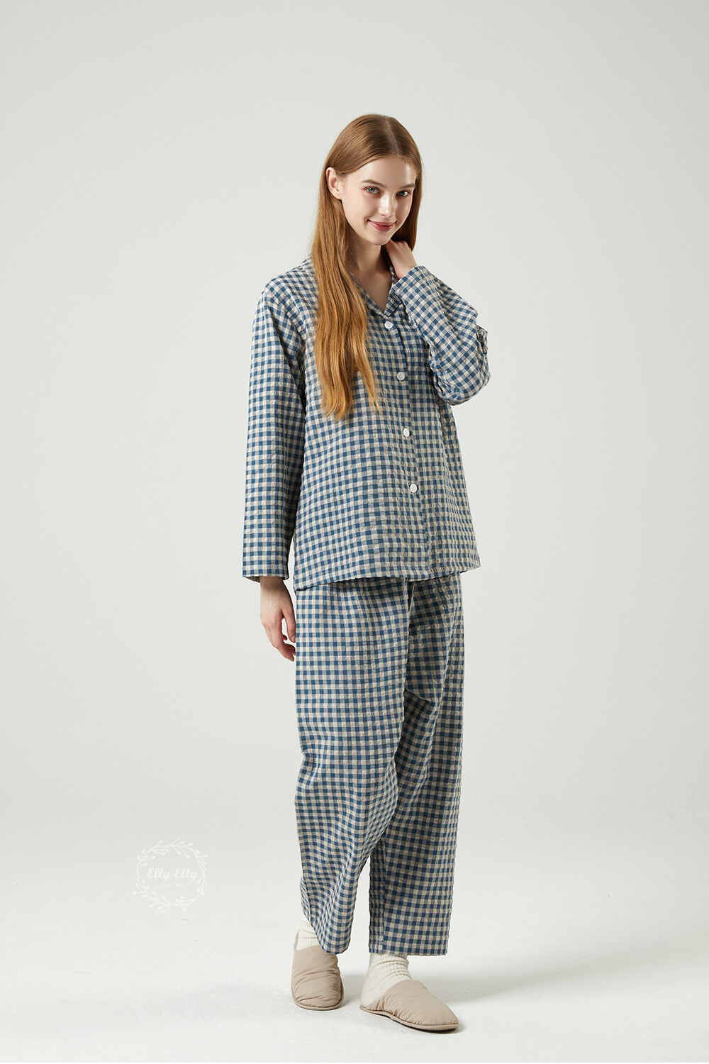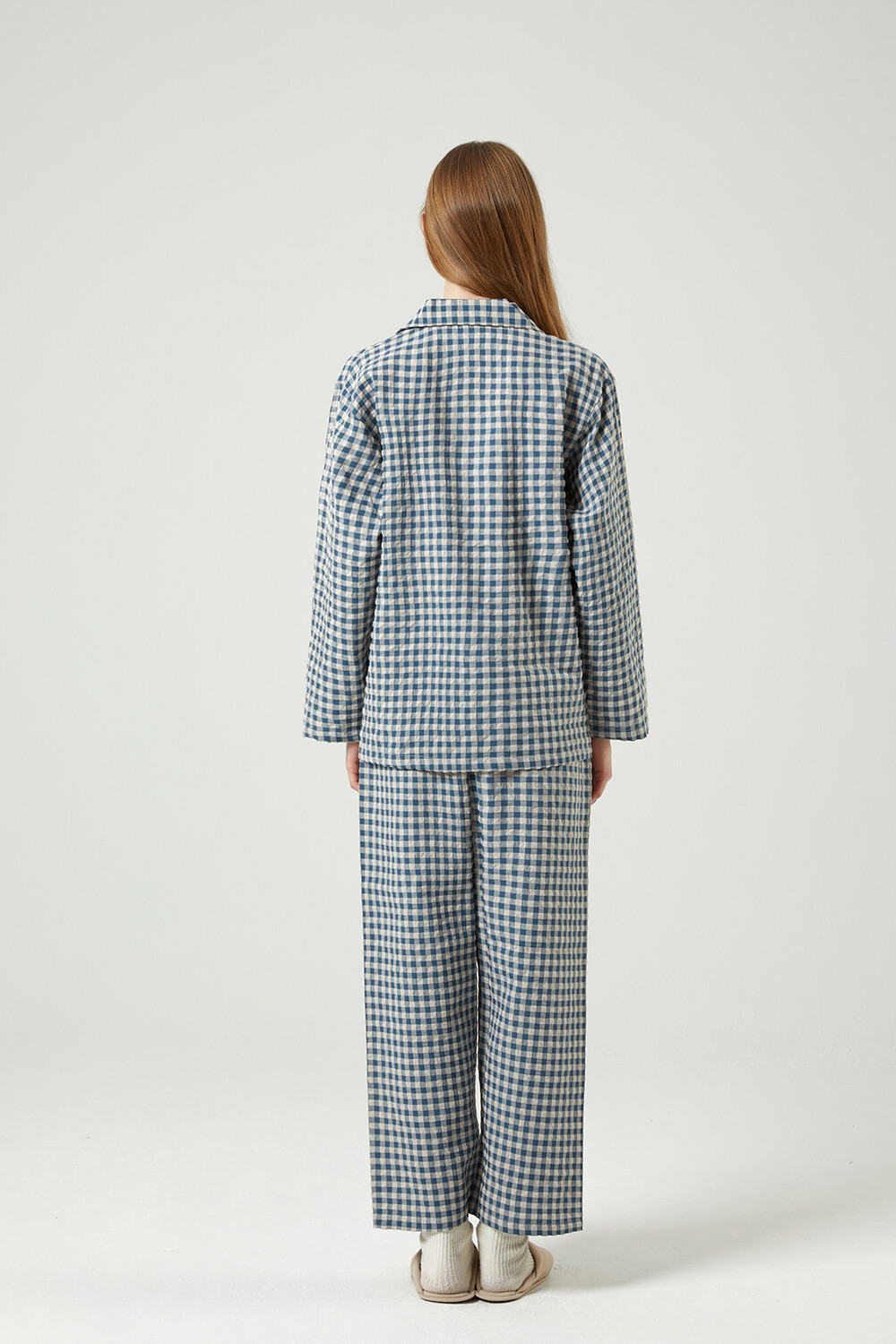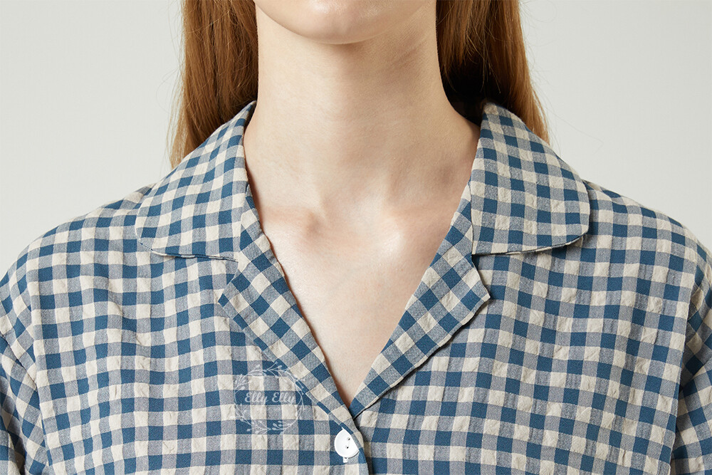 DK-5323 디즈니정품 미키마우스 체크무늬 와이카라 남여커플 잠옷세트 긴팔상하 뉴블루