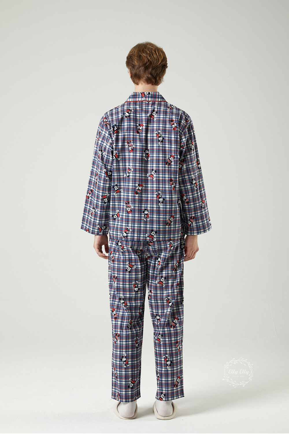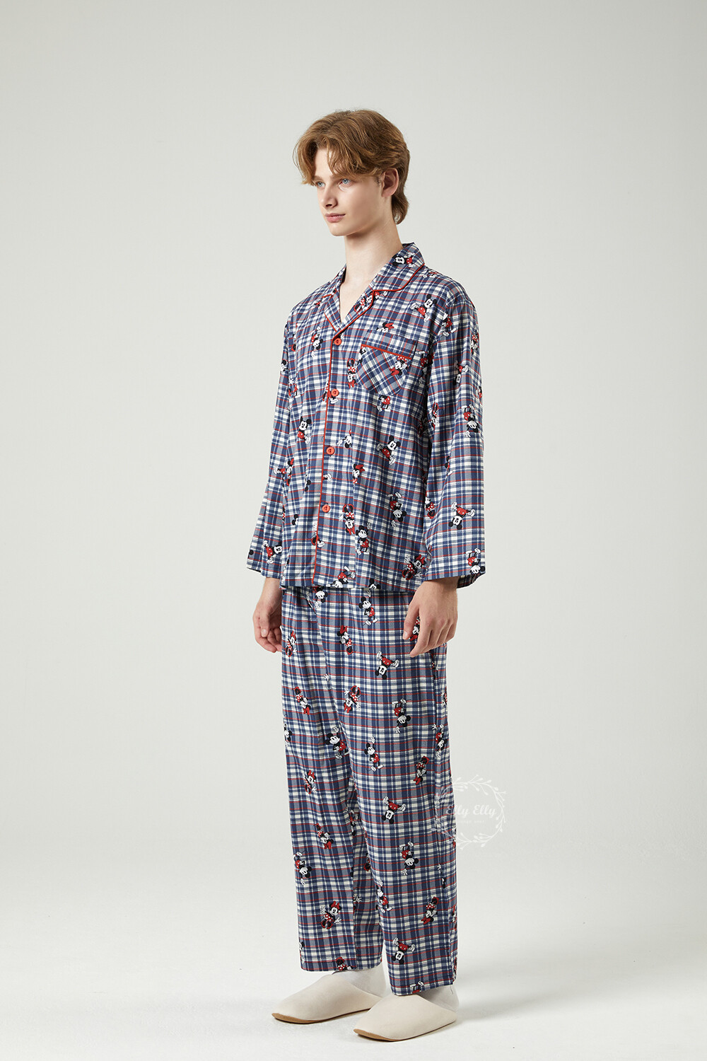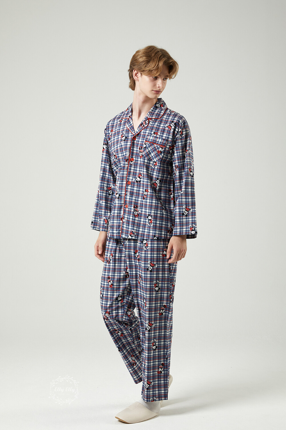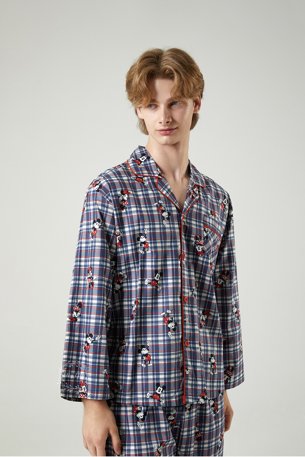 DK-5324 디즈니정품 미키마우스 체크무늬 남여커플 와이카라 잠옷세트 긴팔투피스