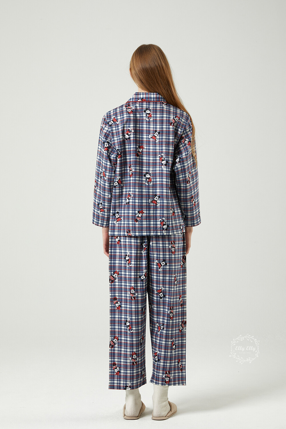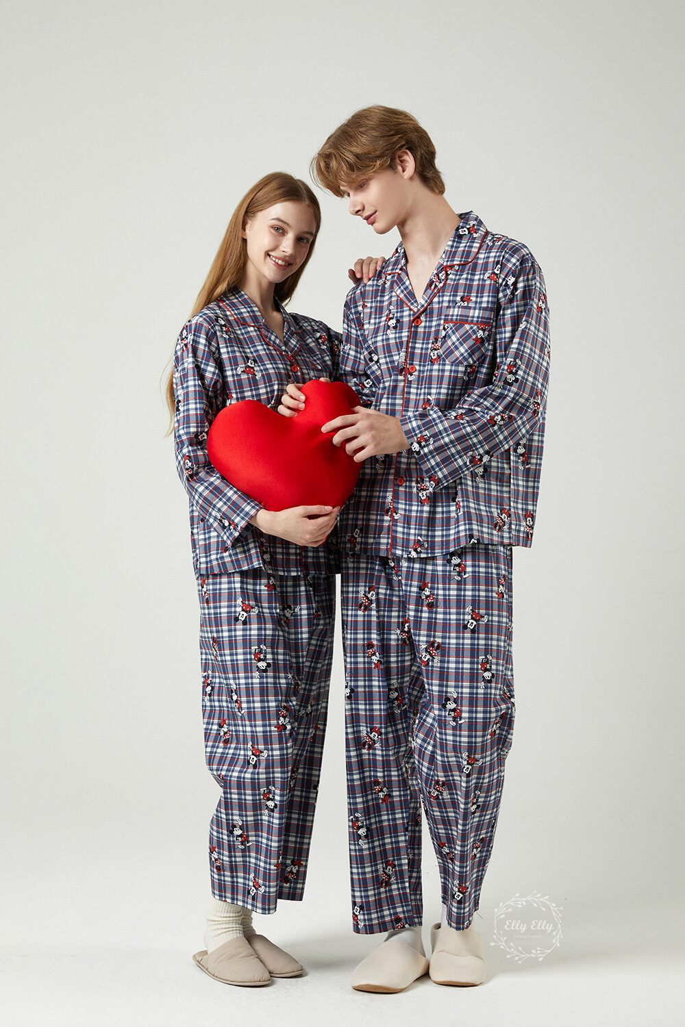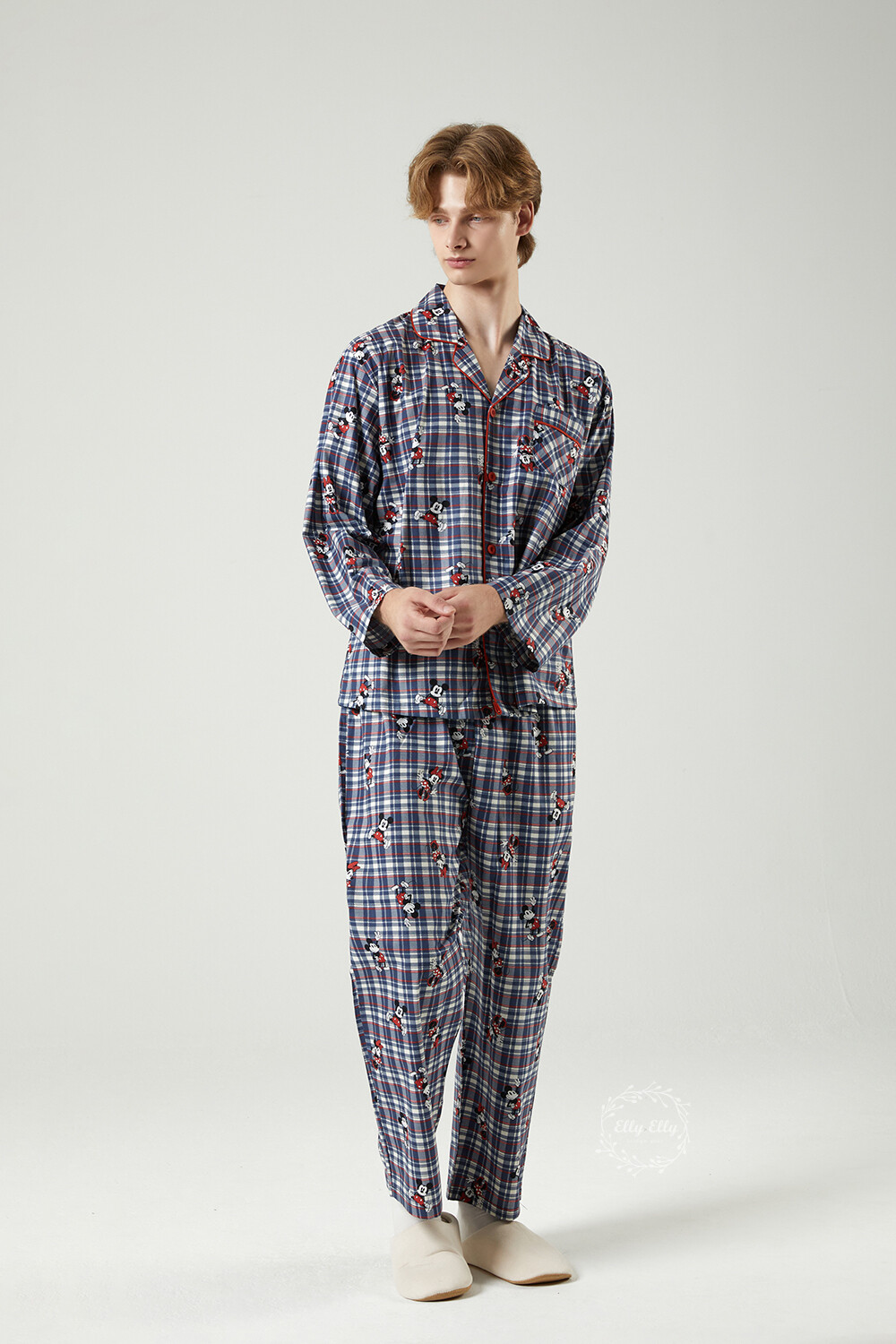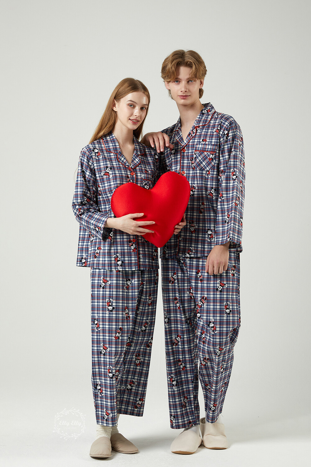 DK-5324 디즈니정품 미키마우스 체크무늬 남여커플 와이카라 잠옷세트 긴팔투피스