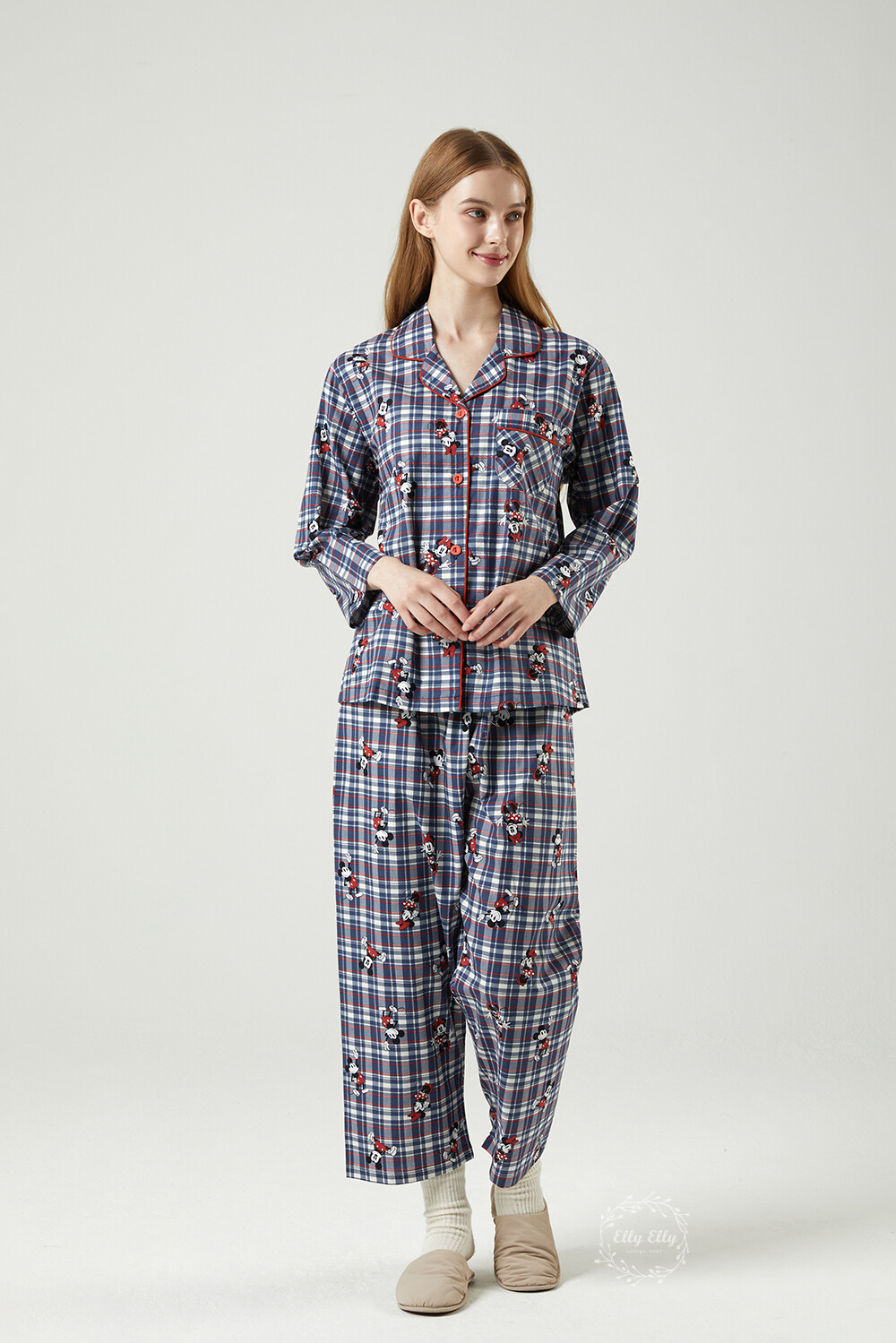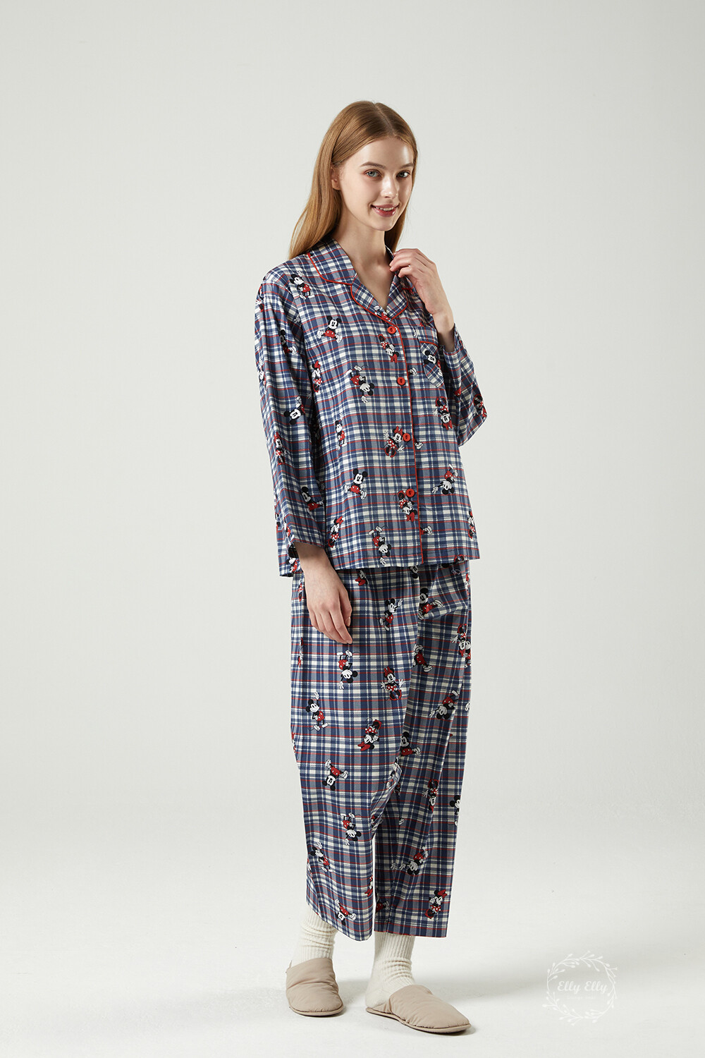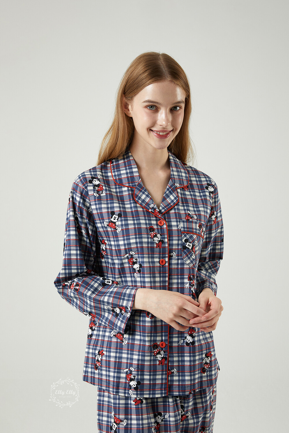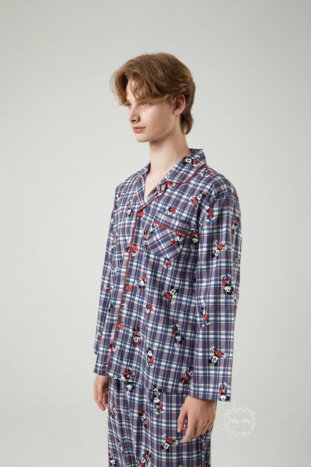 DK-5324 디즈니정품 미키마우스 체크무늬 남여커플 와이카라 잠옷세트 긴팔투피스