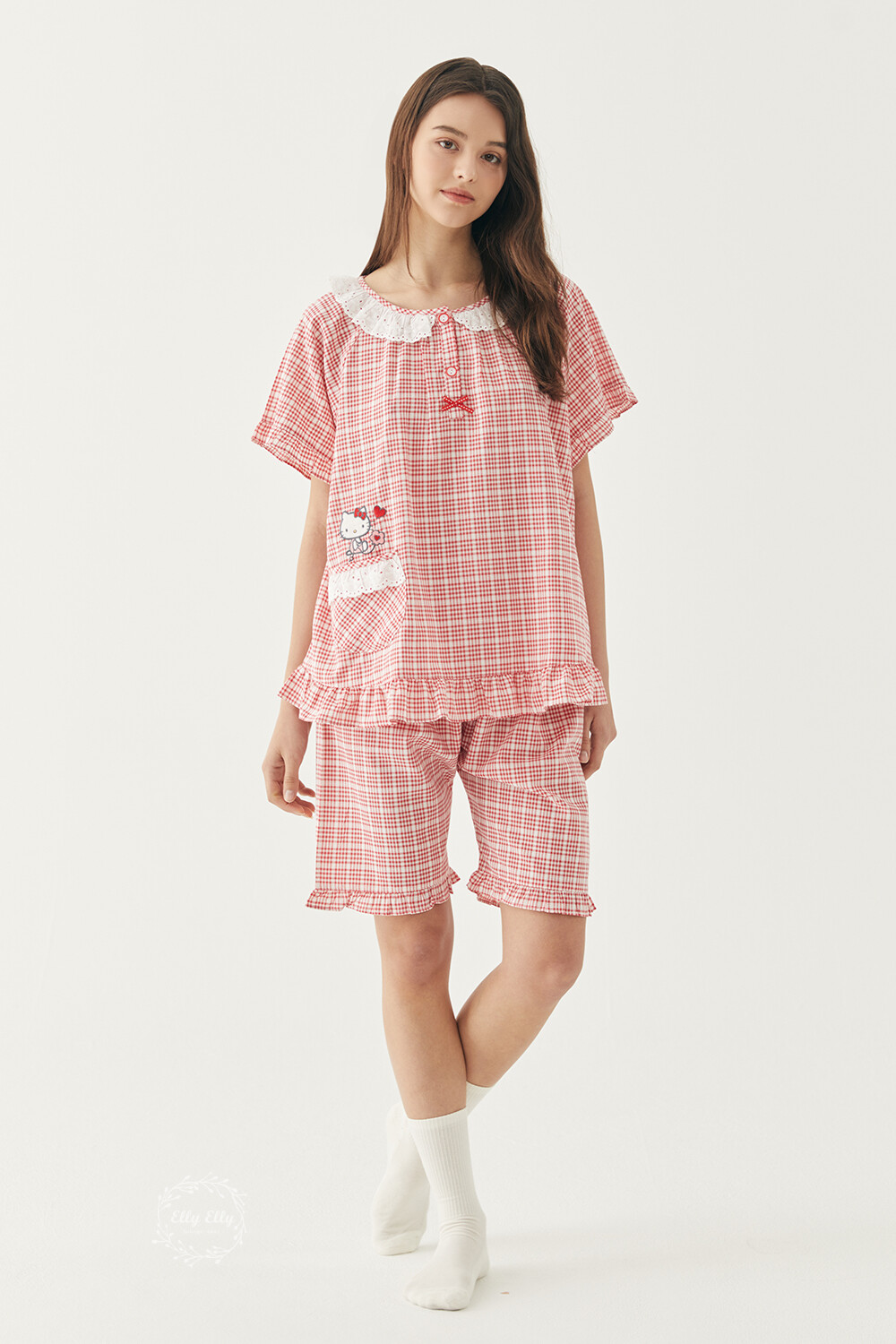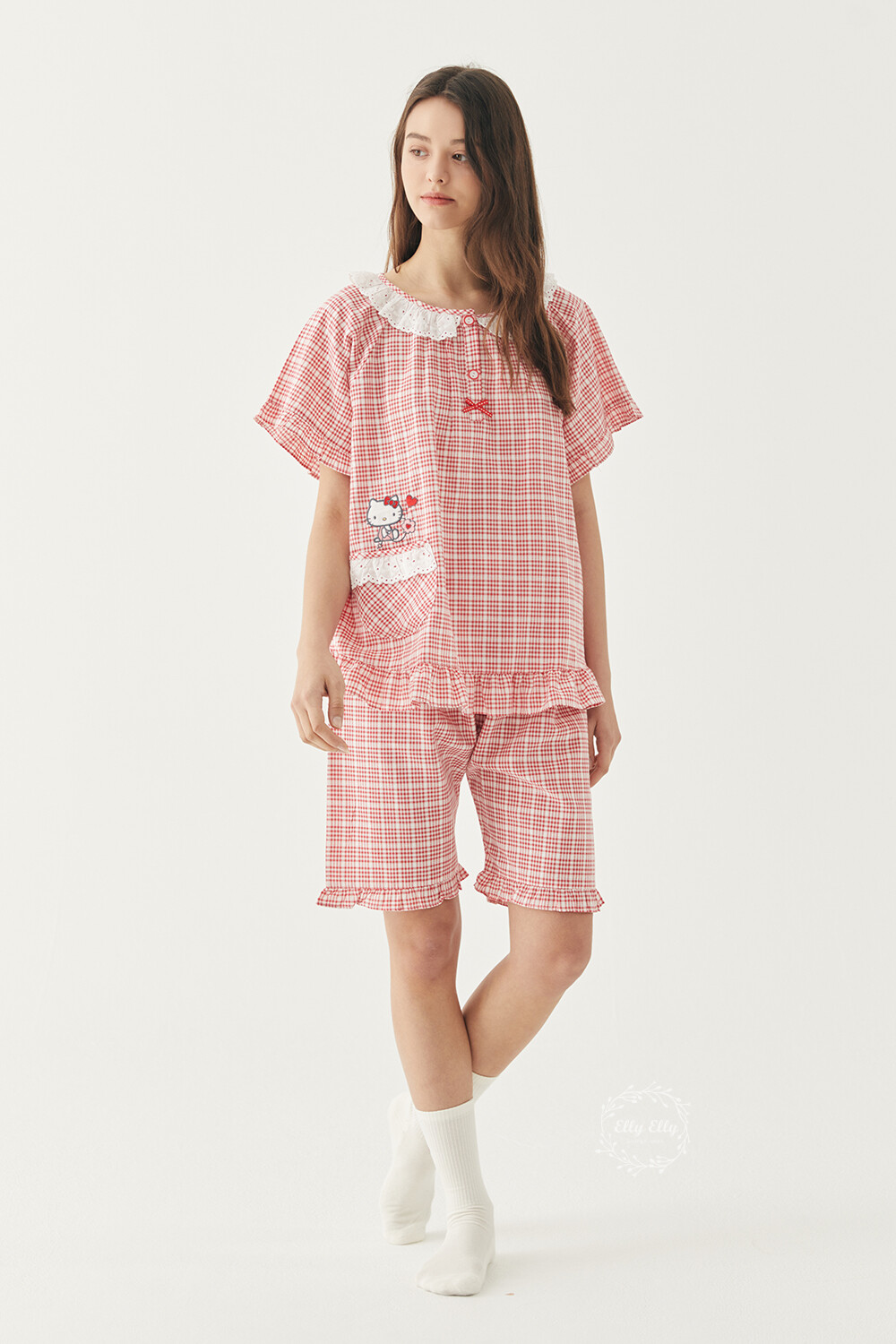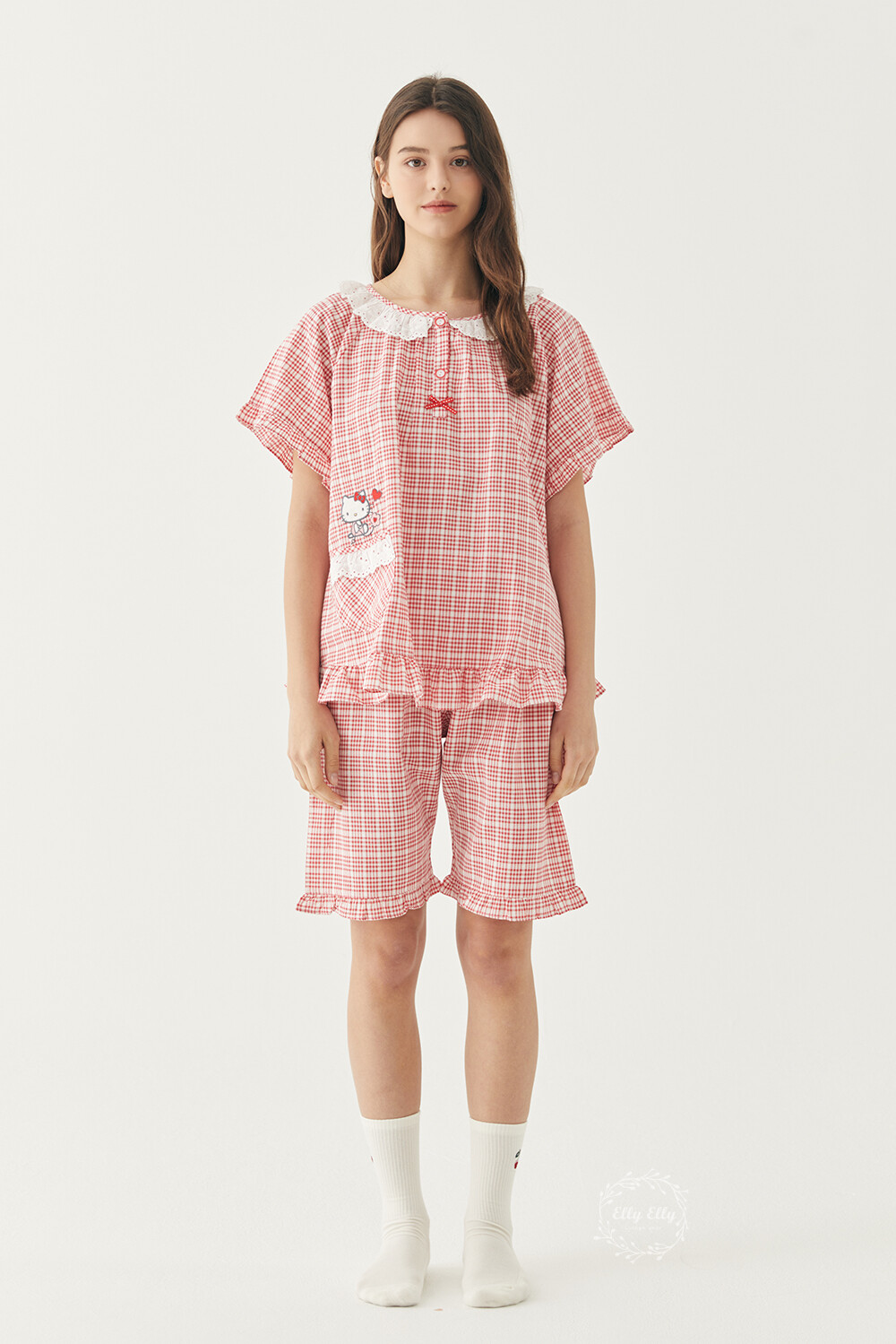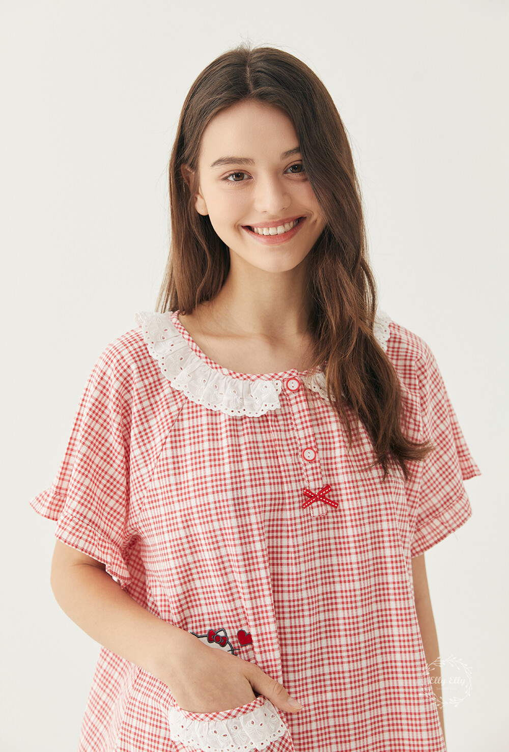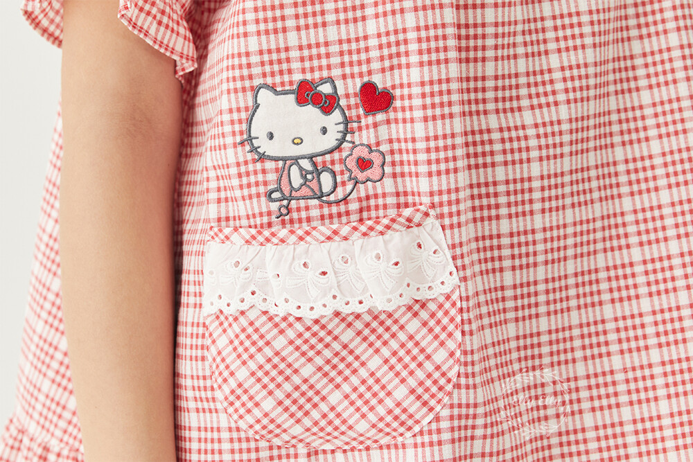 HK-4204 자수키티 레이스체크 여성 반팔투피스 레드