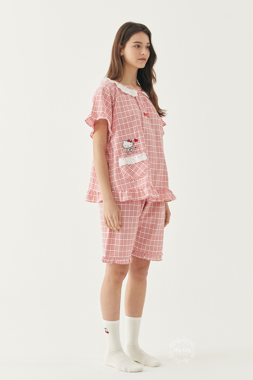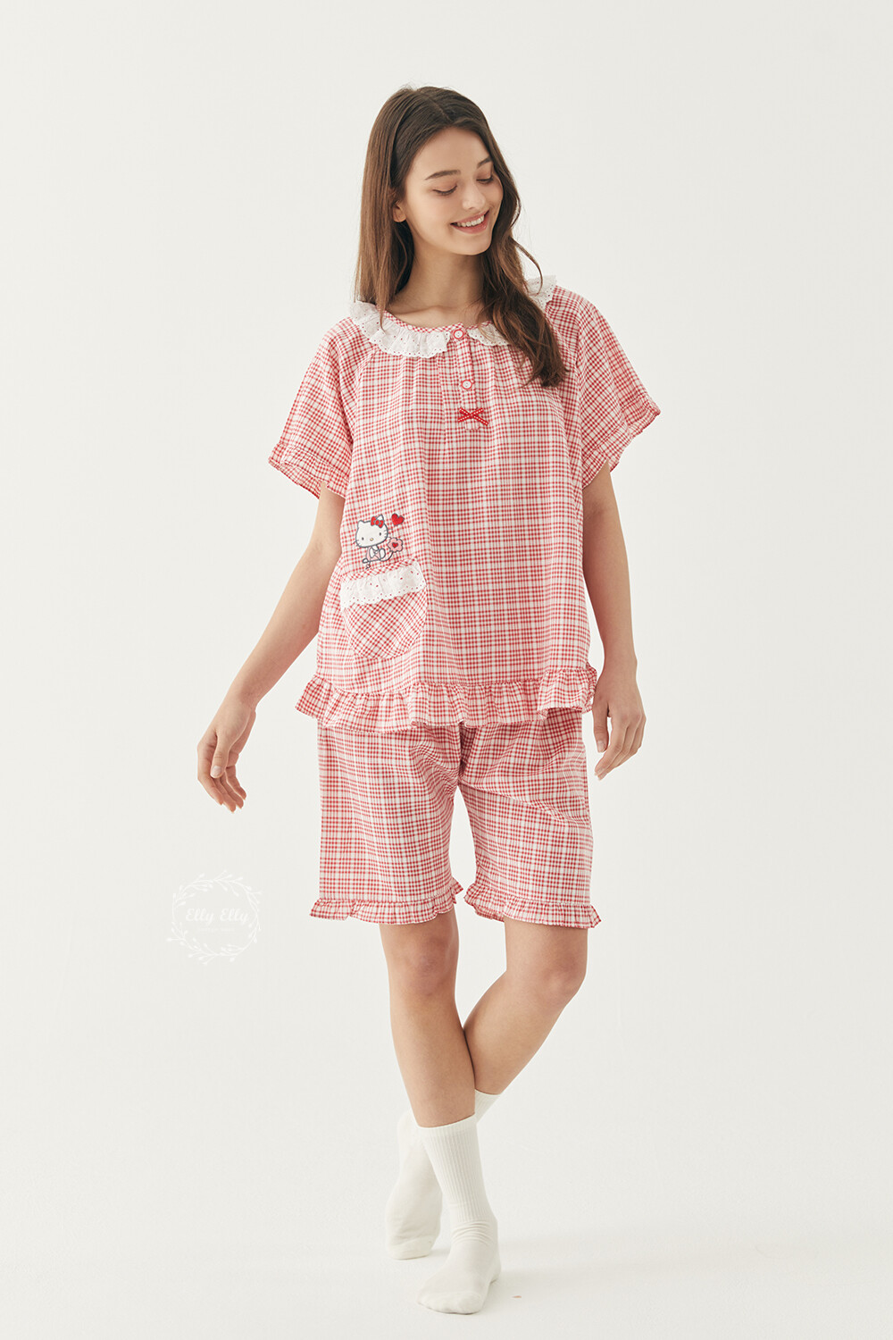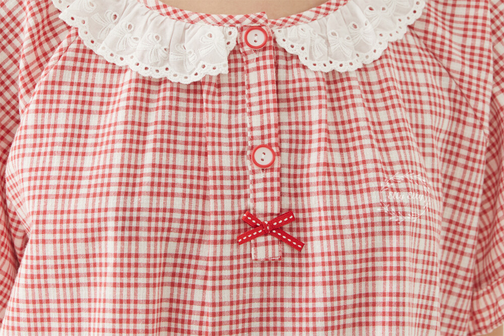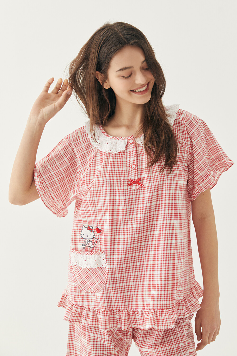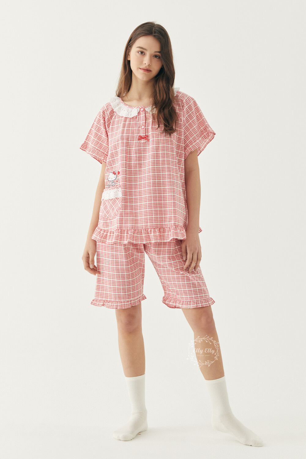 HK-4204 자수키티 레이스체크 여성 반팔투피스 레드