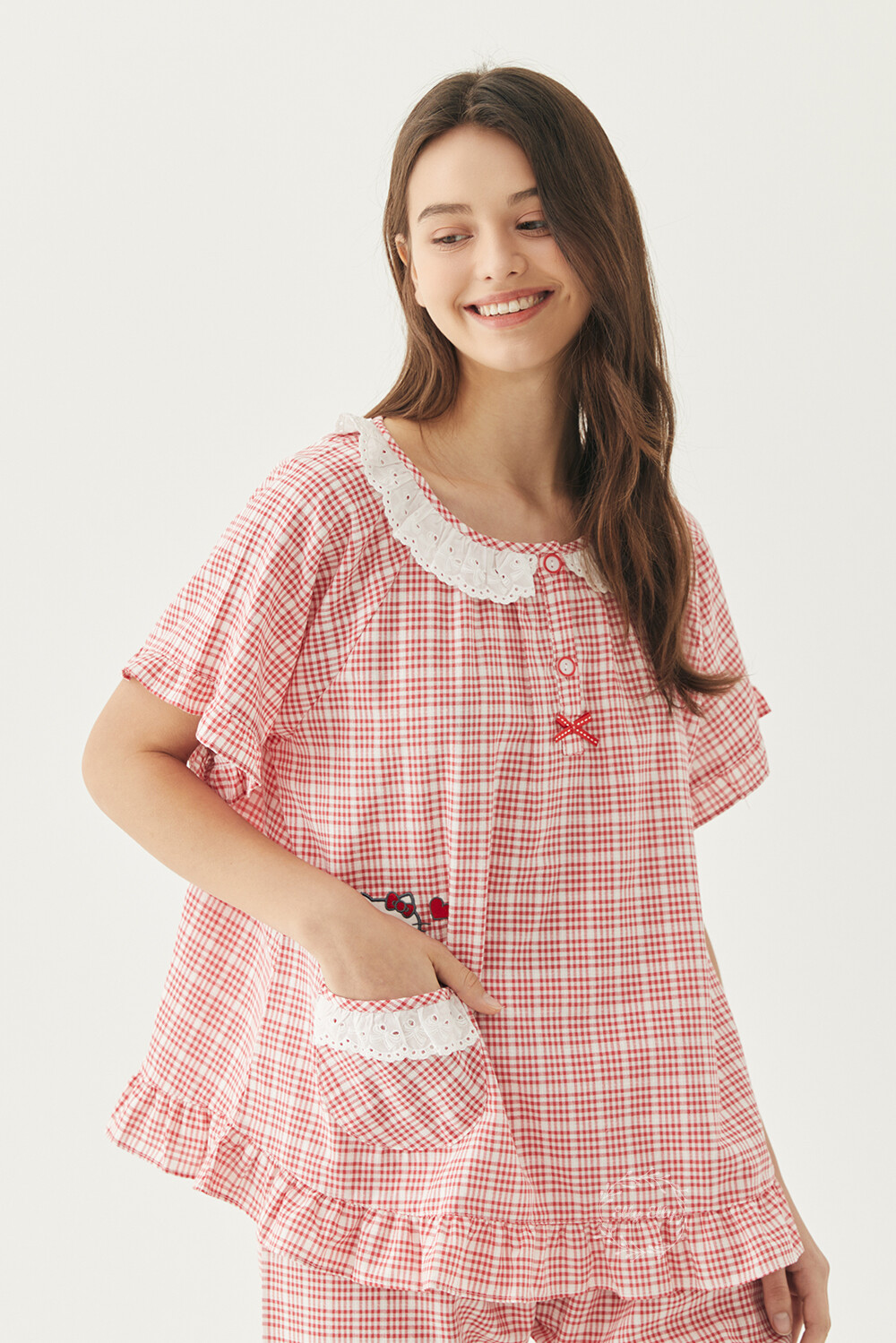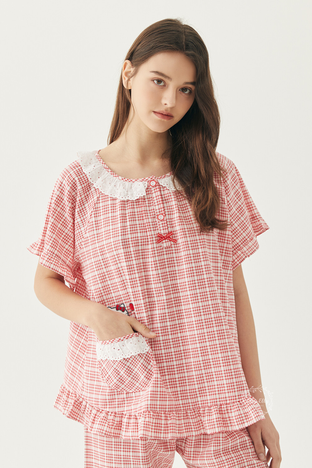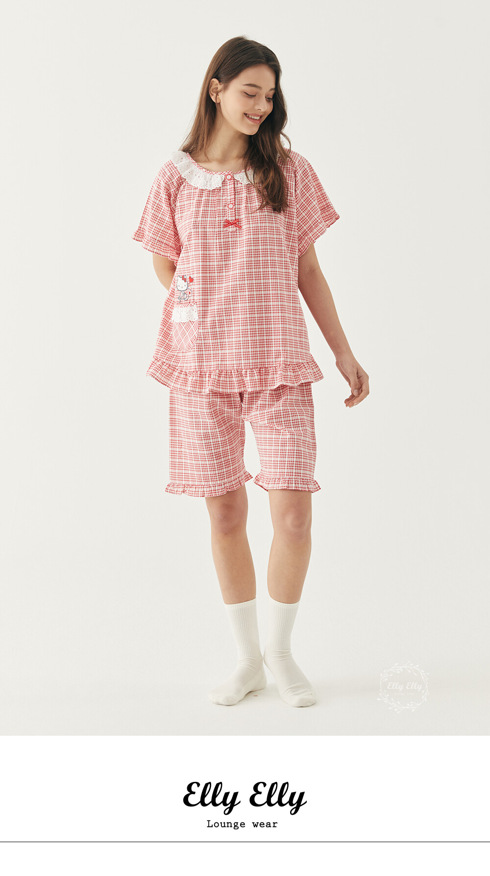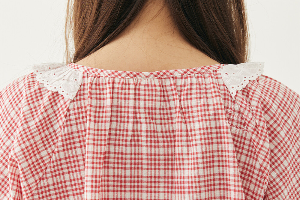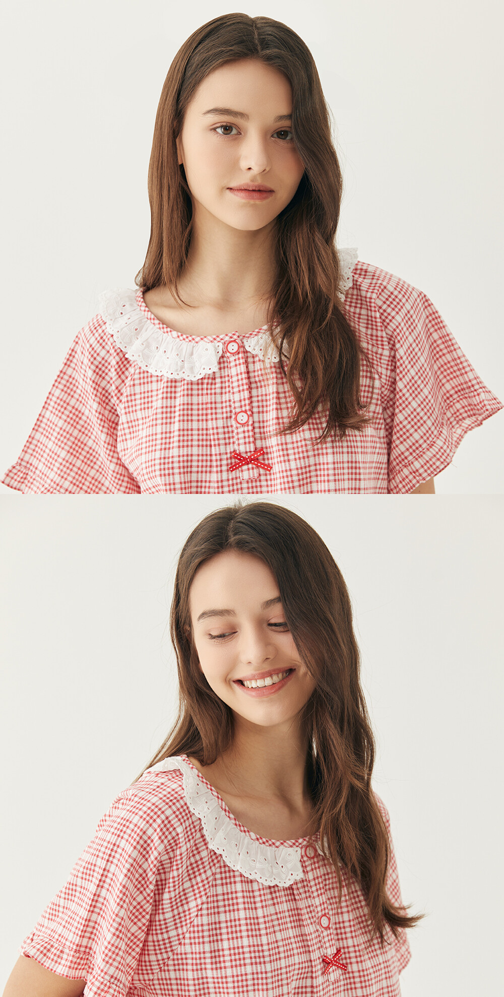 HK-4204 자수키티 레이스체크 여성 반팔투피스 레드
