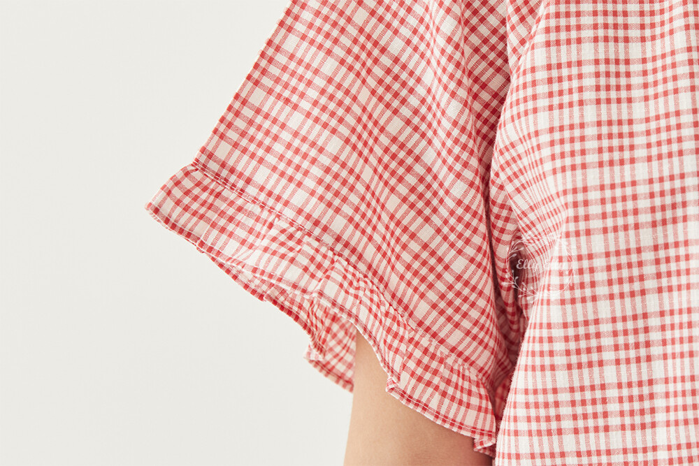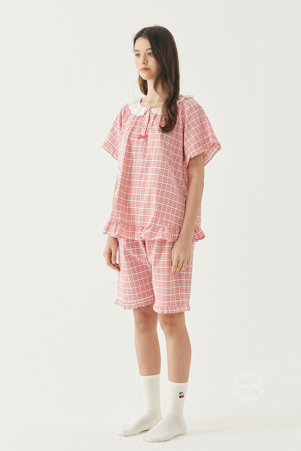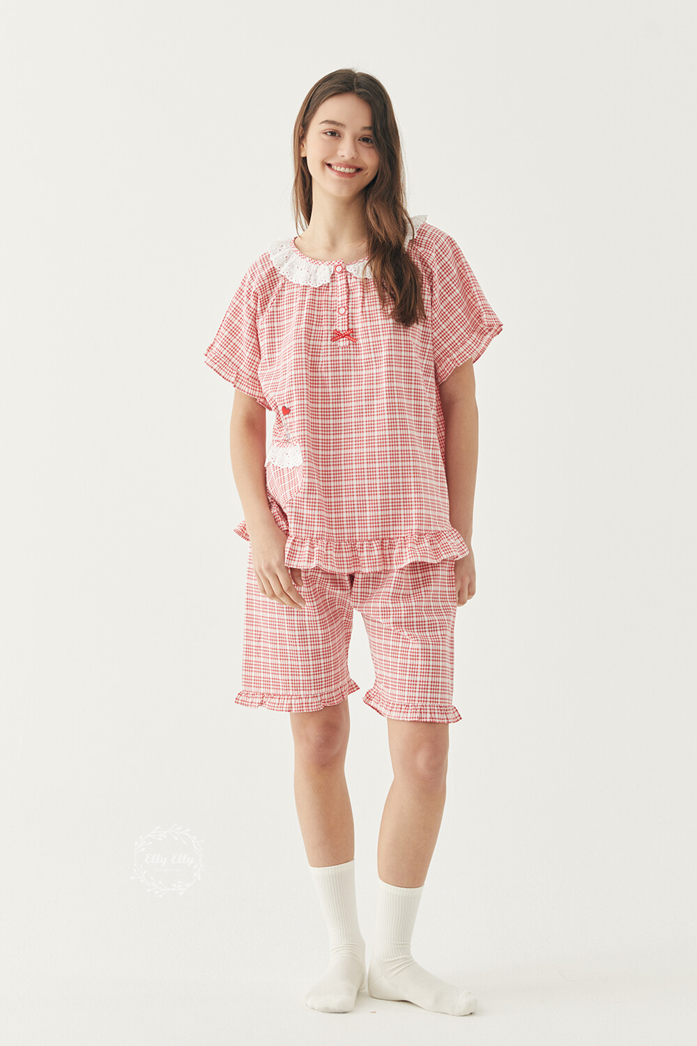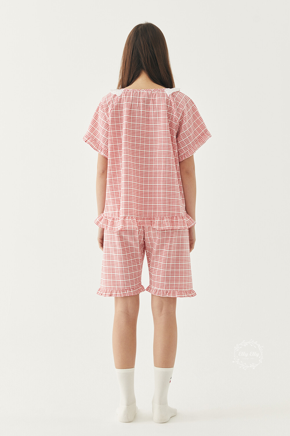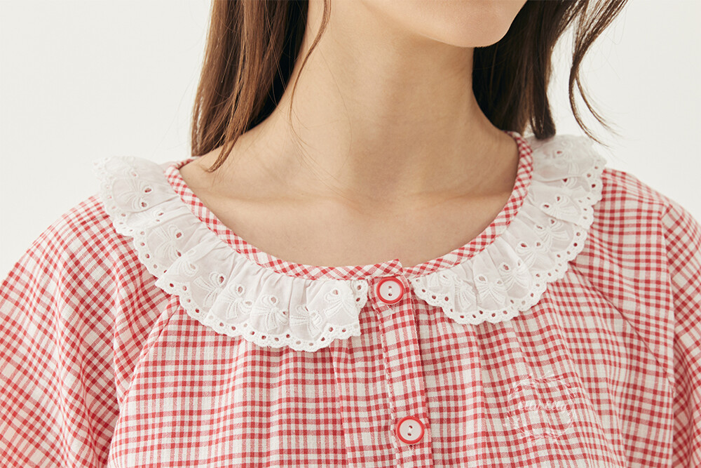 HK-4204 자수키티 레이스체크 여성 반팔투피스 레드