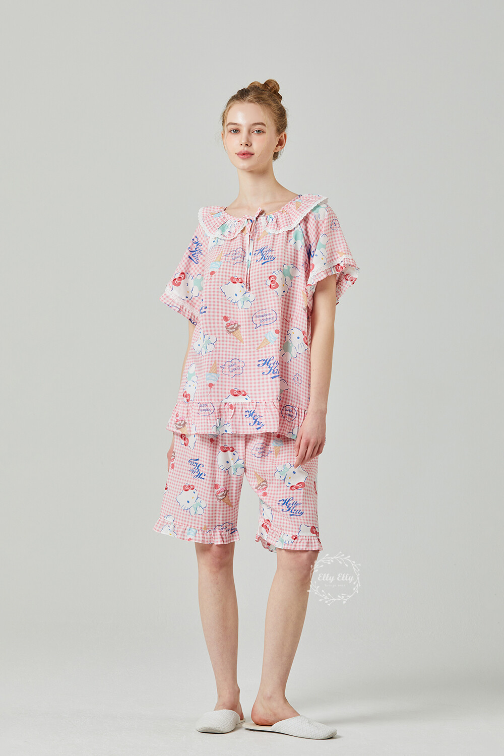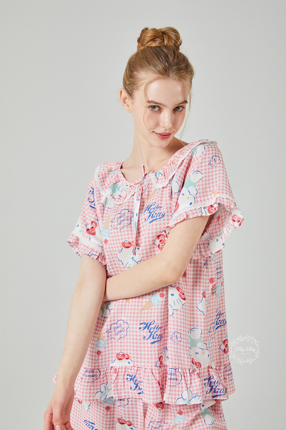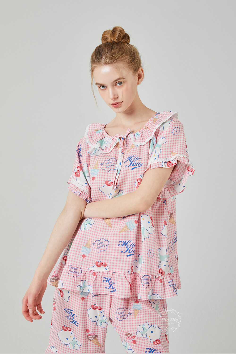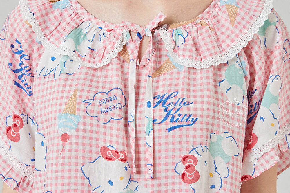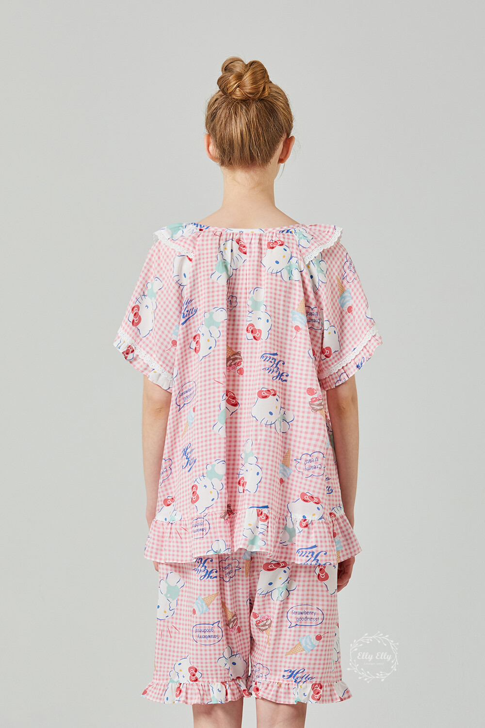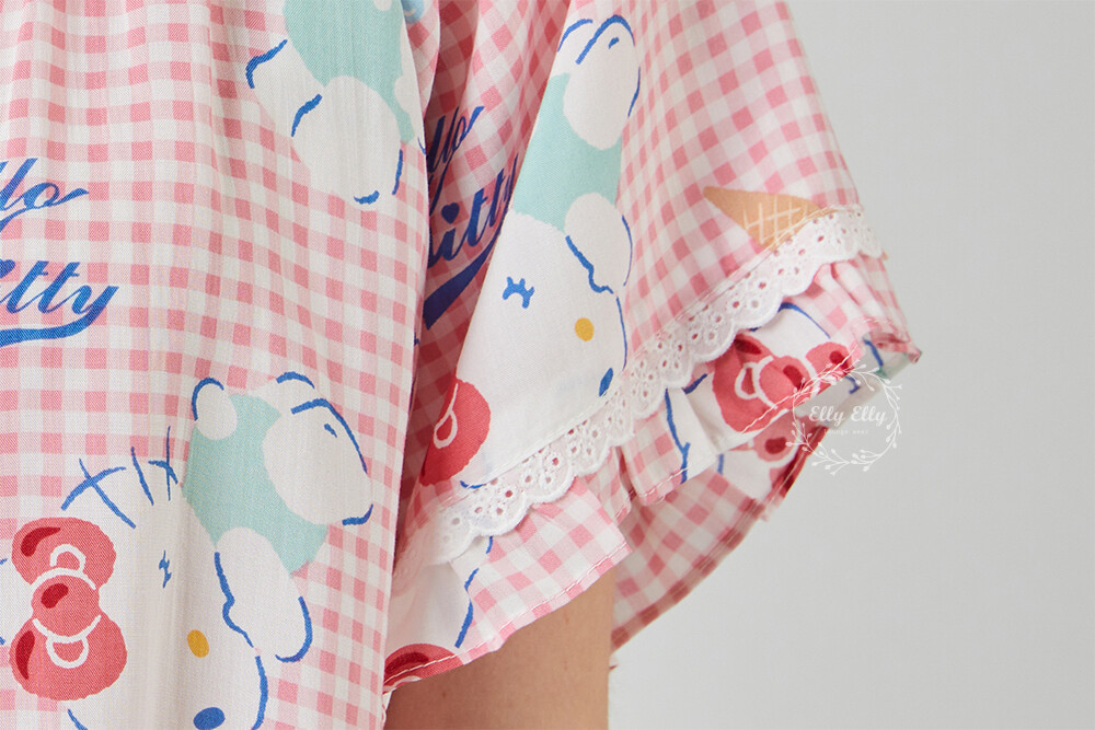 HK-4514 산리오정품 헬로키티 레이스프릴 체크 반팔상하