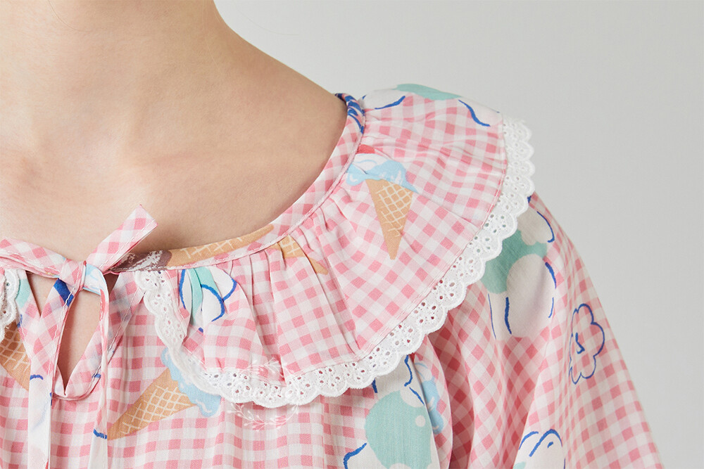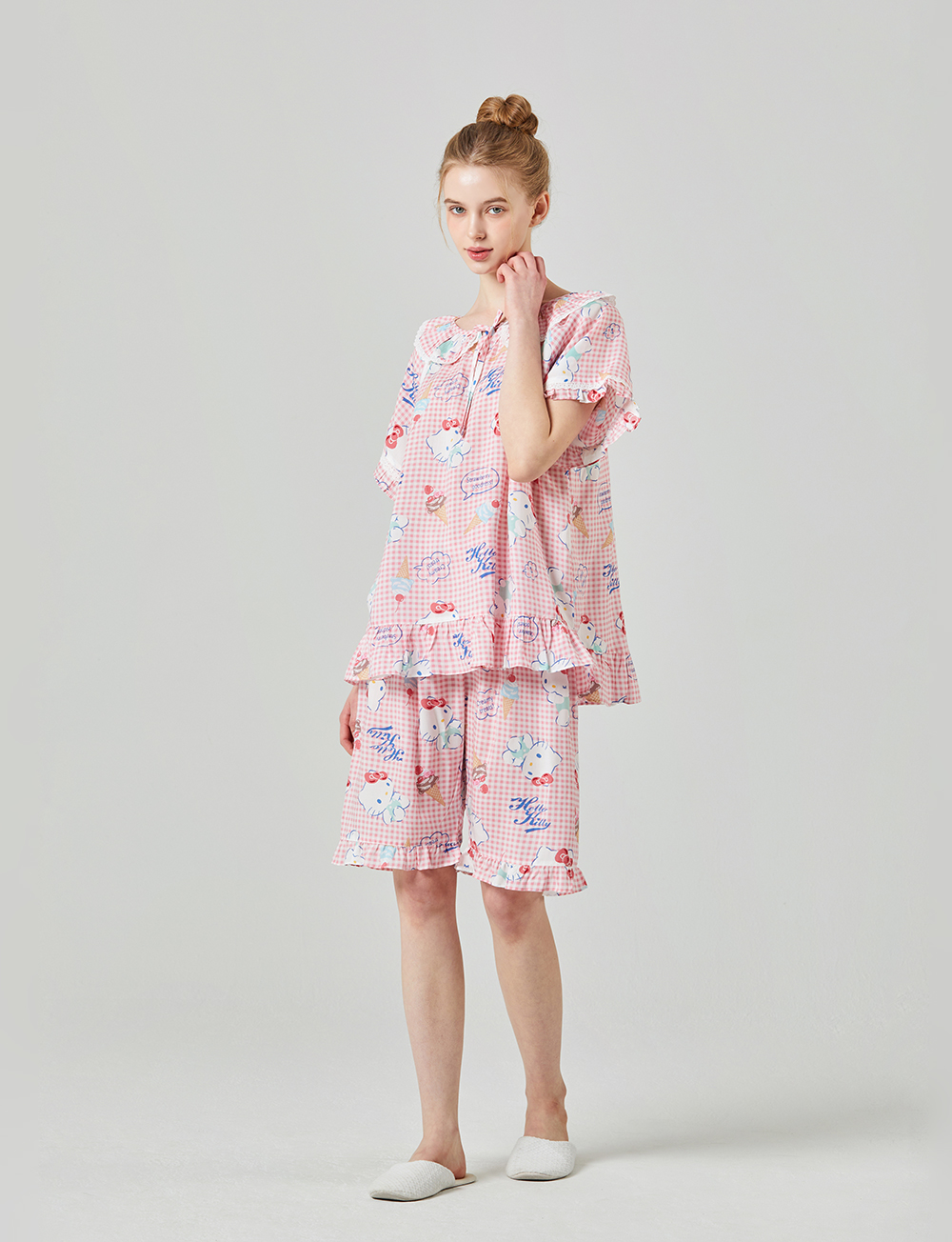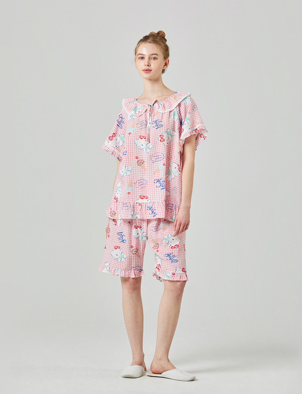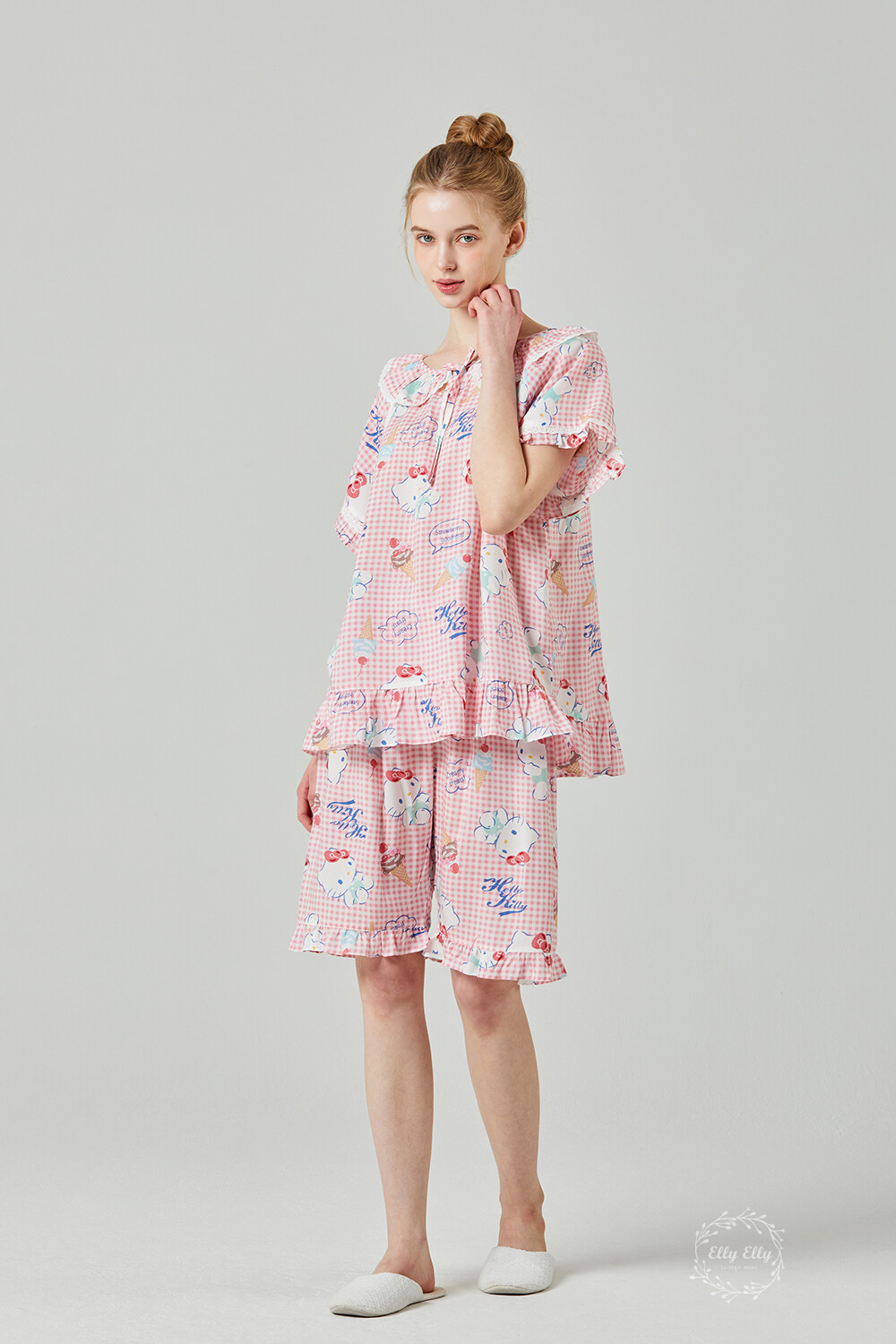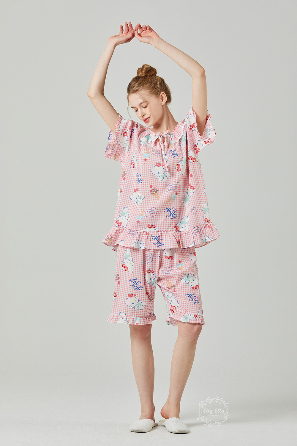 HK-4514 산리오정품 헬로키티 레이스프릴 체크 반팔상하