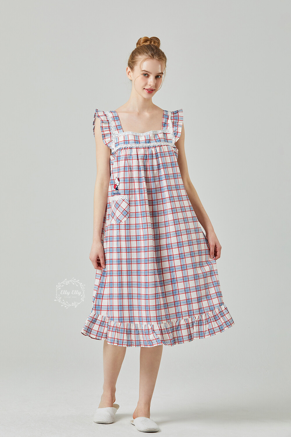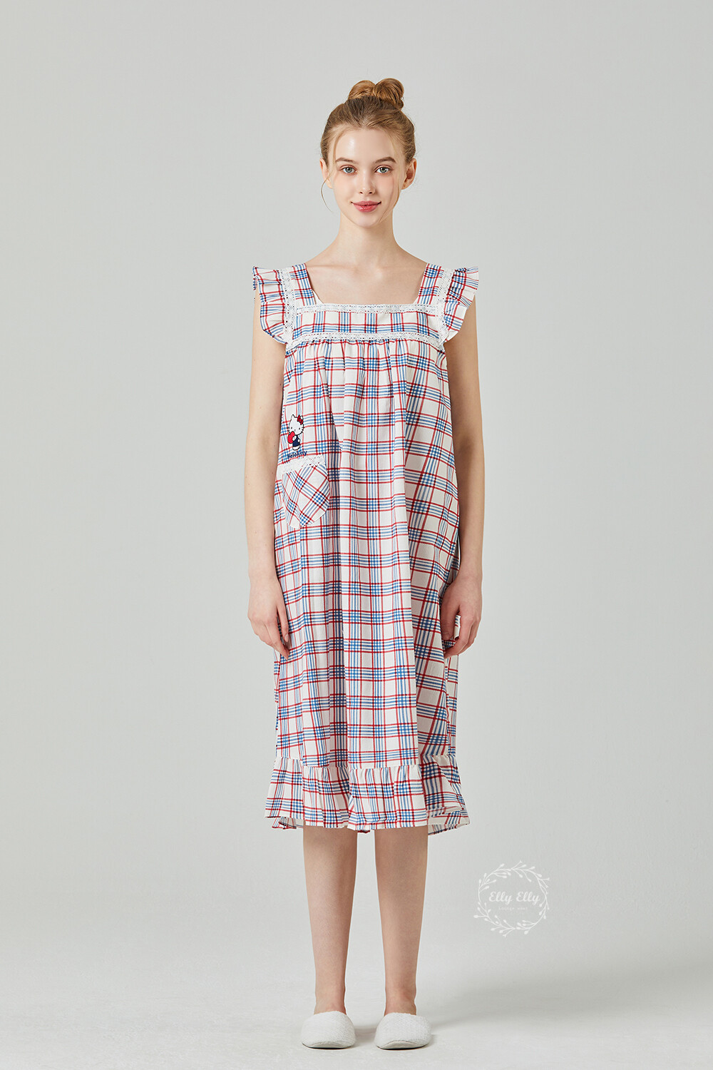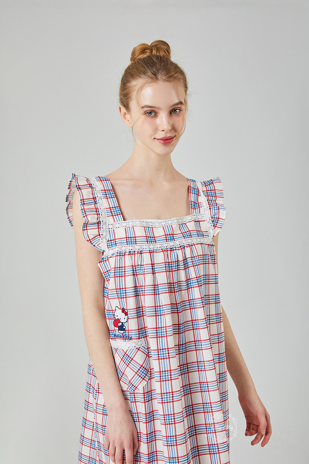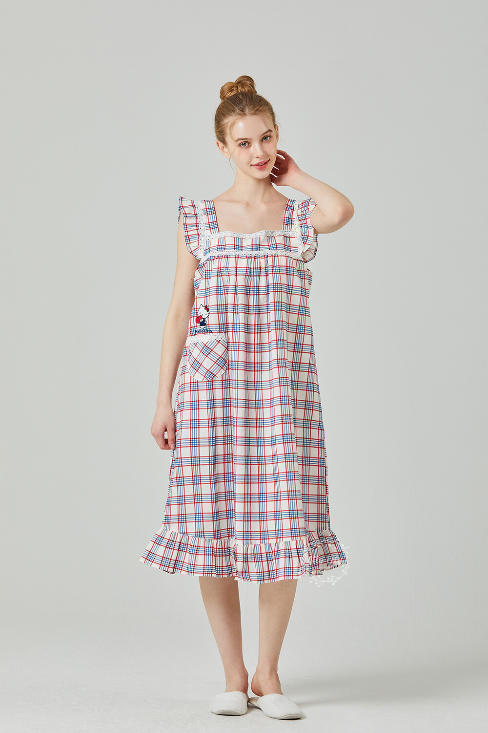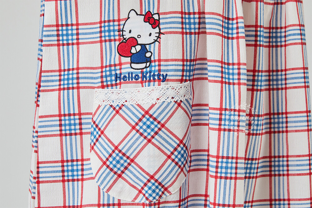 HK-4525 산리오정품 헬로키티 레이스체크 자수 여성 끈 원피스