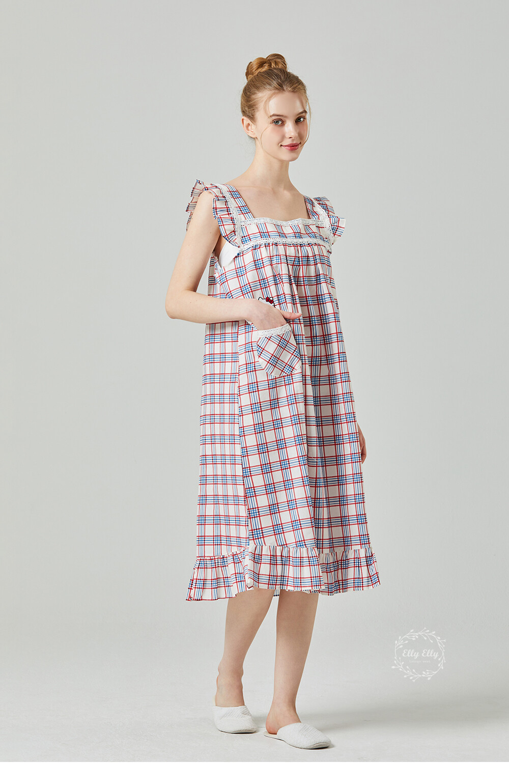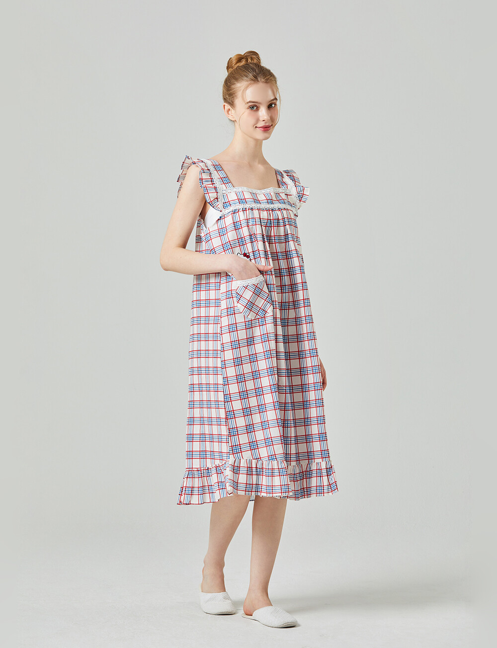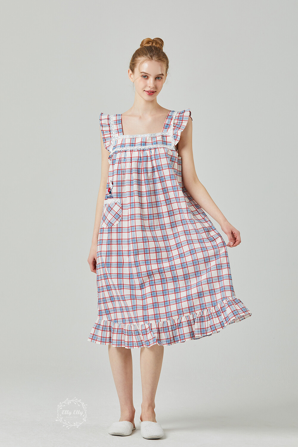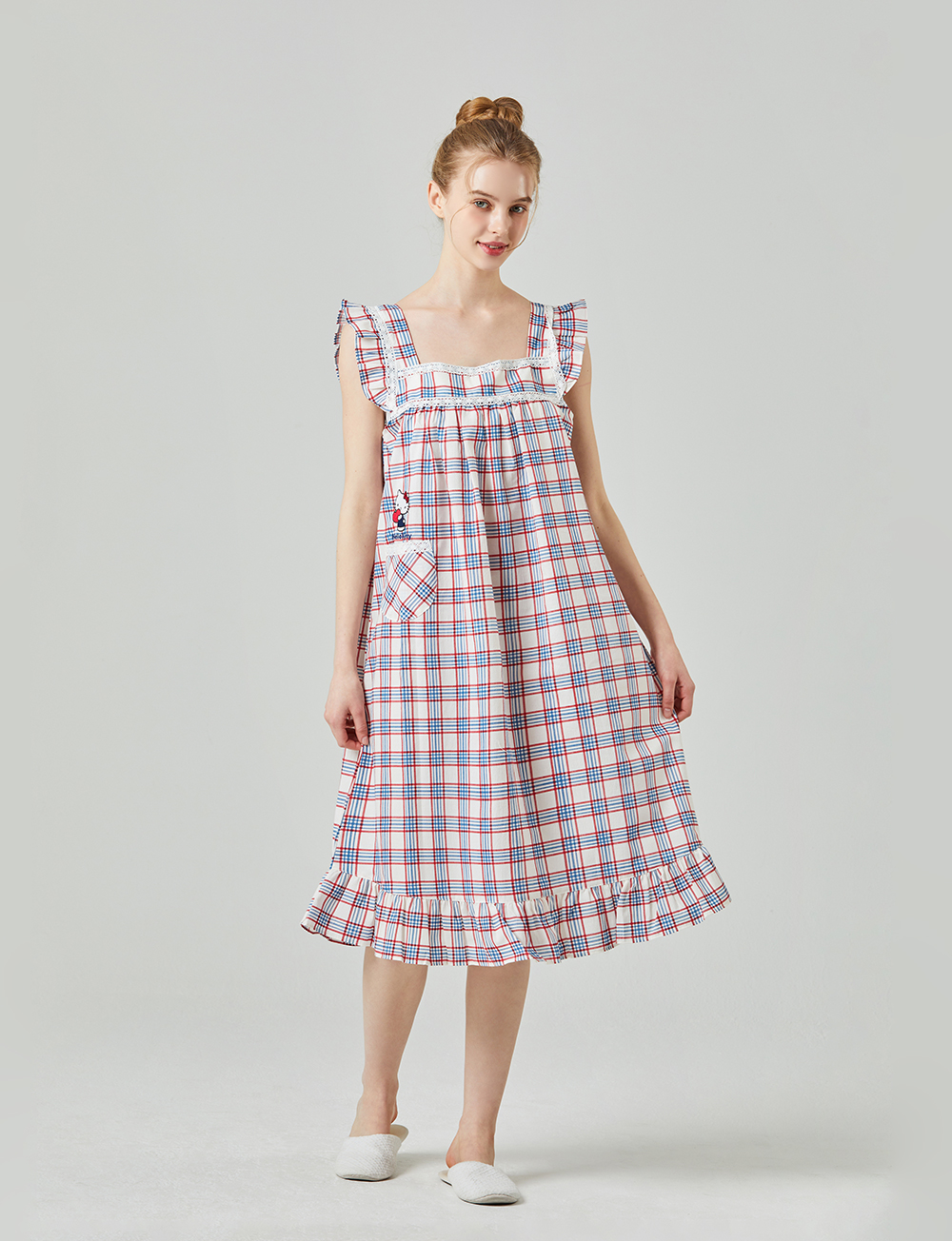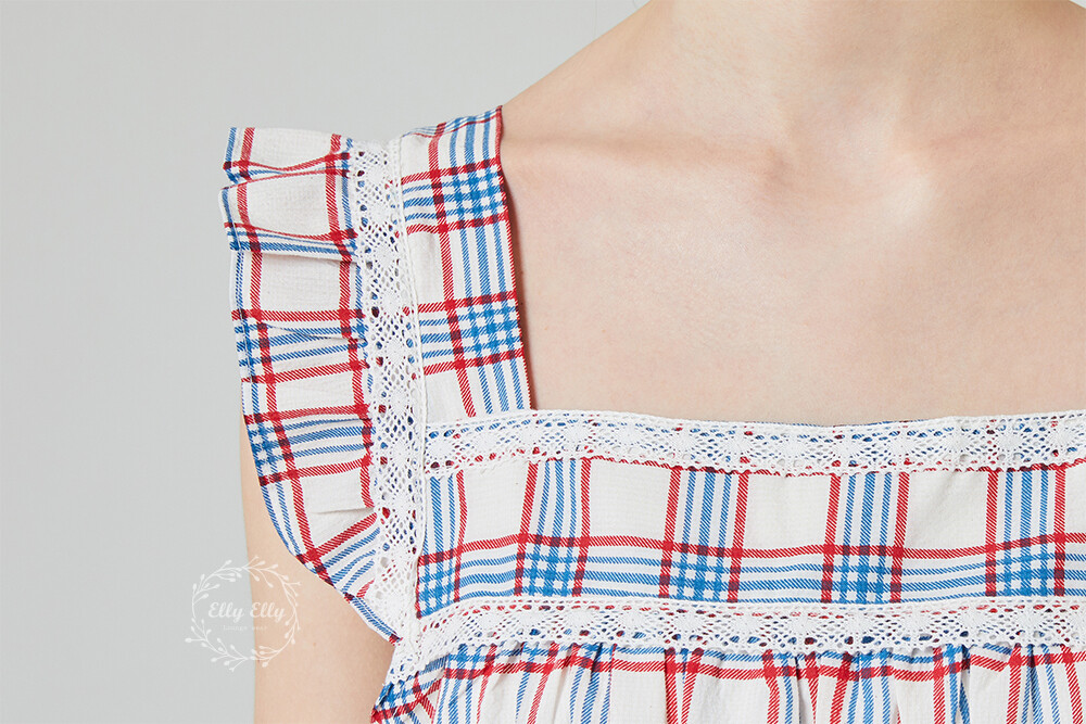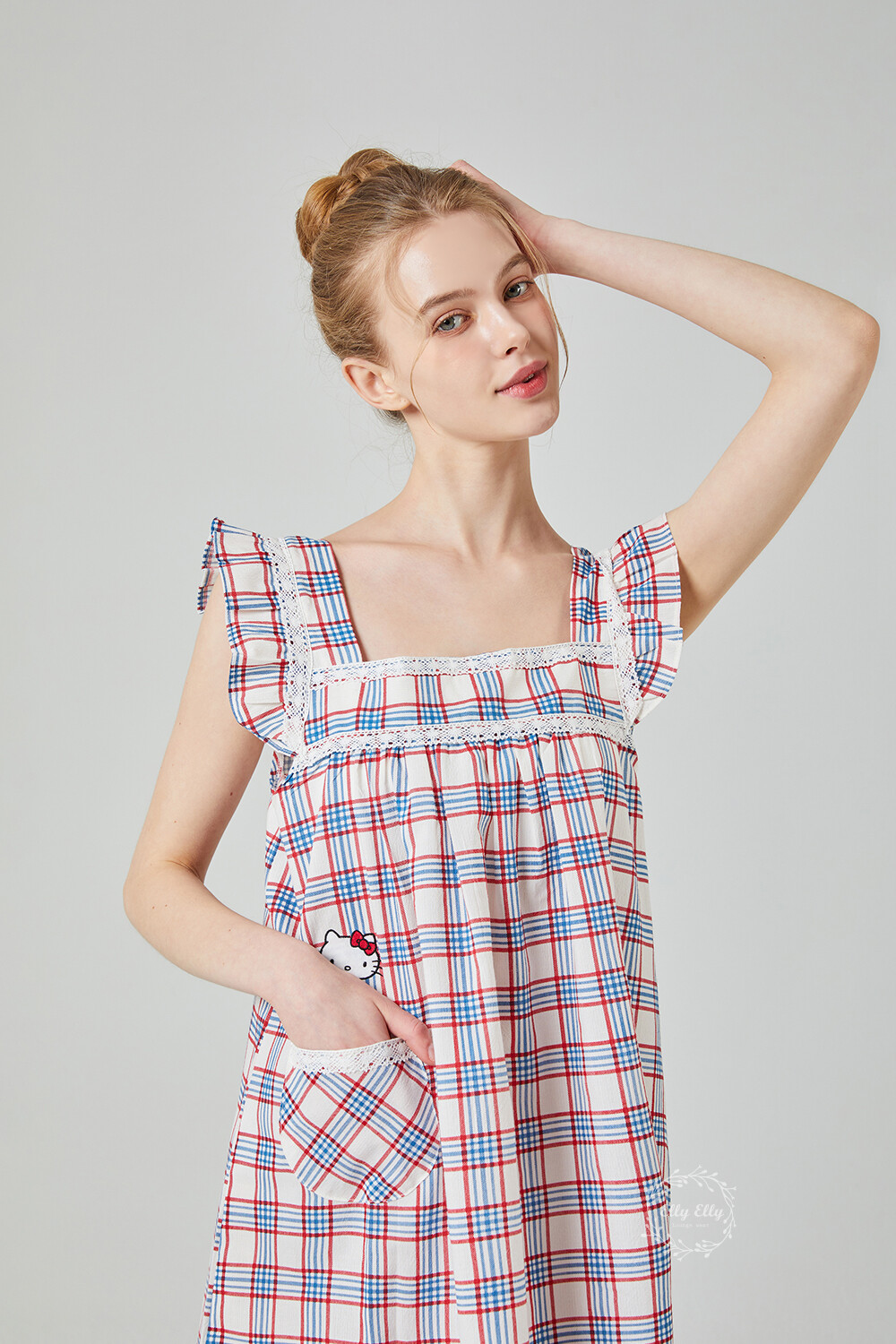 HK-4525 산리오정품 헬로키티 레이스체크 자수 여성 끈 원피스