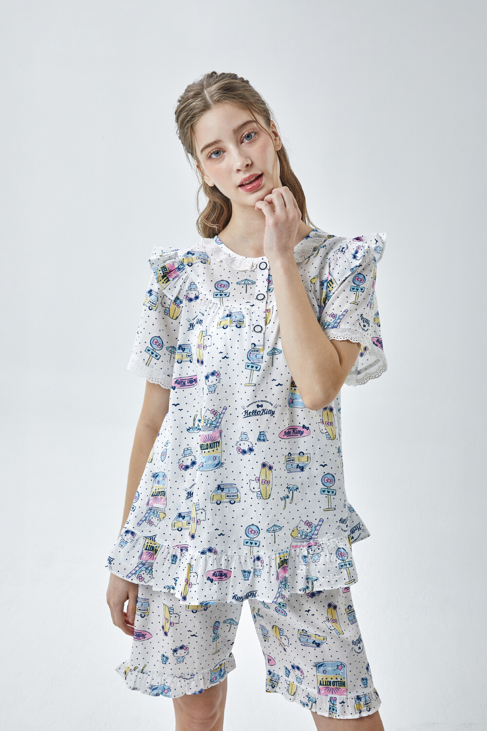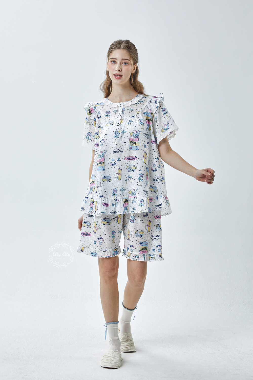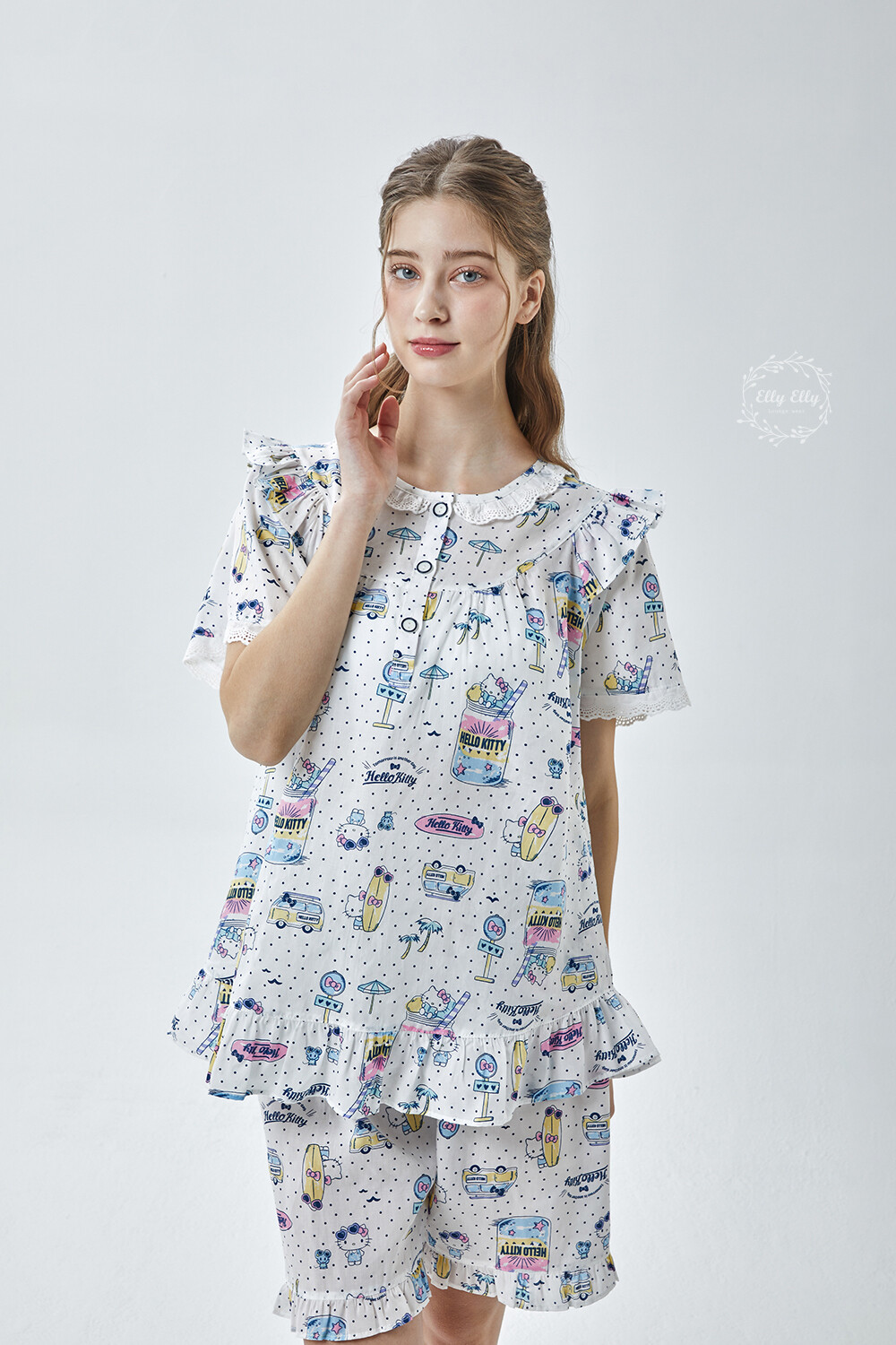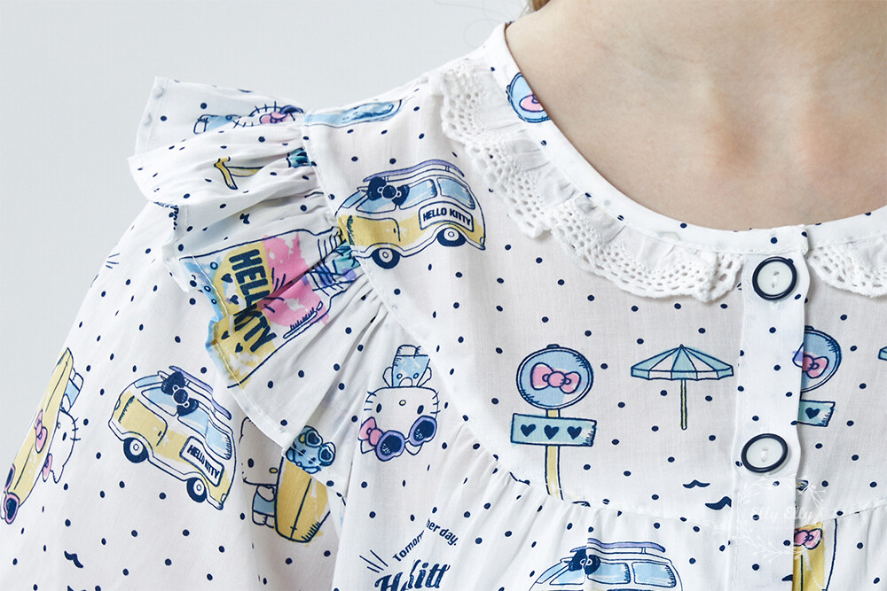 HK-4611 산리오정품 헬로키티 도트무늬 프릴레이스 반팔상하