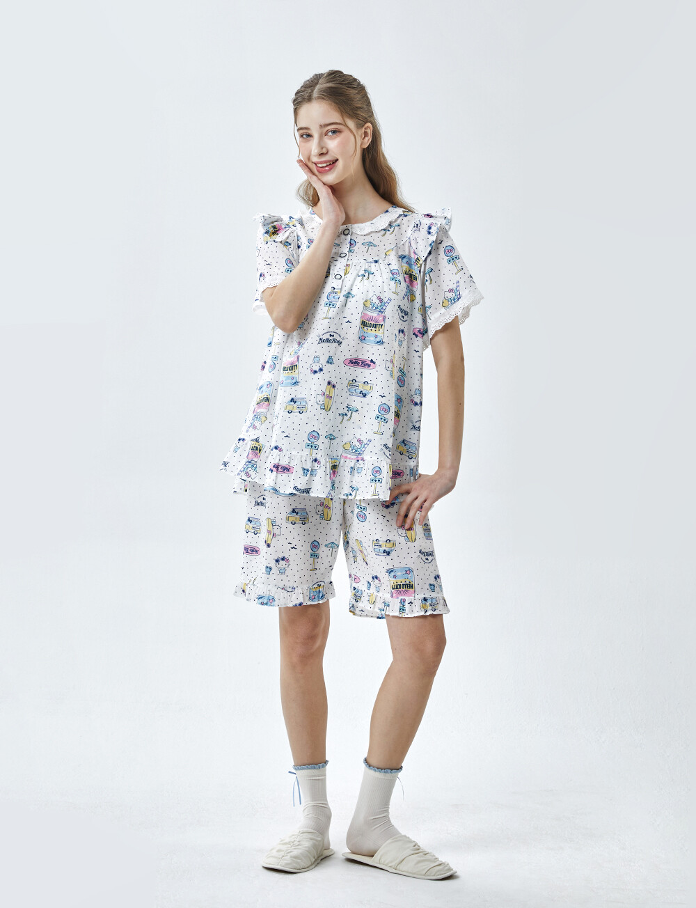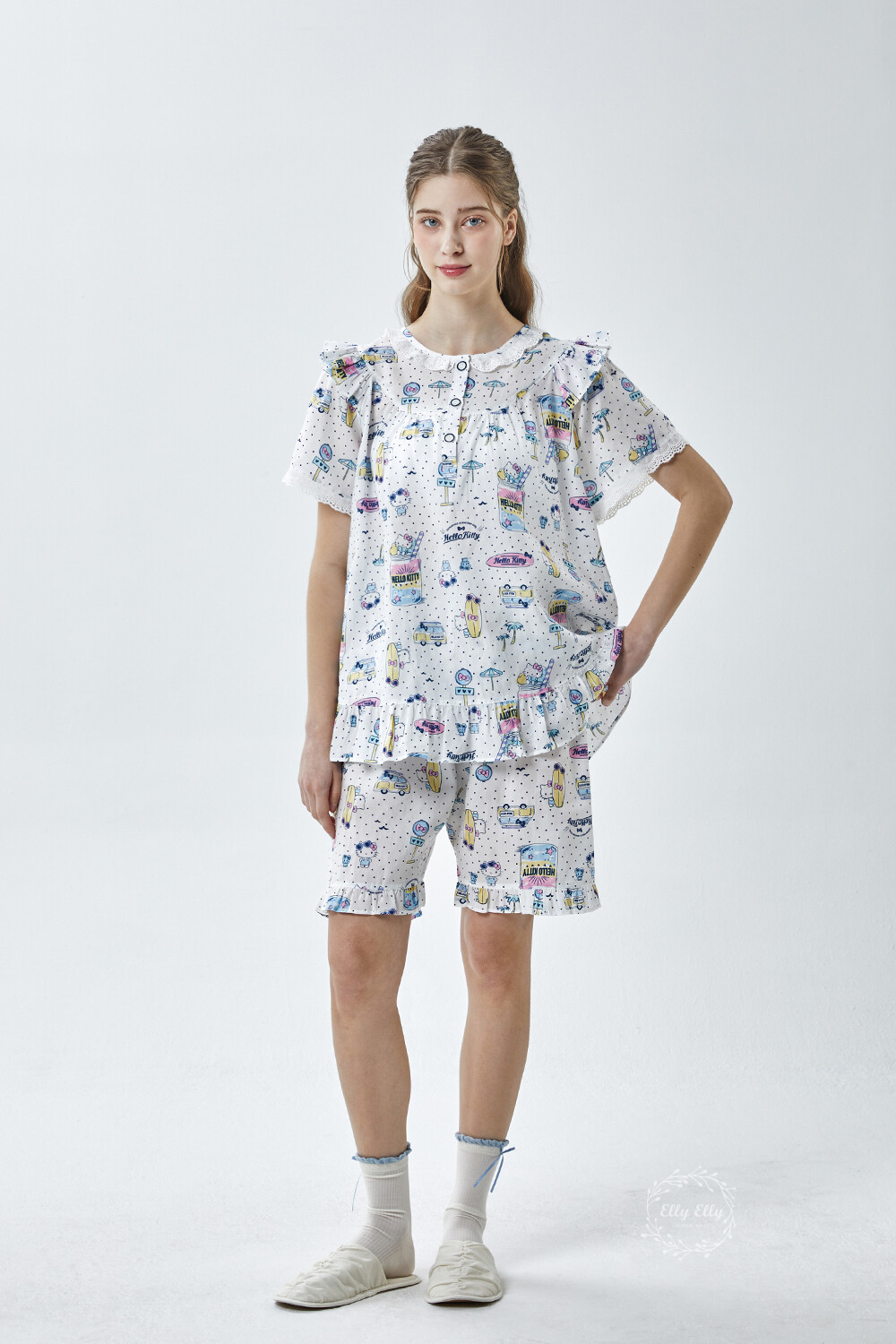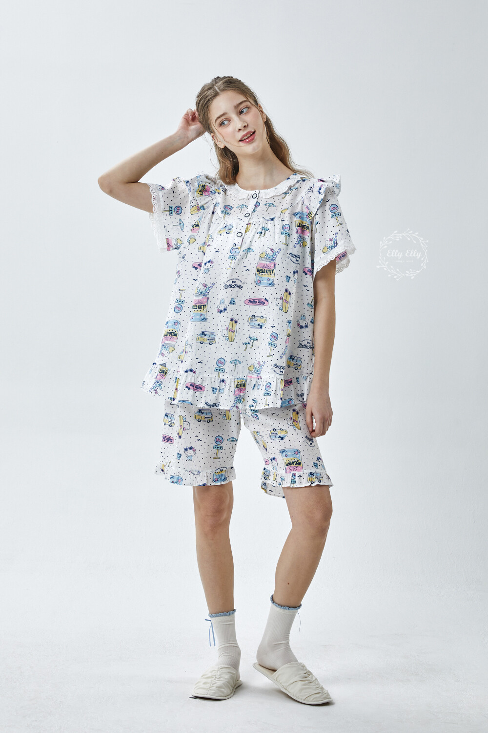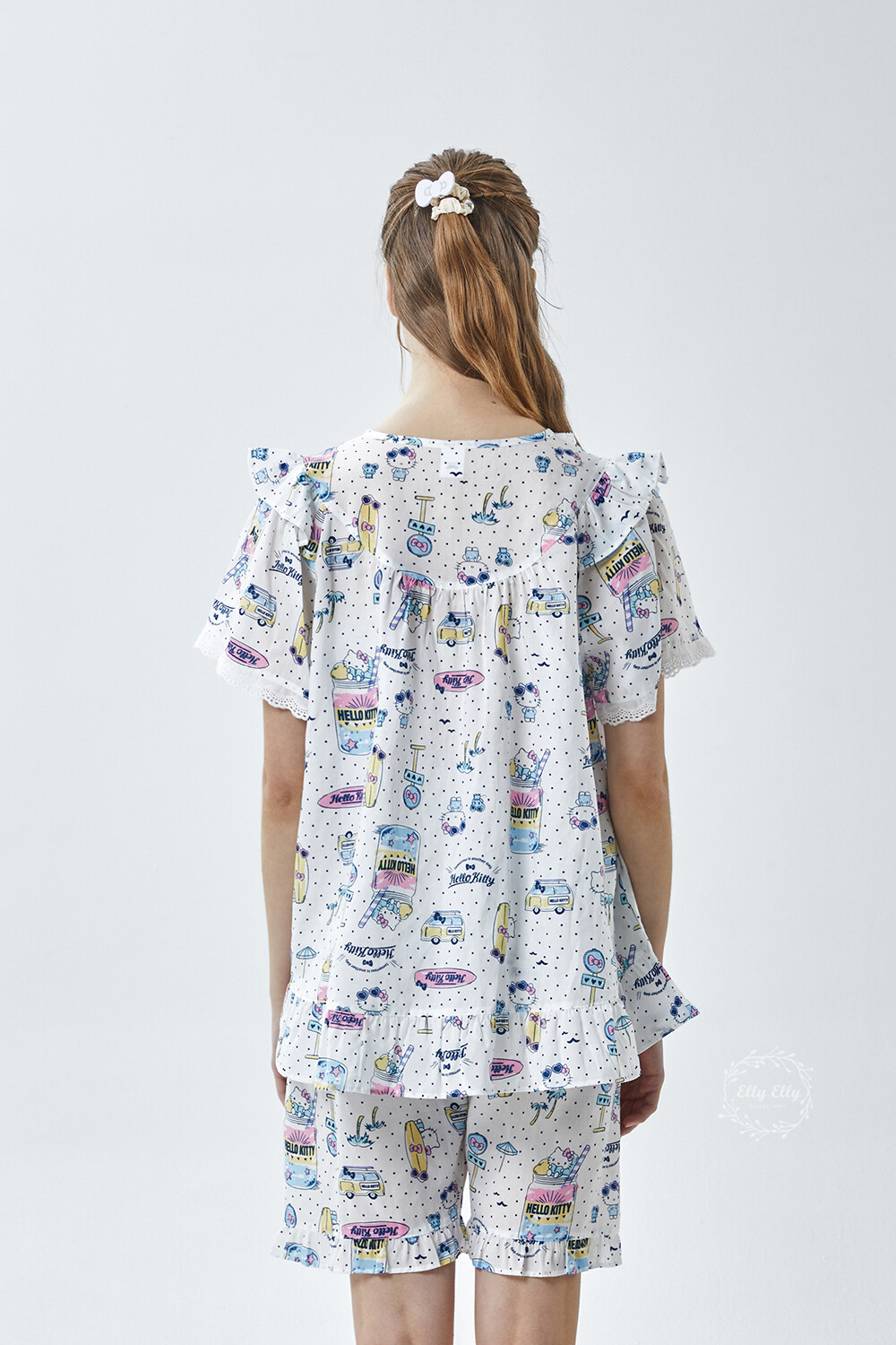 HK-4611 산리오정품 헬로키티 도트무늬 프릴레이스 반팔상하