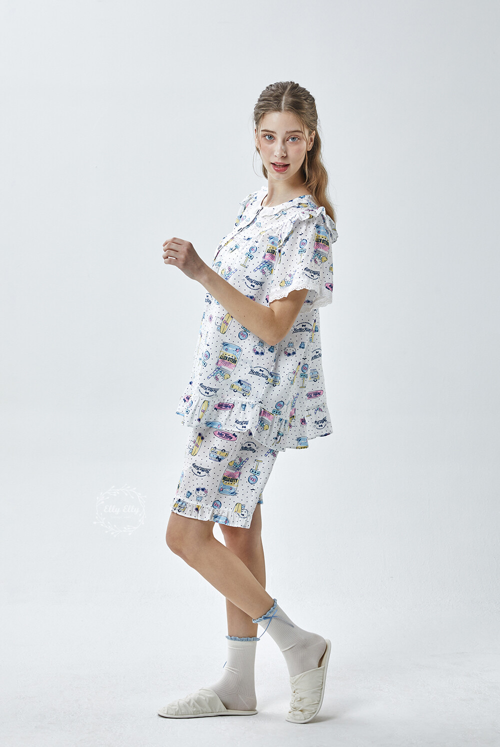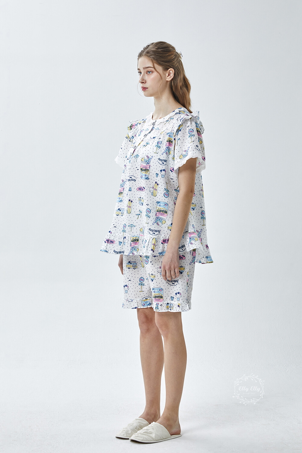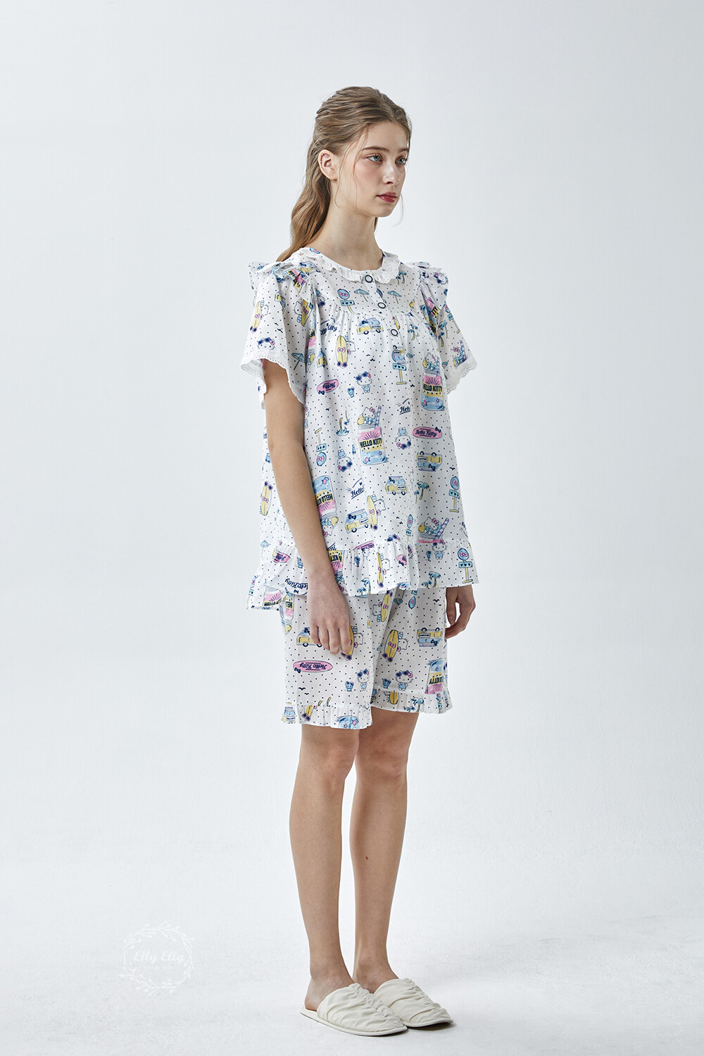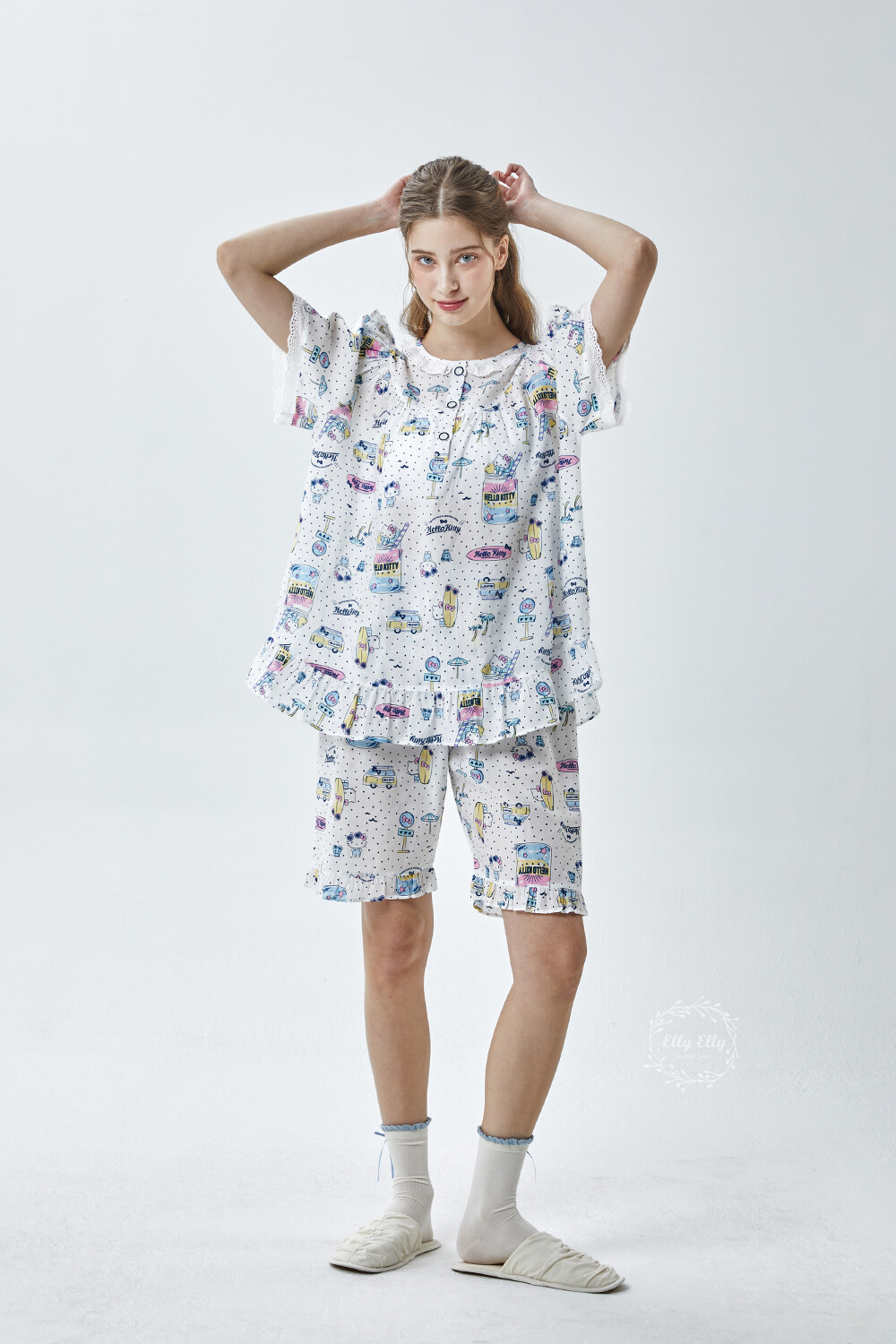 HK-4611 산리오정품 헬로키티 도트무늬 프릴레이스 반팔상하