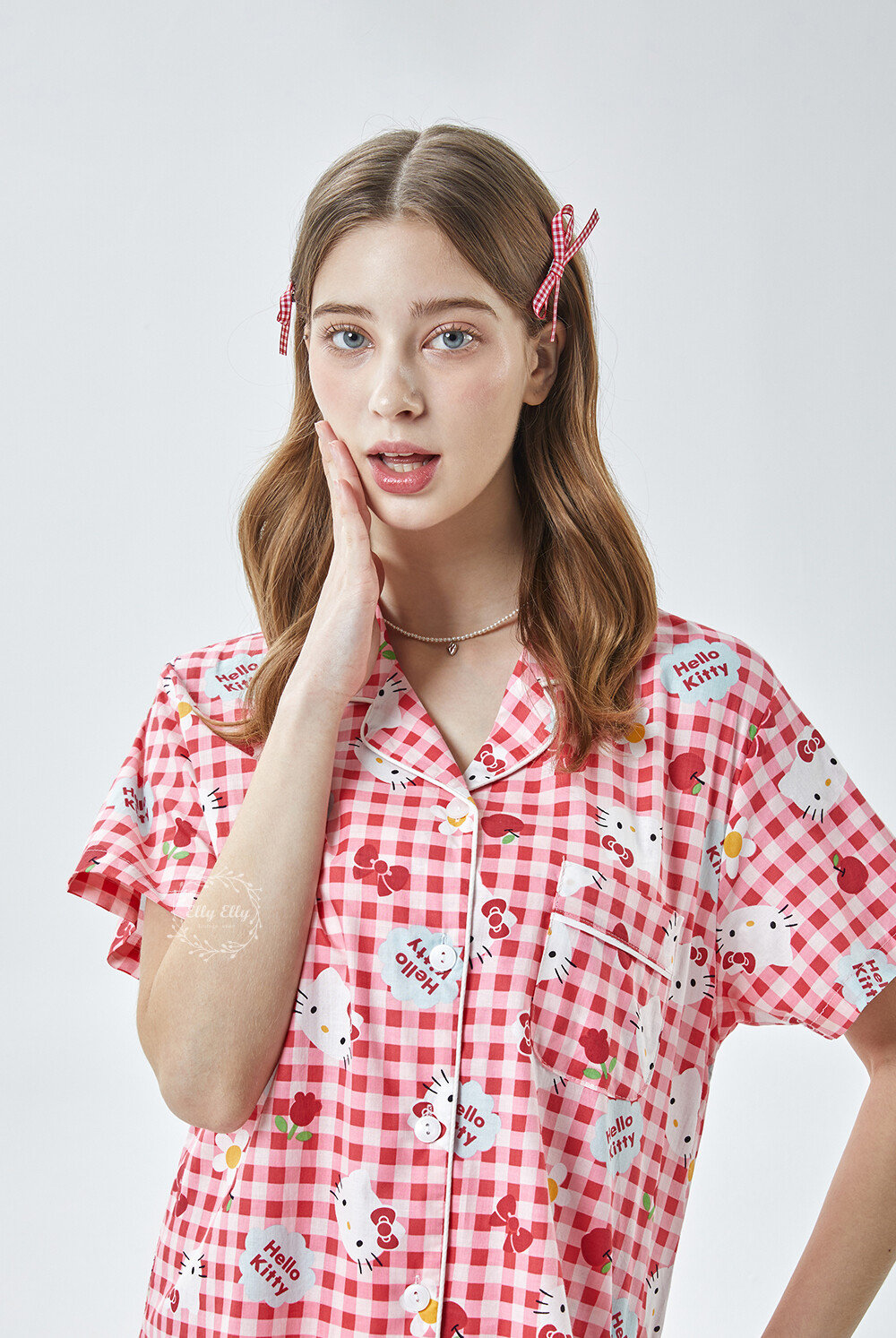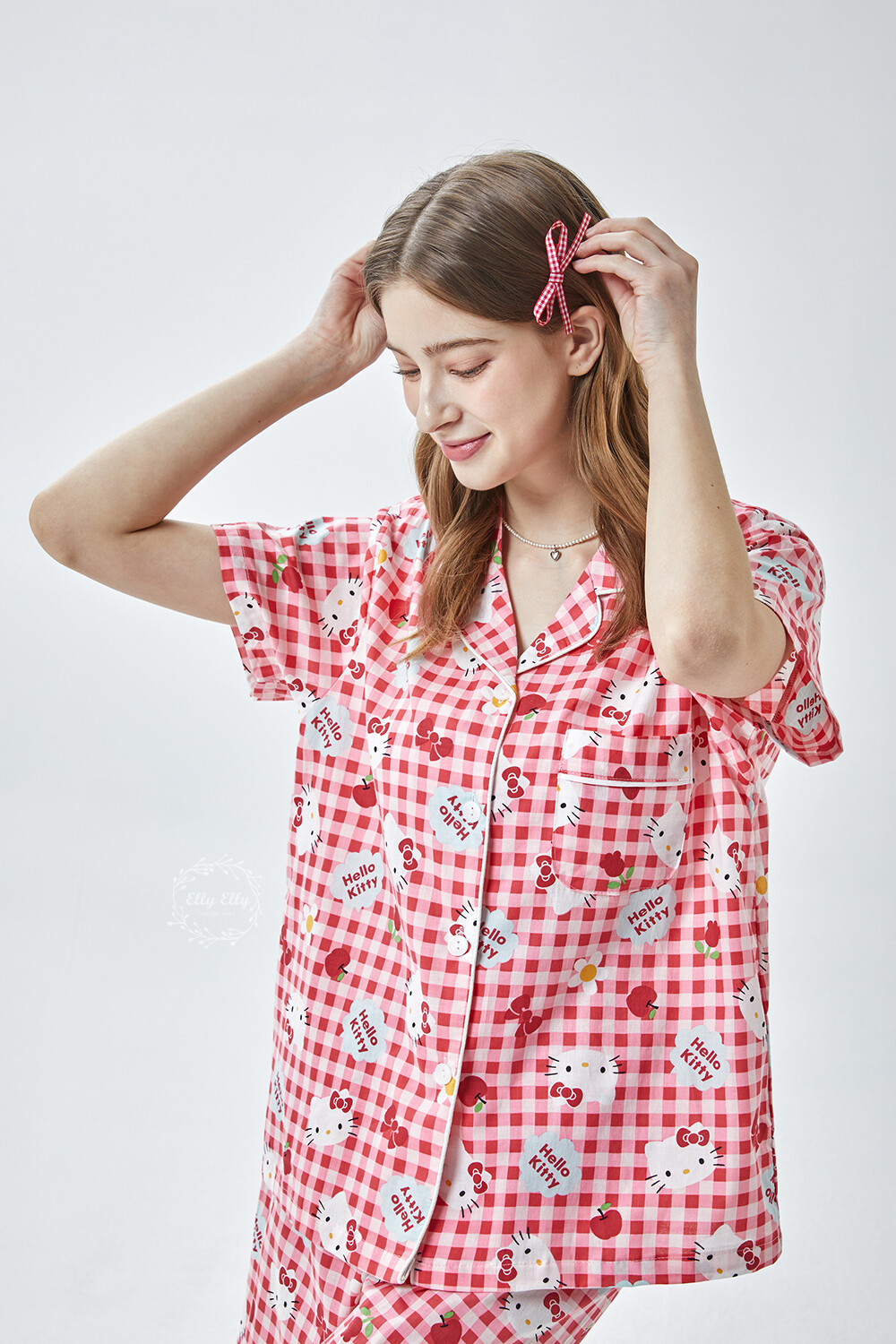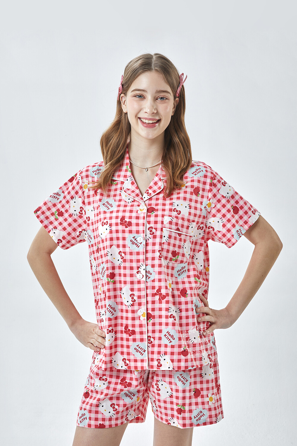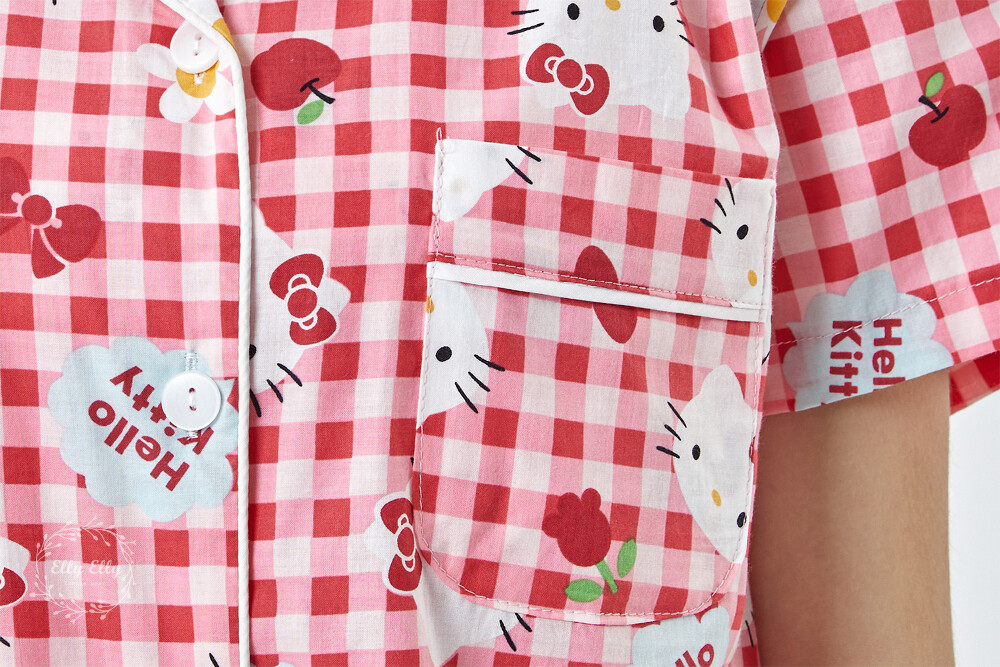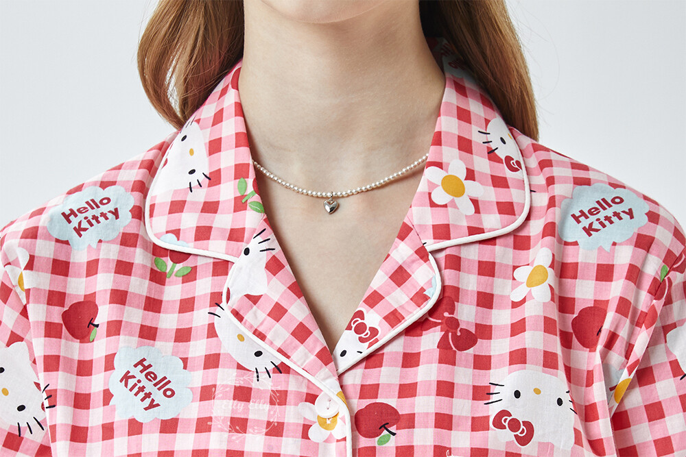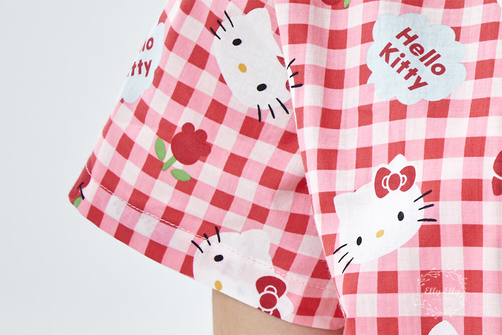 HK-4614 산리오정품 헬로키티 체크무늬 와이카라 반팔상하
