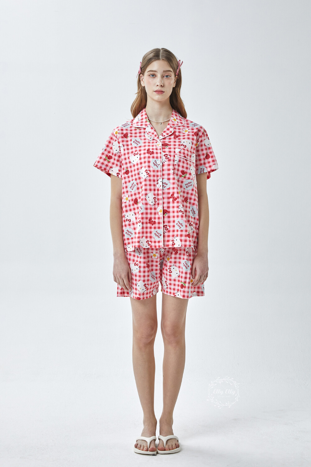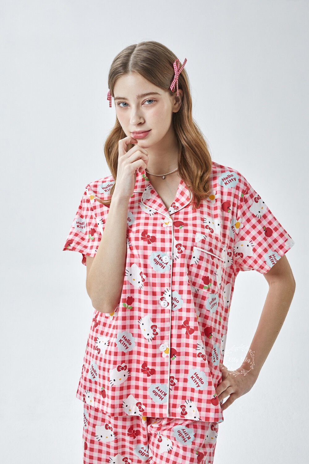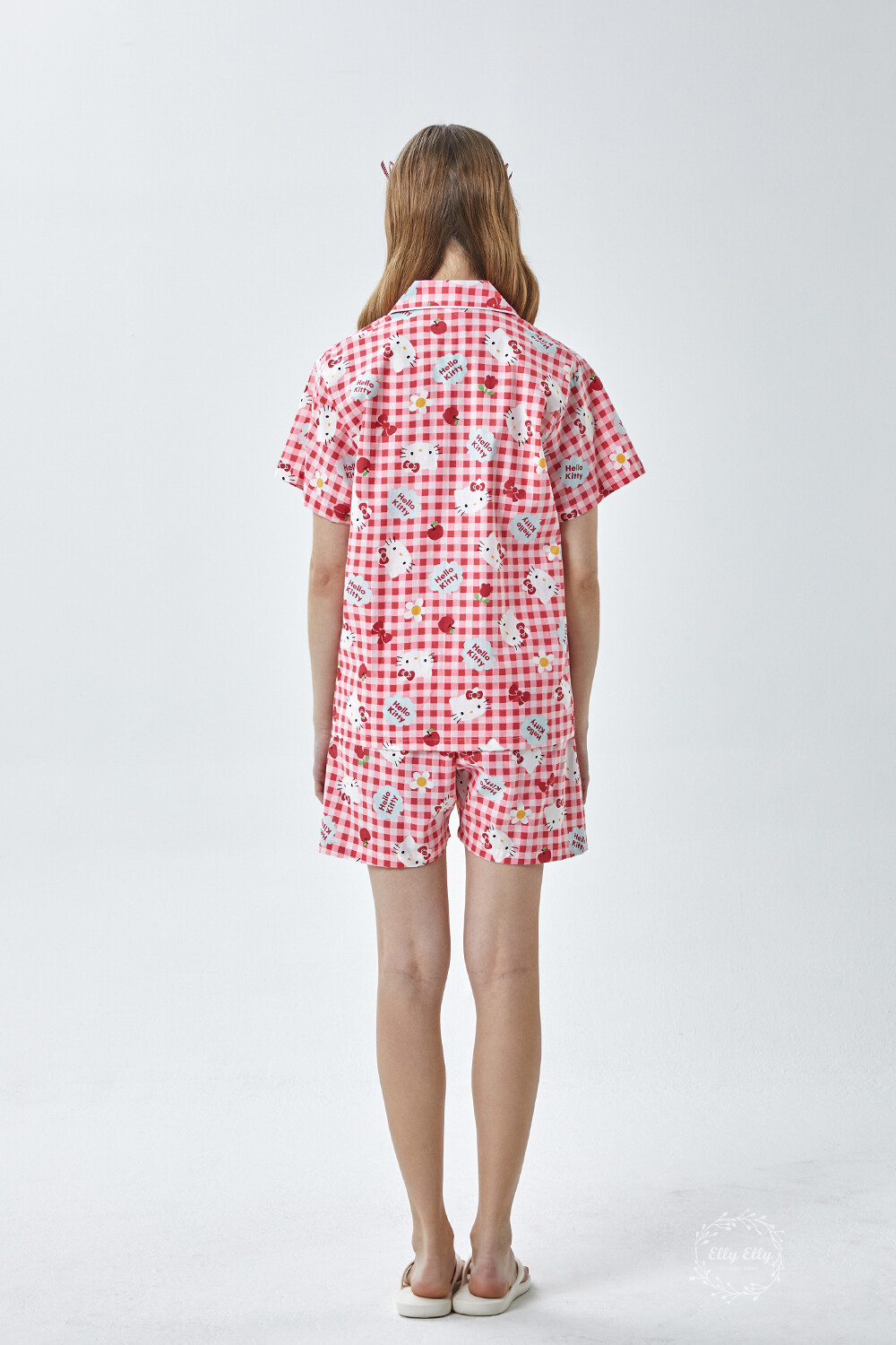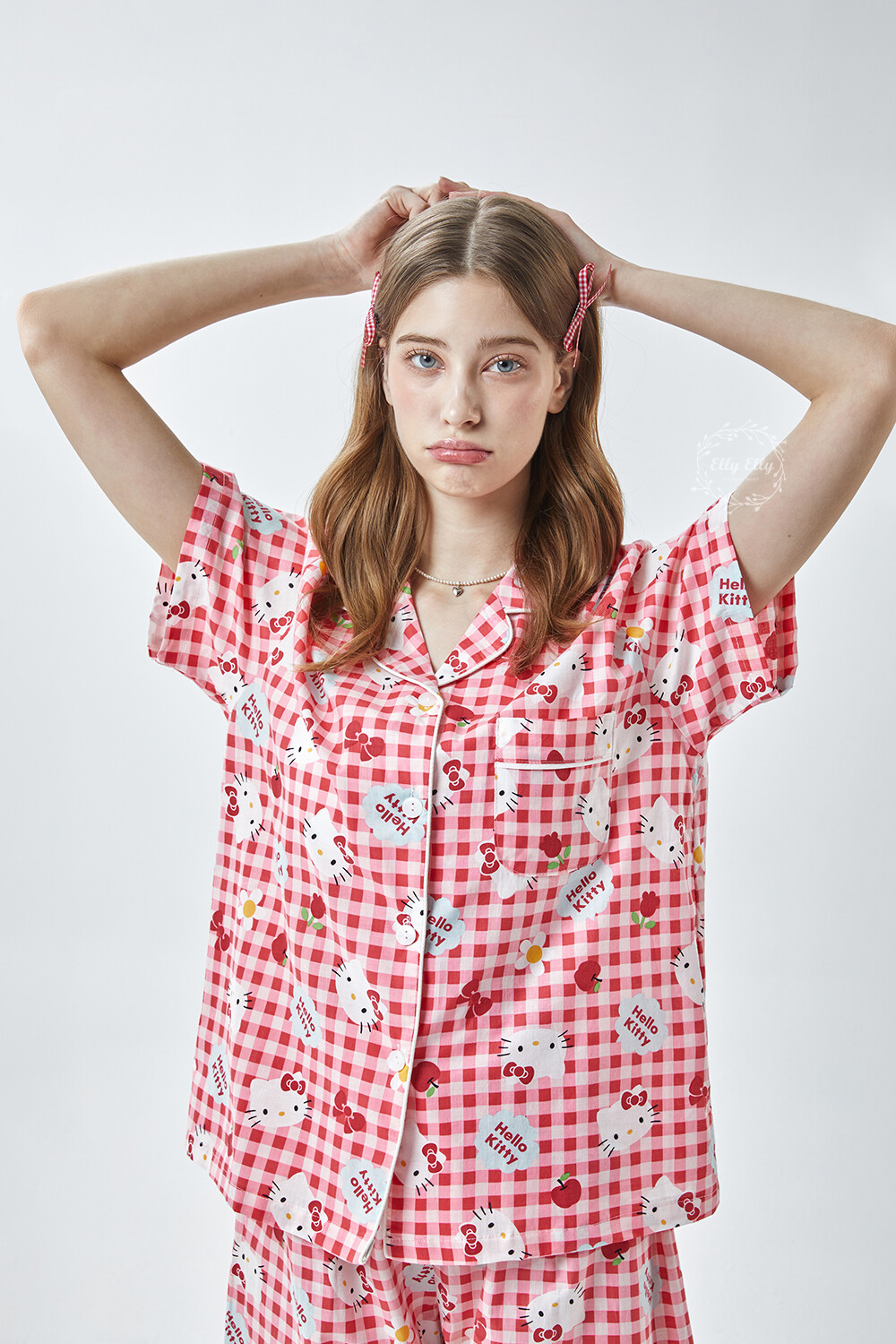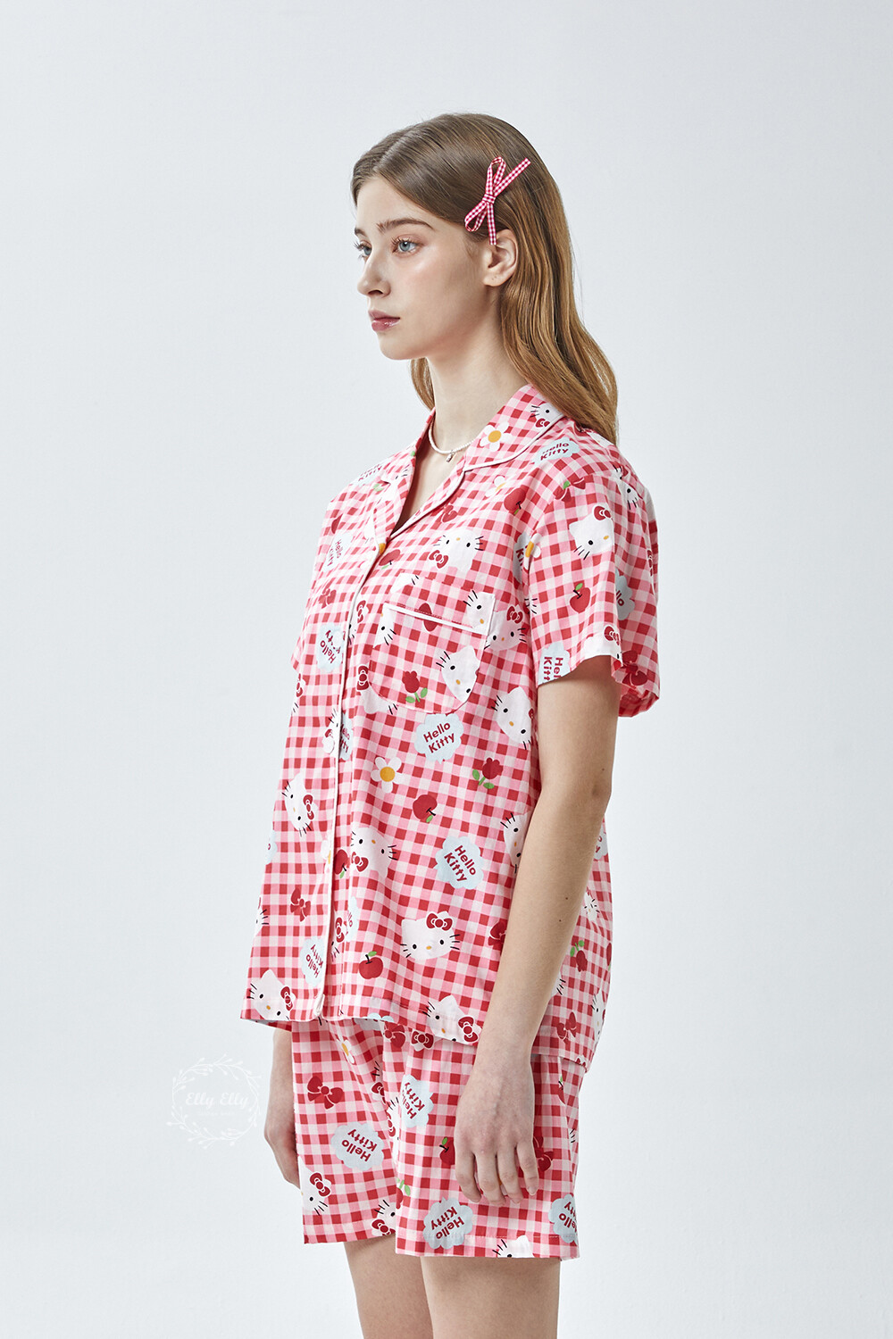 HK-4614 산리오정품 헬로키티 체크무늬 와이카라 반팔상하