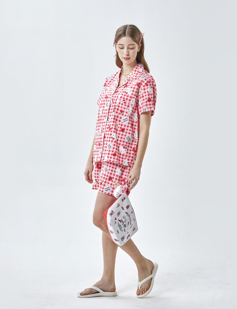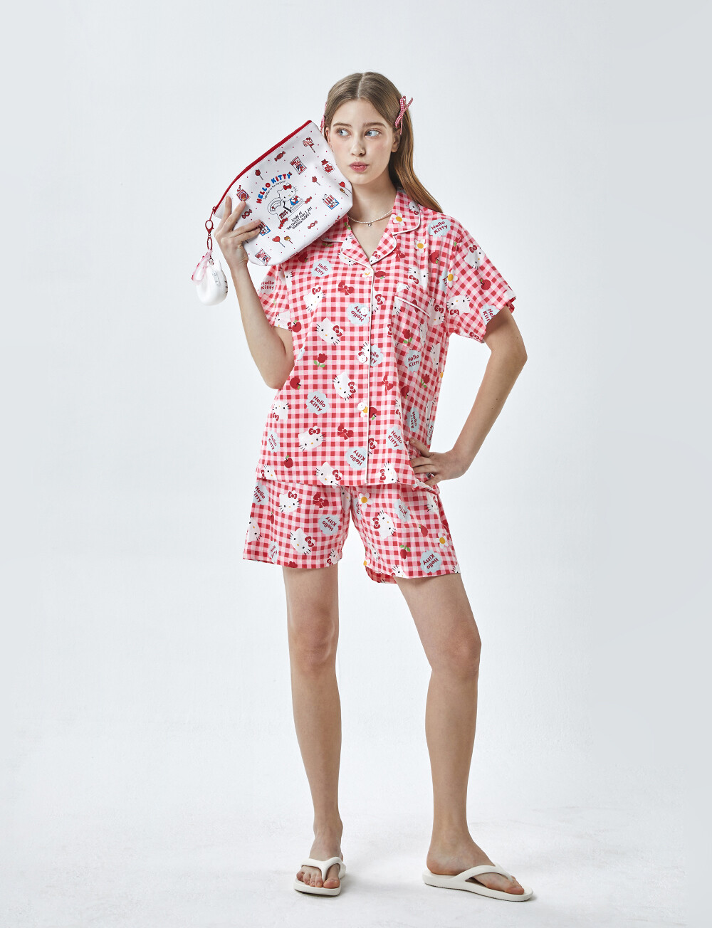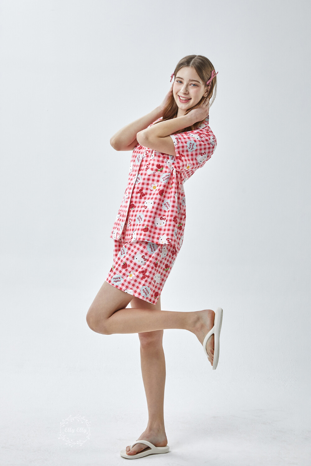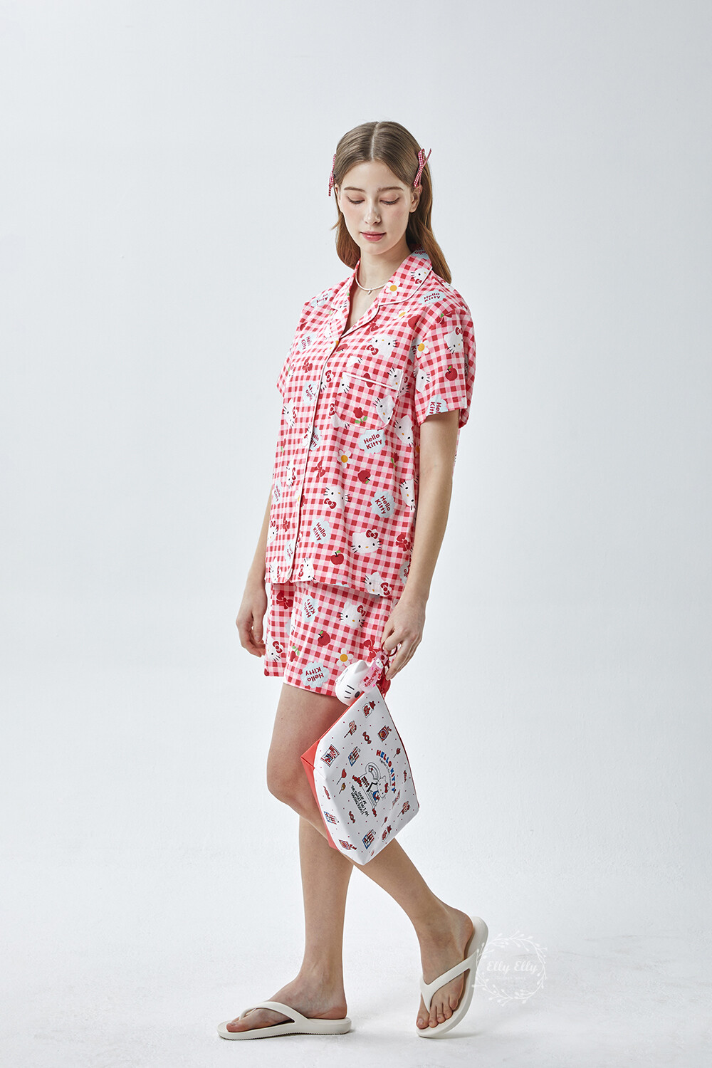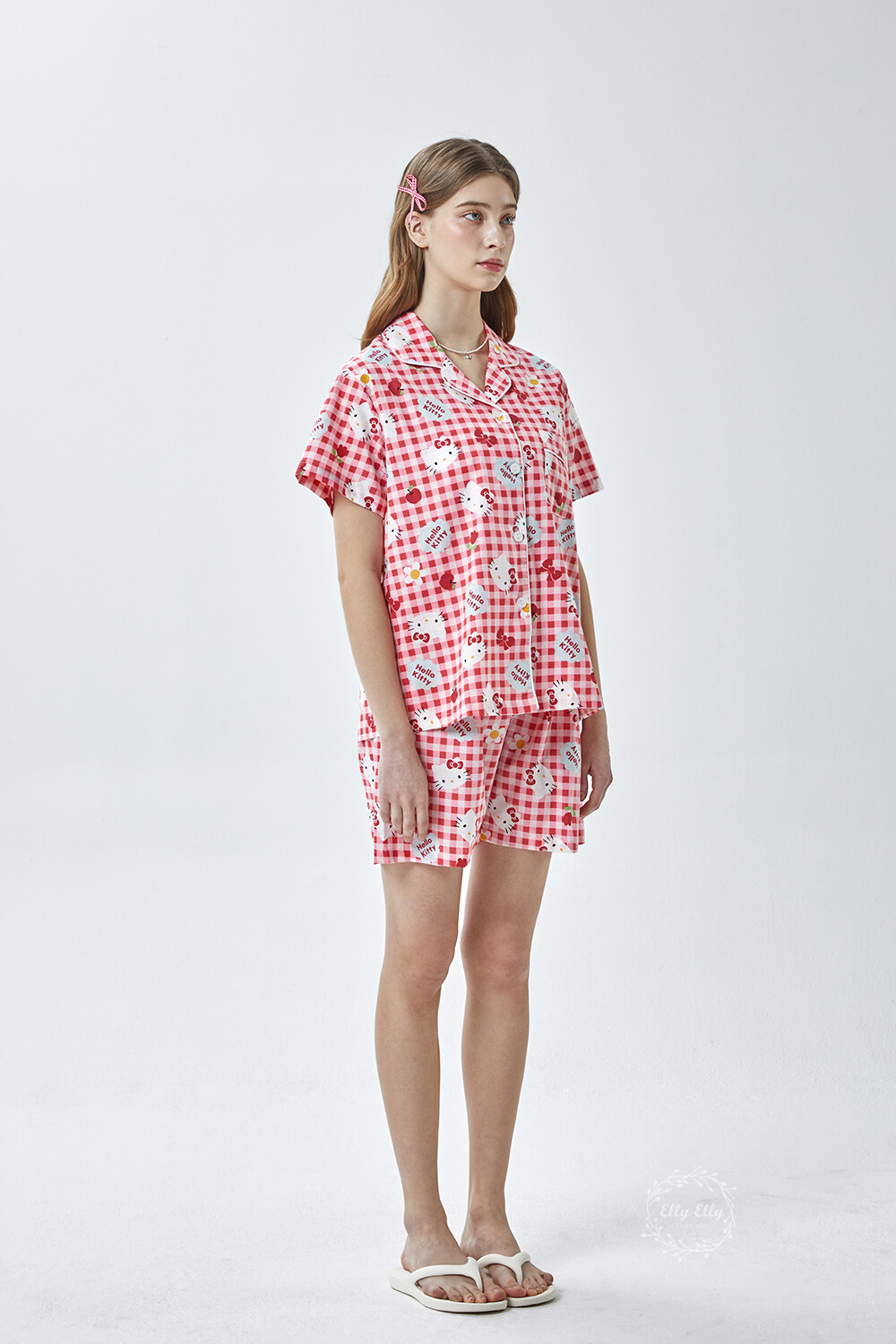 HK-4614 산리오정품 헬로키티 체크무늬 와이카라 반팔상하