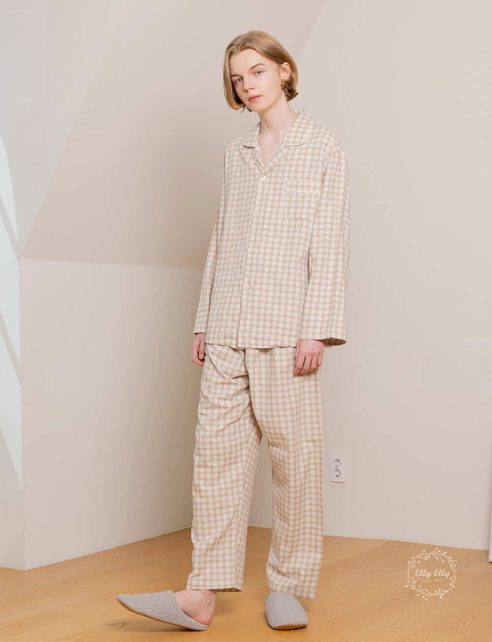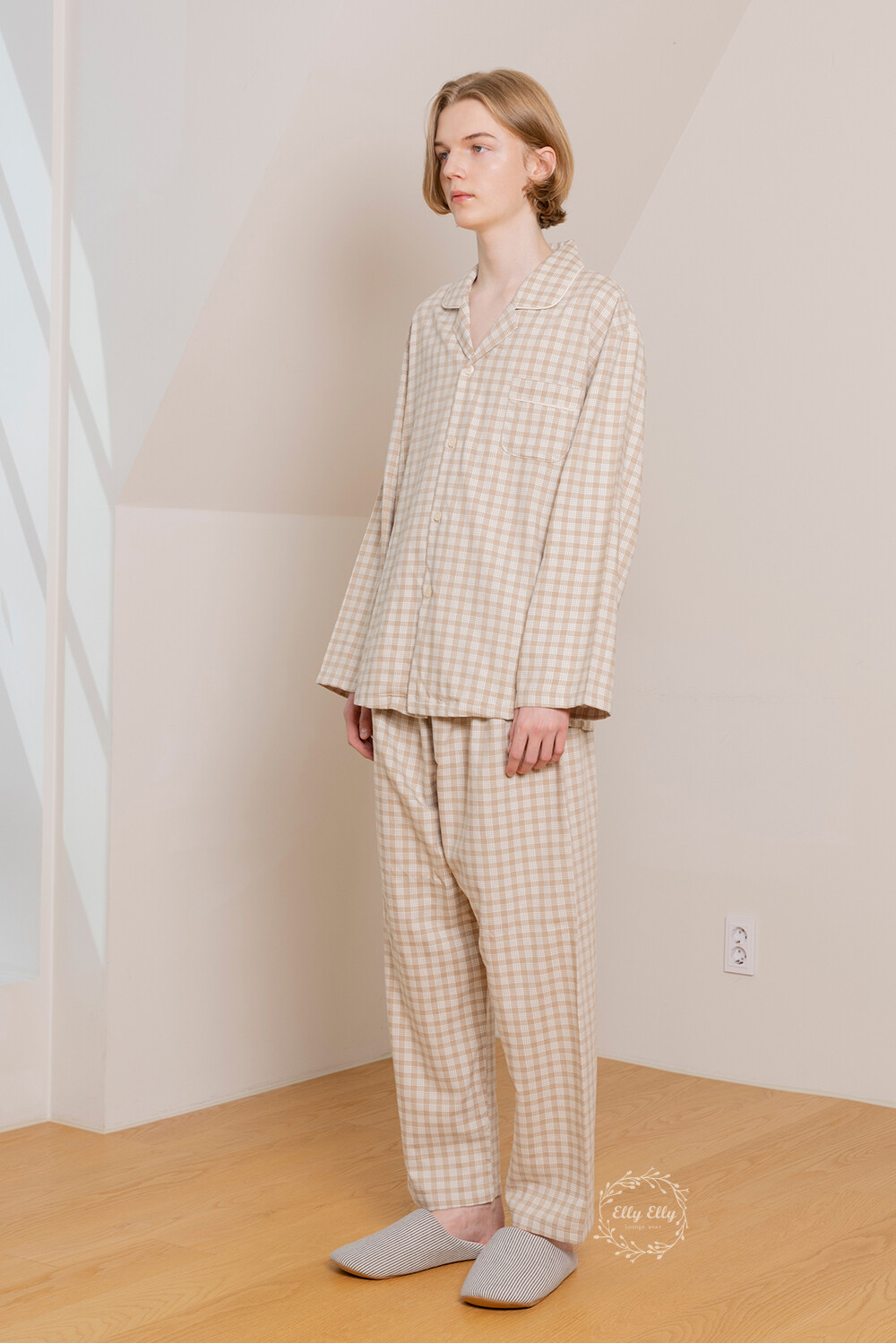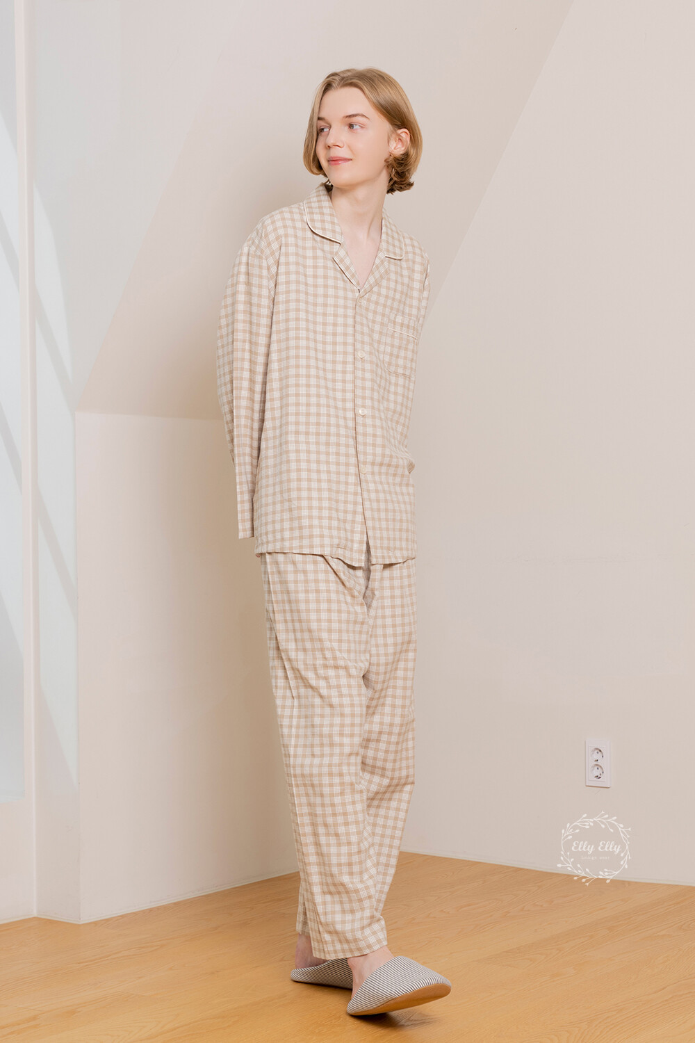 LL-626 체크패턴 와이카라 남성 긴팔페어 베이지