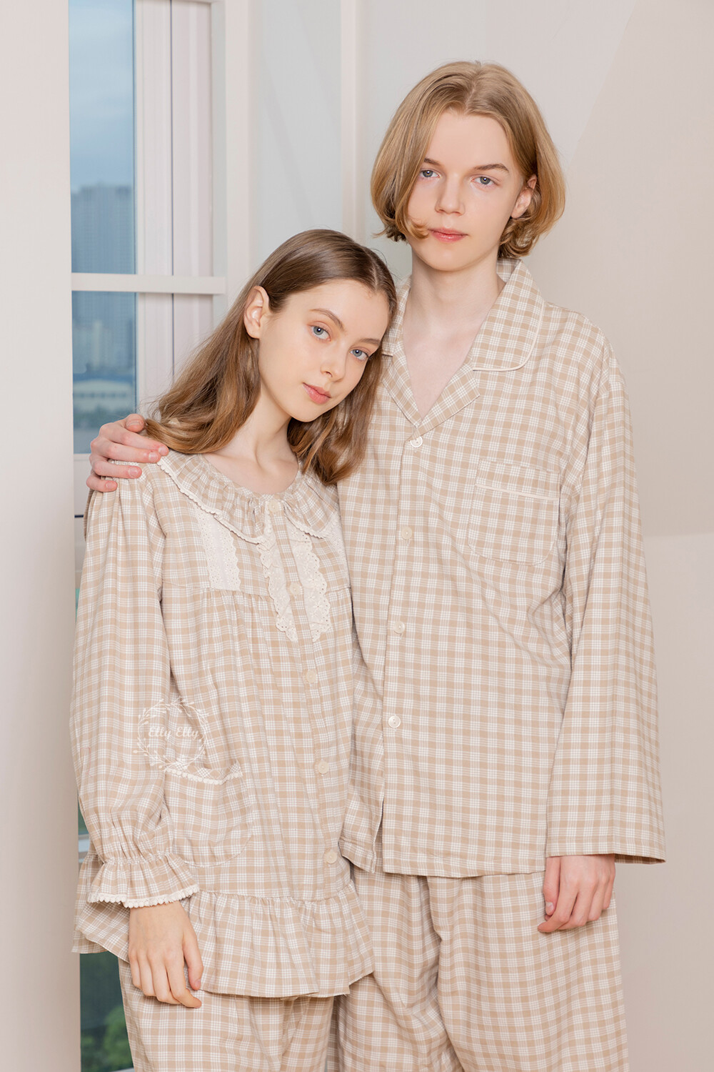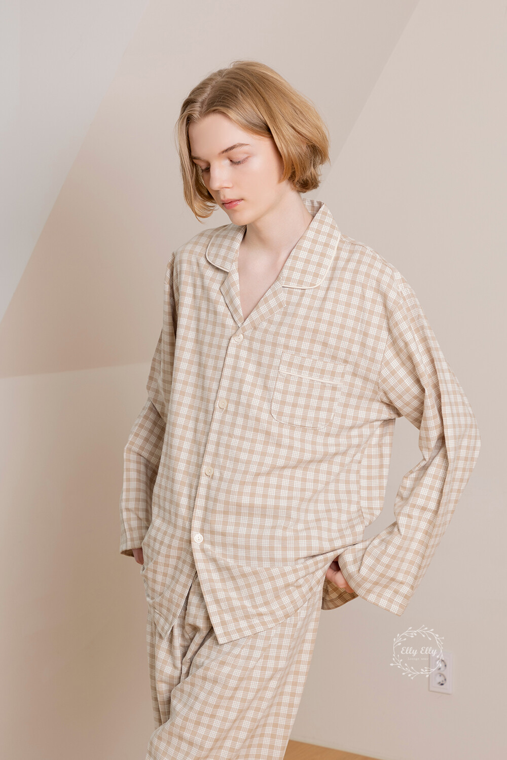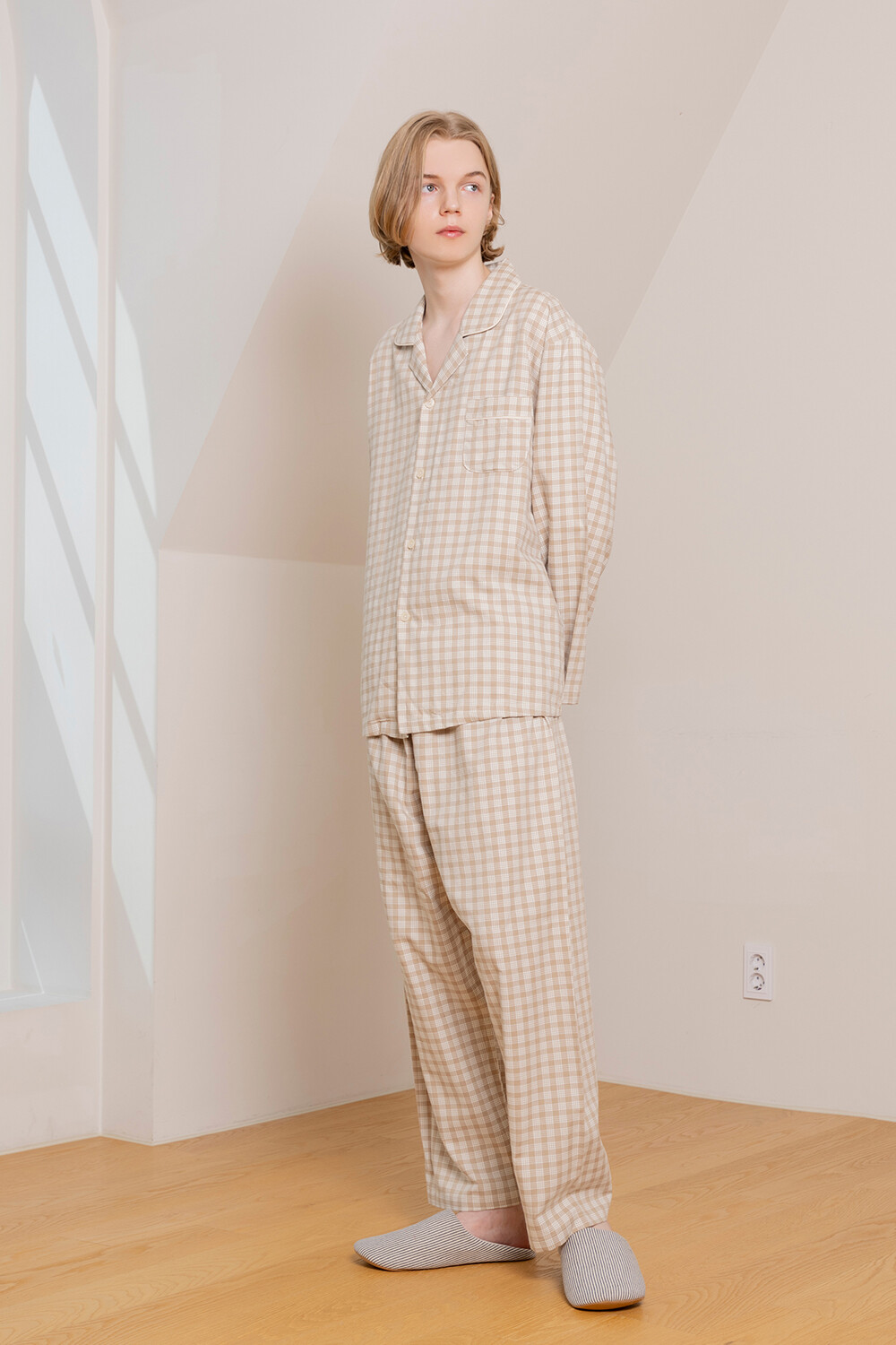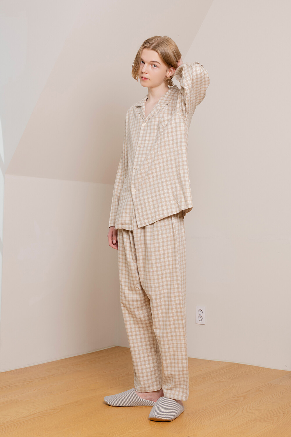 LL-626 체크패턴 와이카라 남성 긴팔페어 베이지