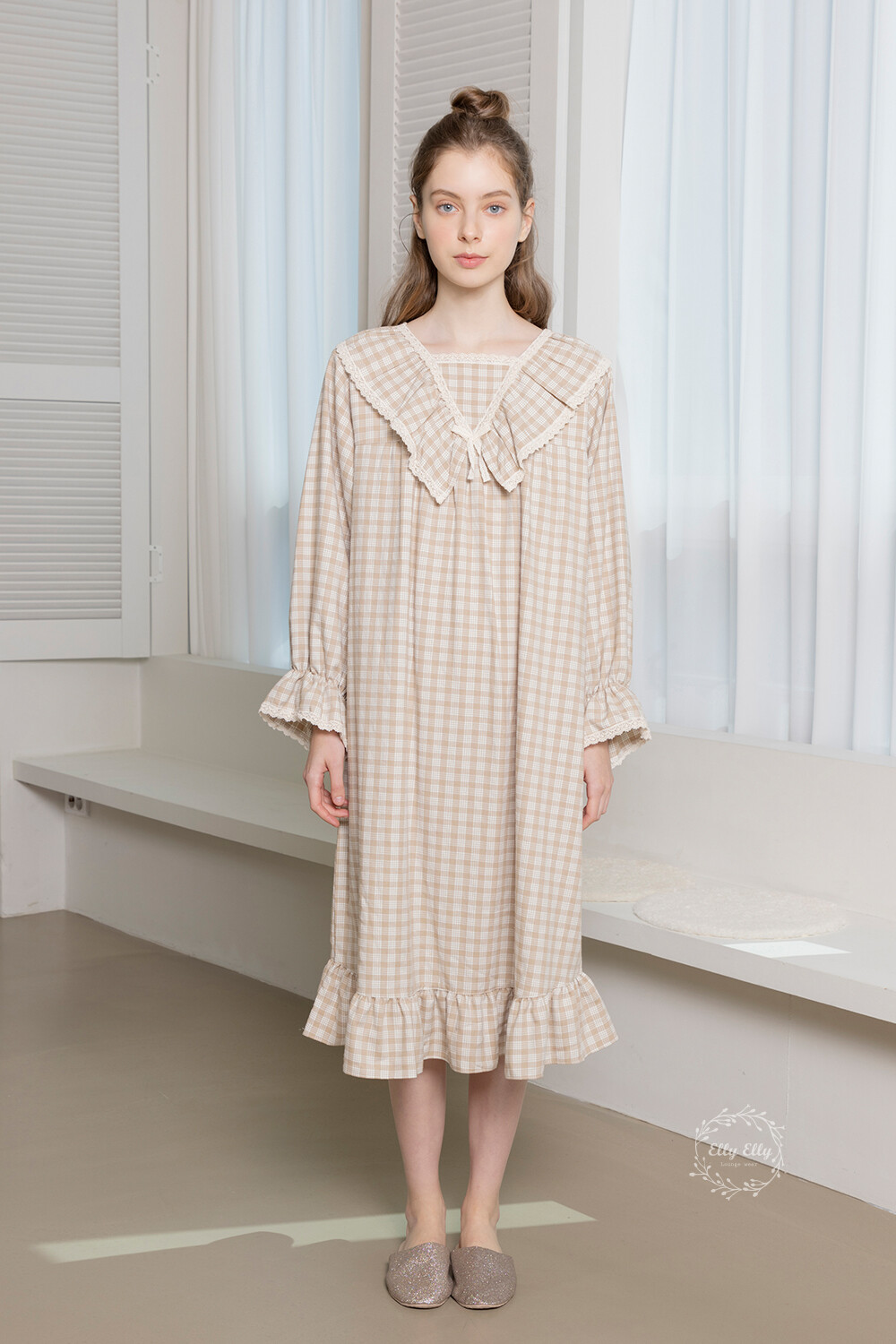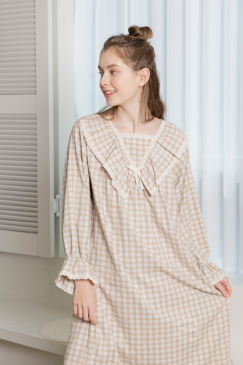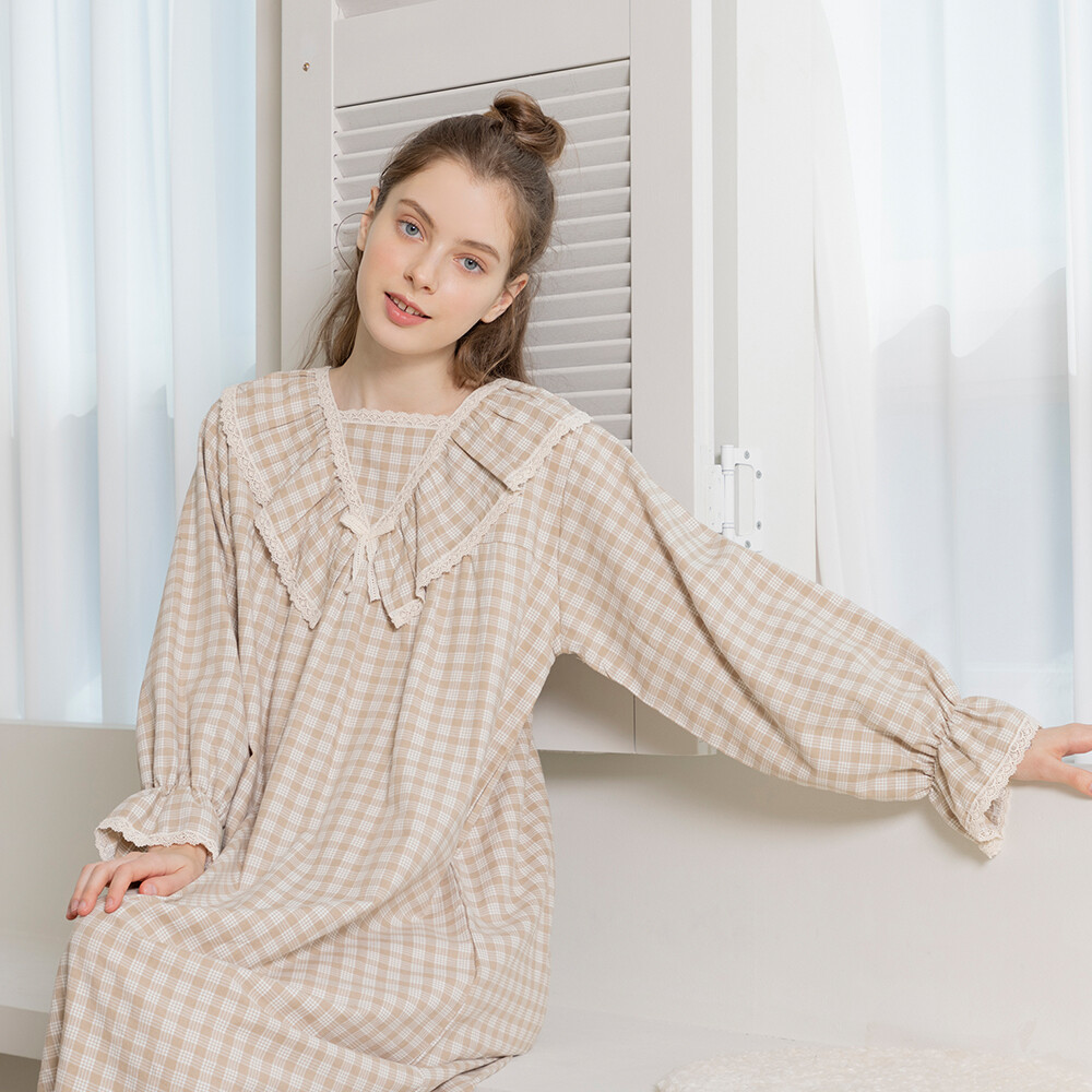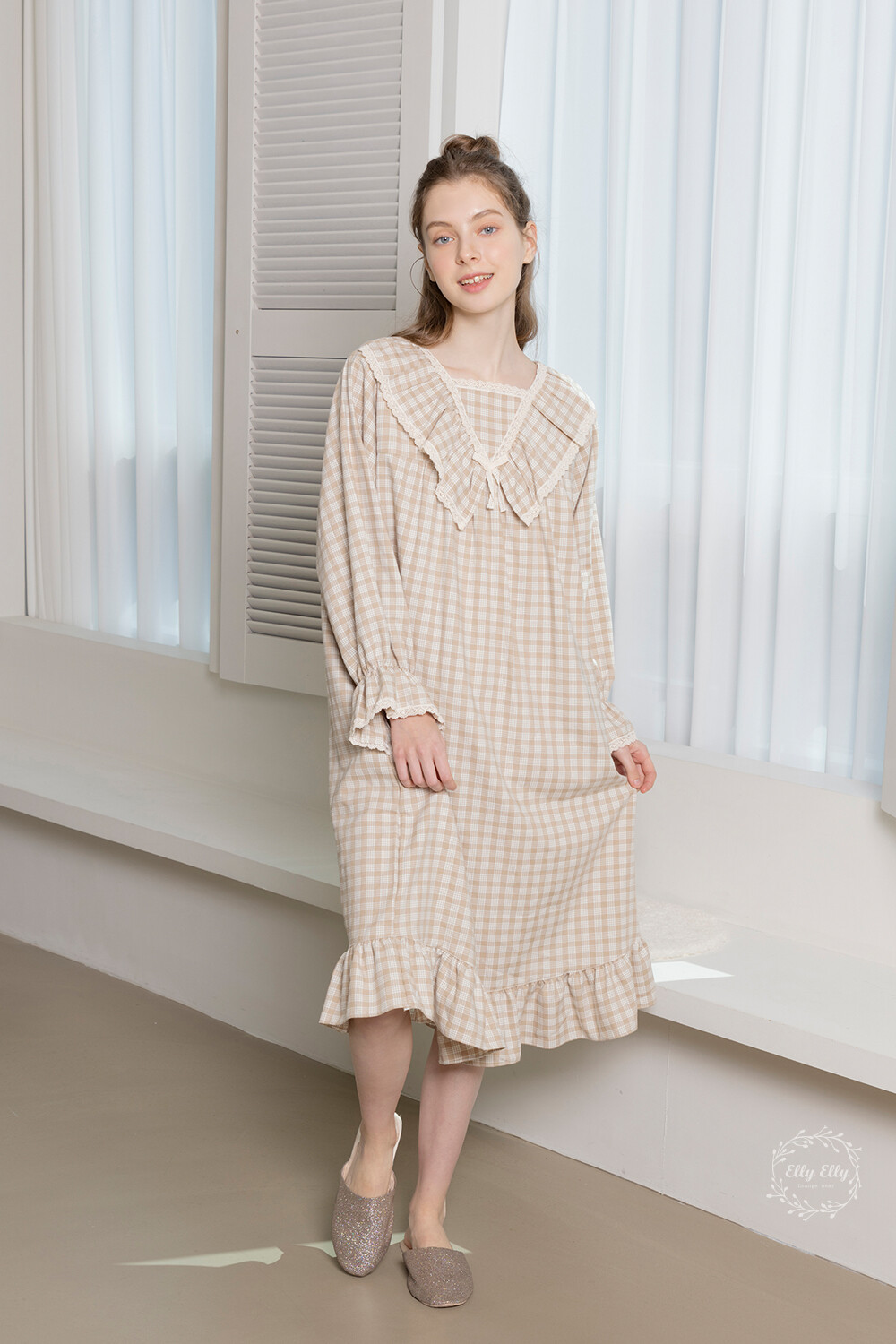 LL-628 체크패턴 레이스프릴 여성 긴팔원피스 베이지