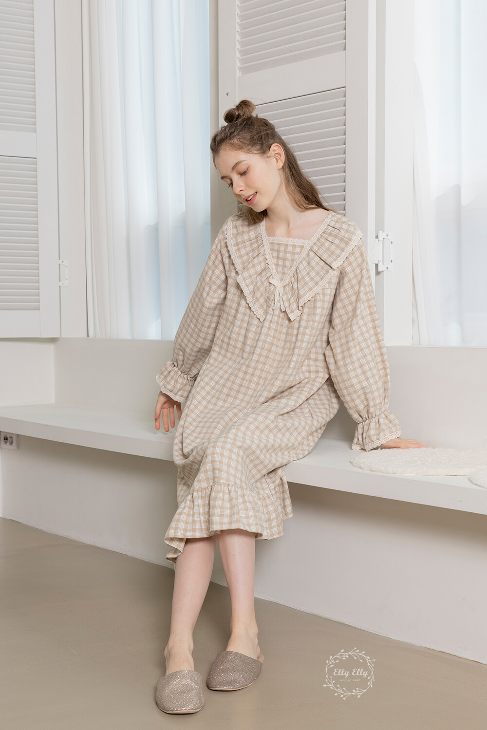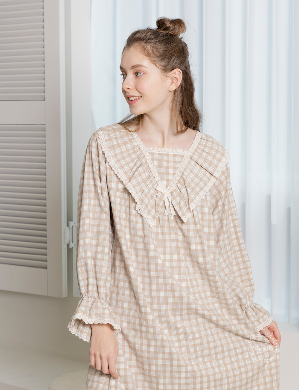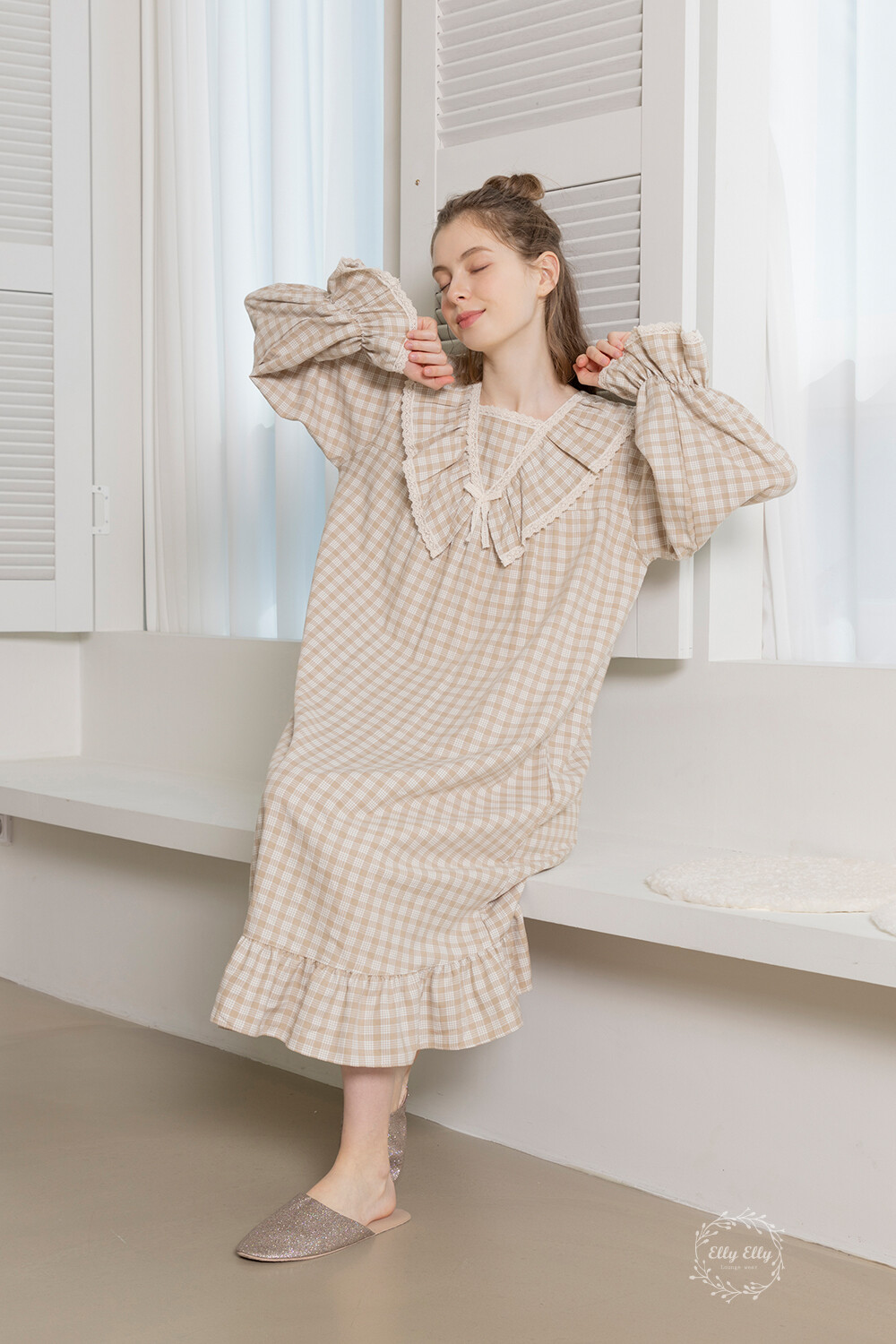 LL-628 체크패턴 레이스프릴 여성 긴팔원피스 베이지