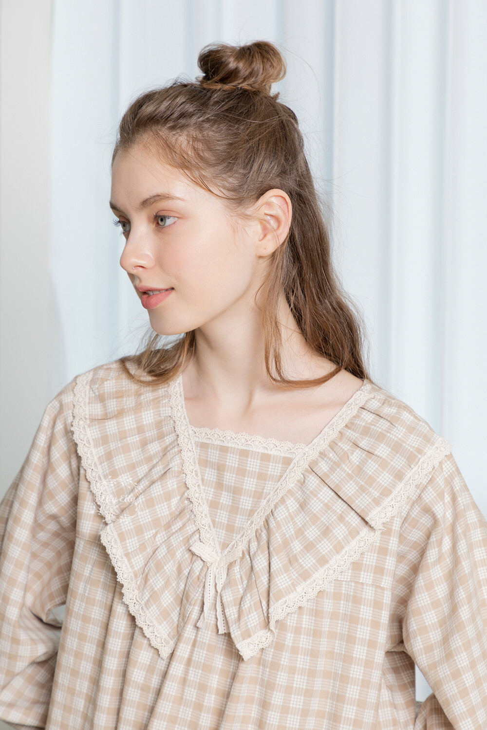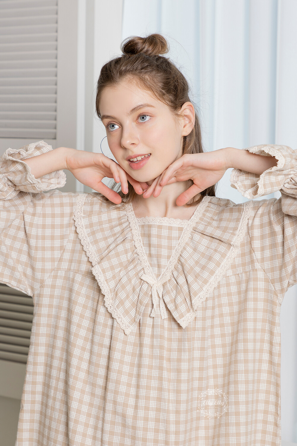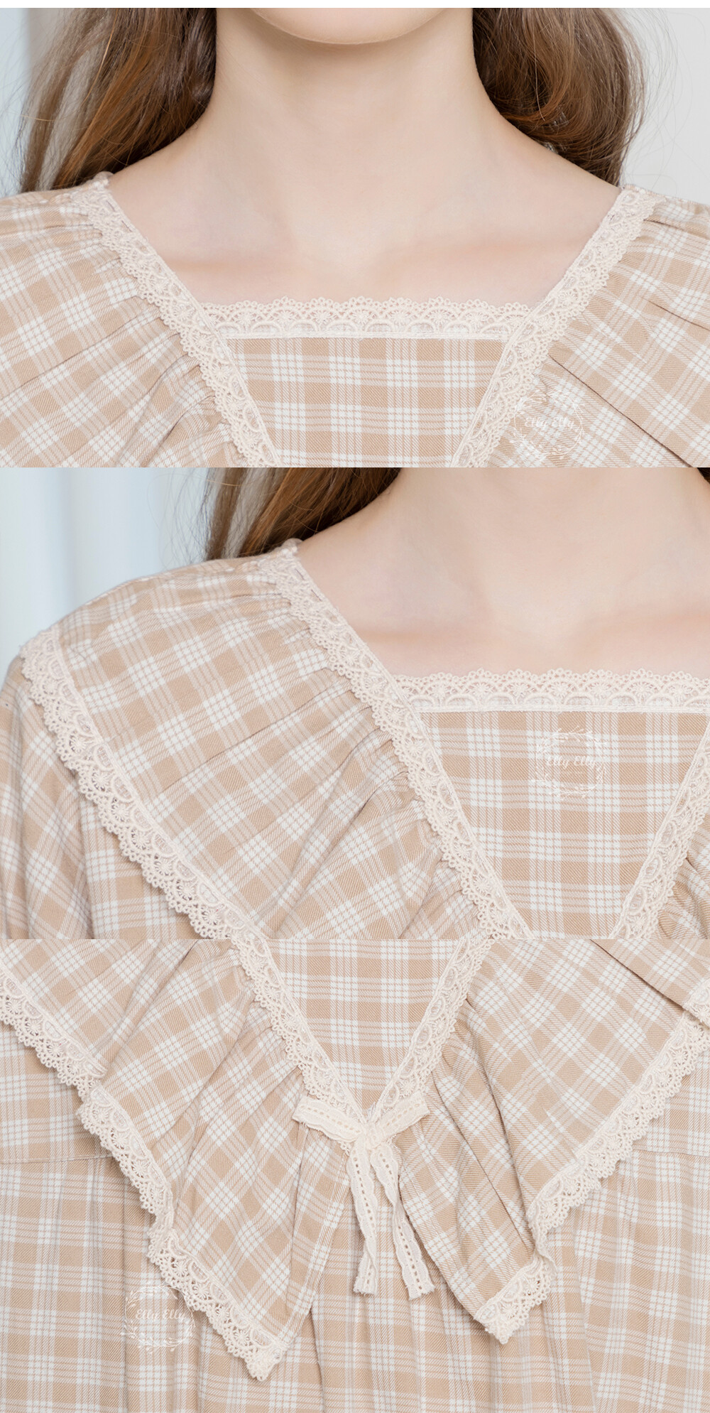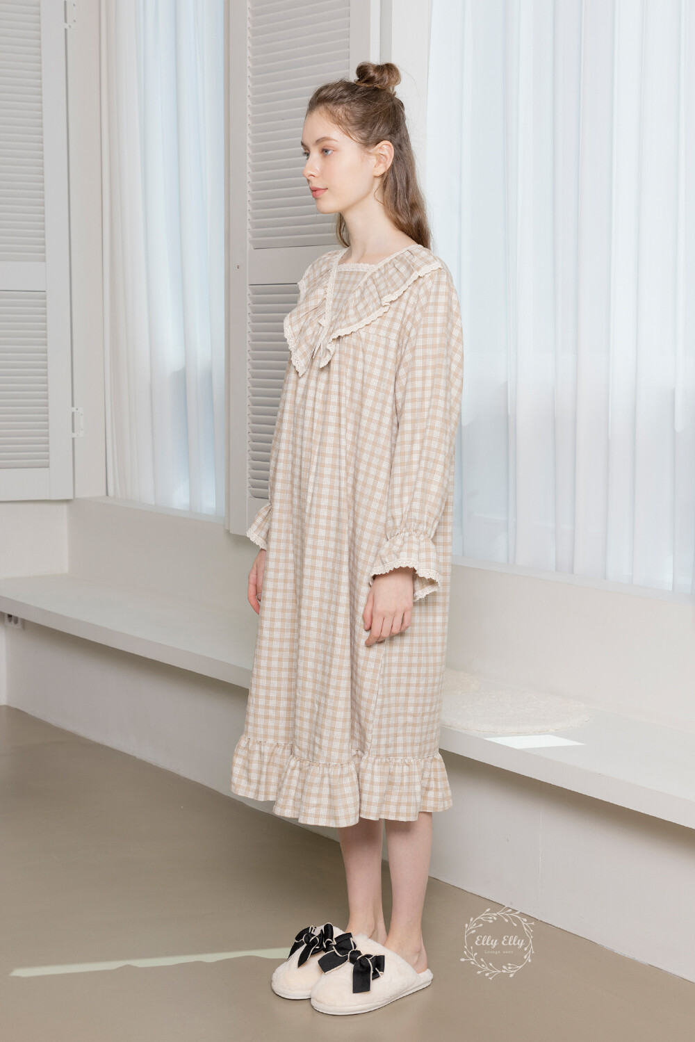 LL-628 체크패턴 레이스프릴 여성 긴팔원피스 베이지