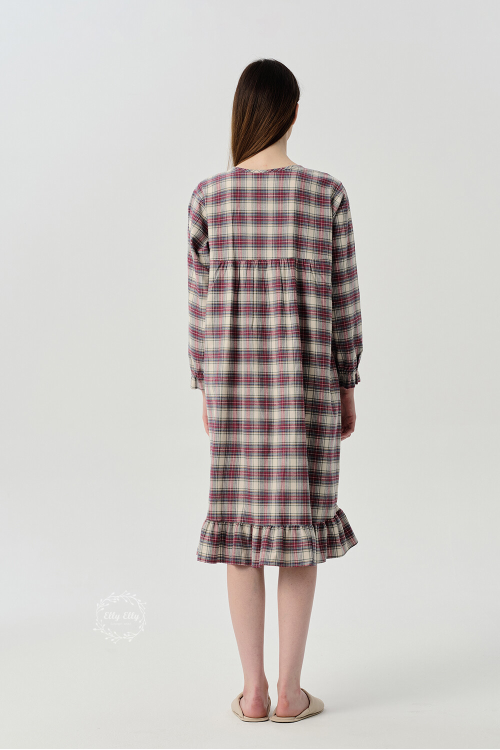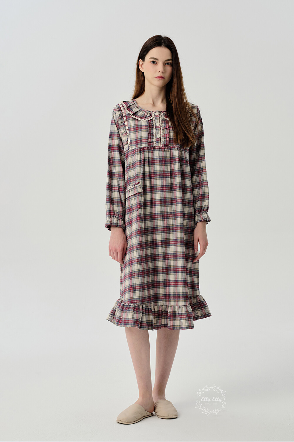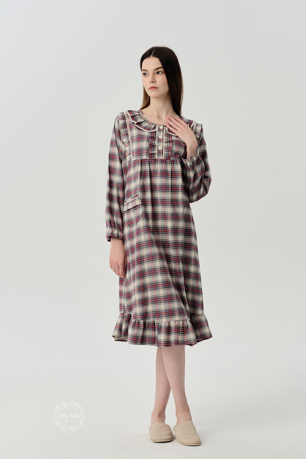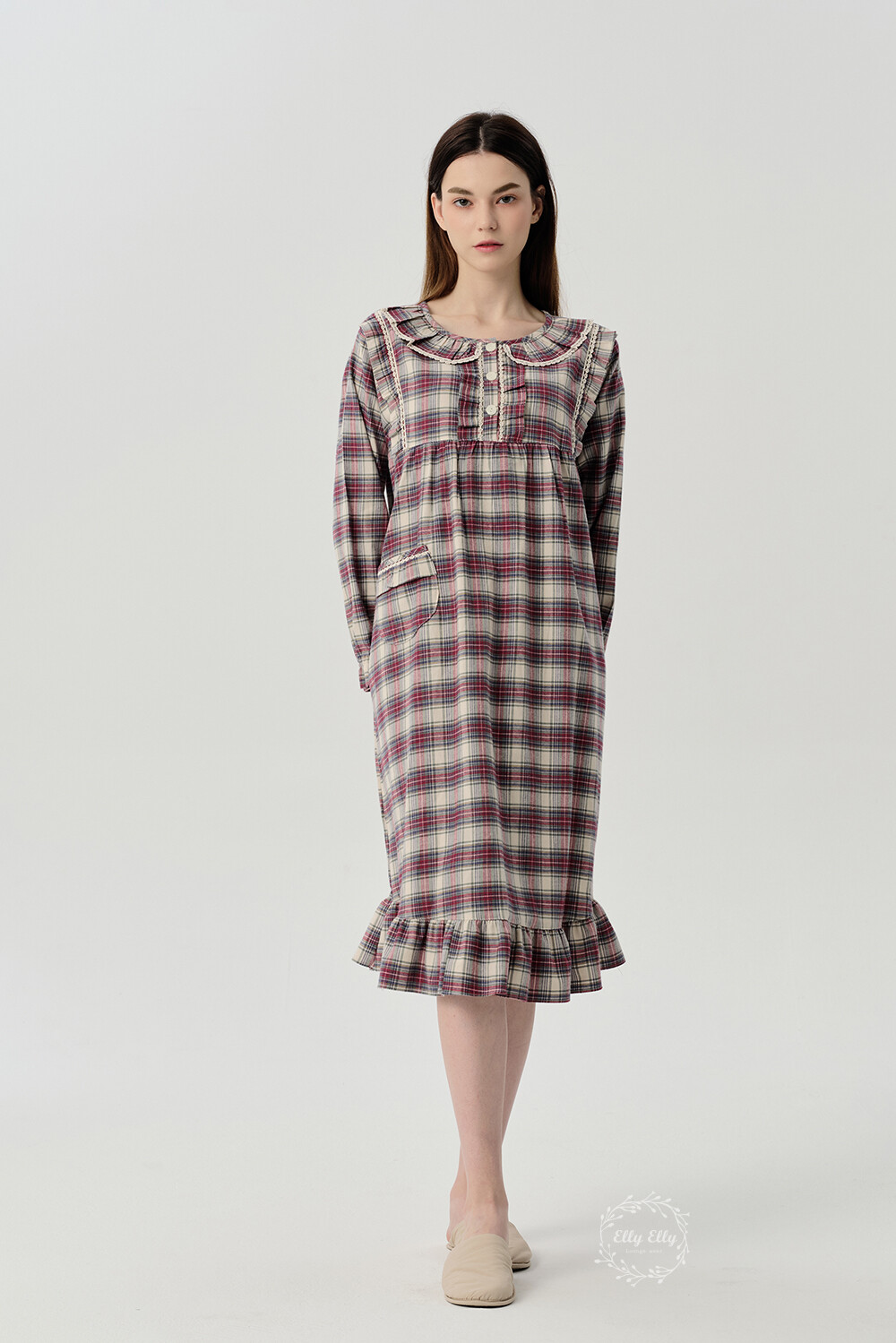 LL-687 엘리엘리 프릴레이스 체크무늬 여성 긴팔드레스 원피스