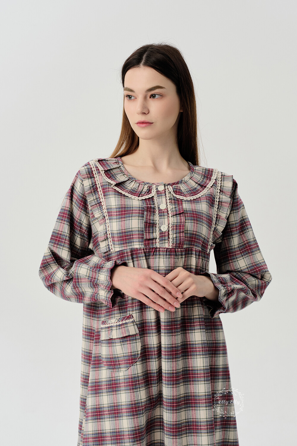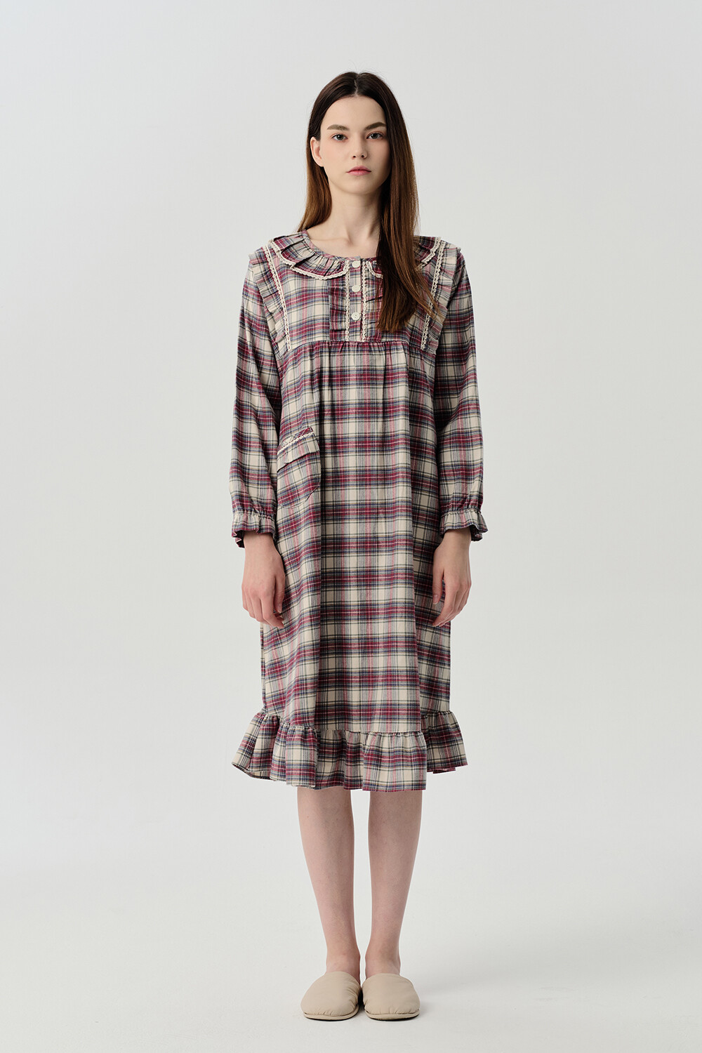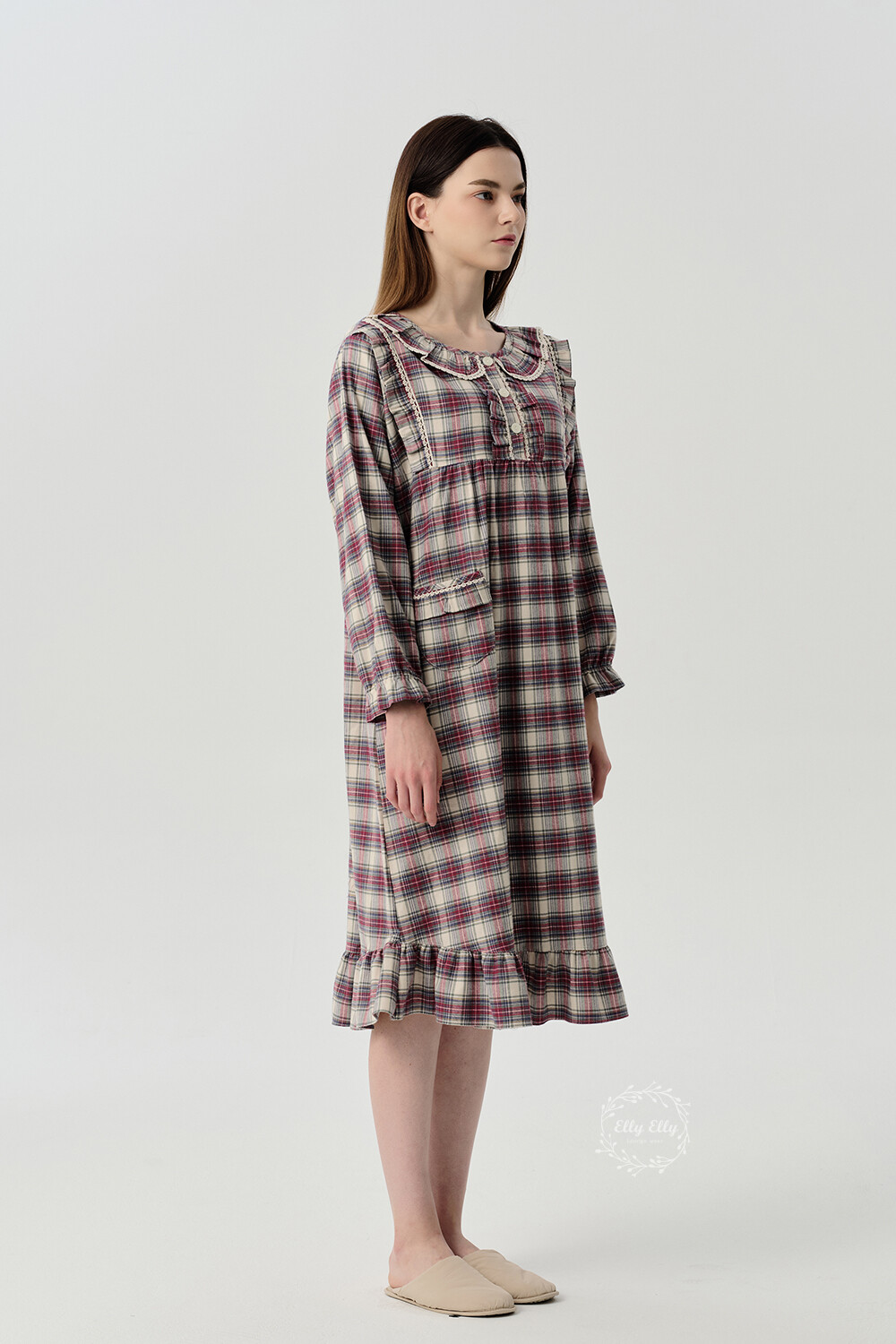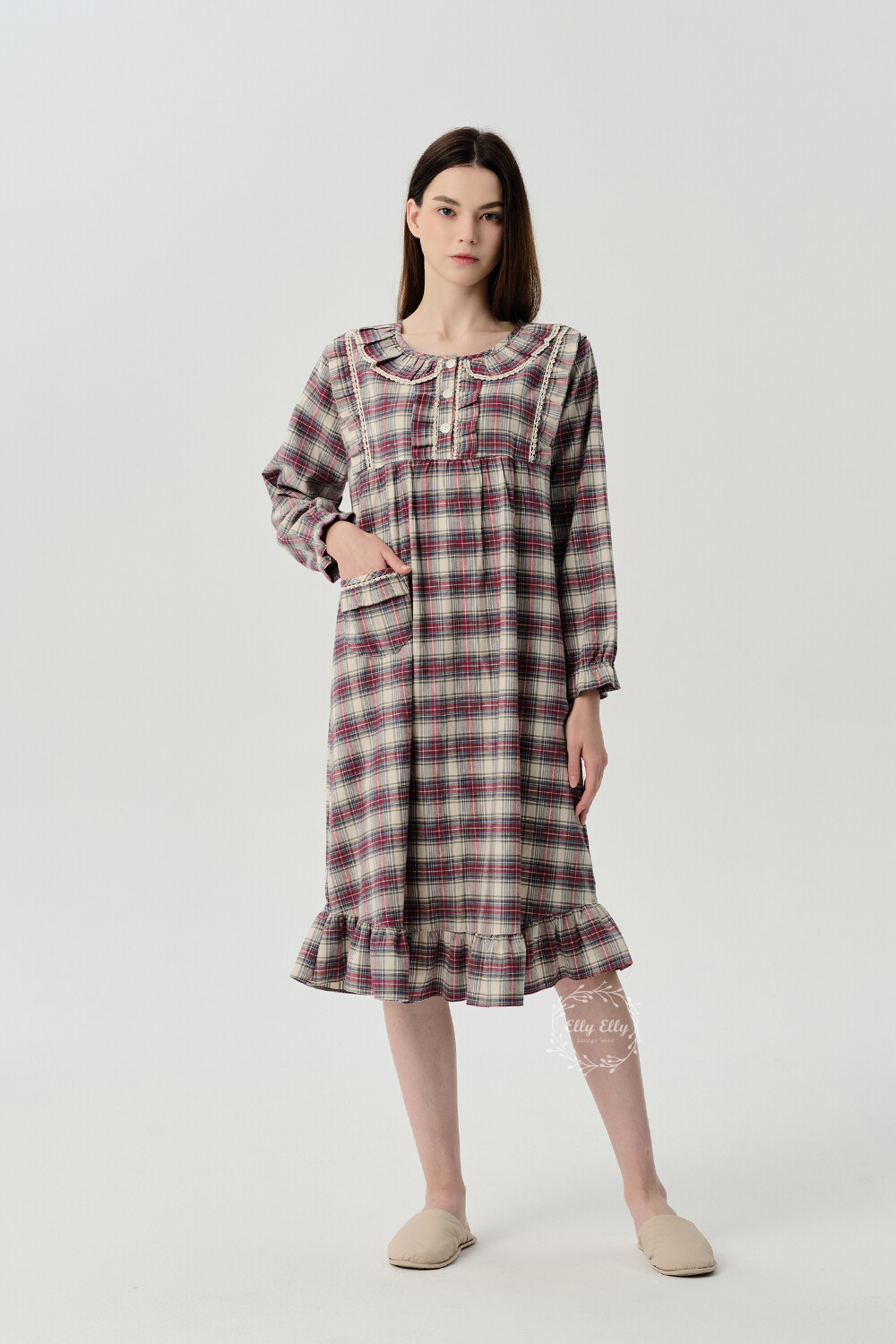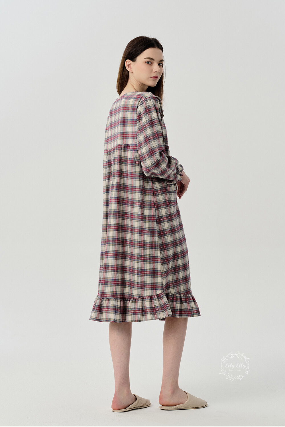 LL-687 엘리엘리 프릴레이스 체크무늬 여성 긴팔드레스 원피스