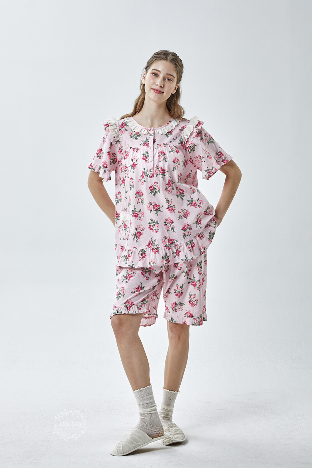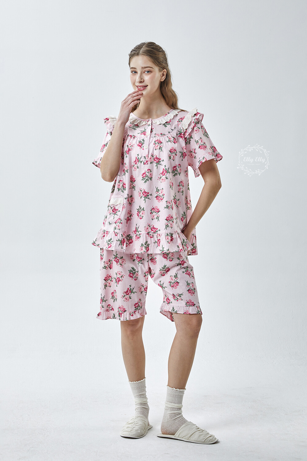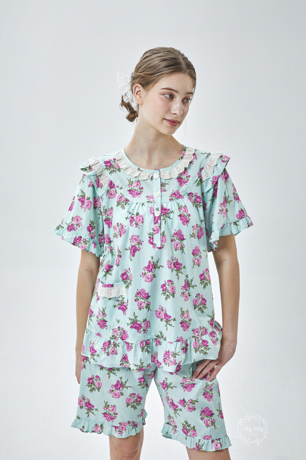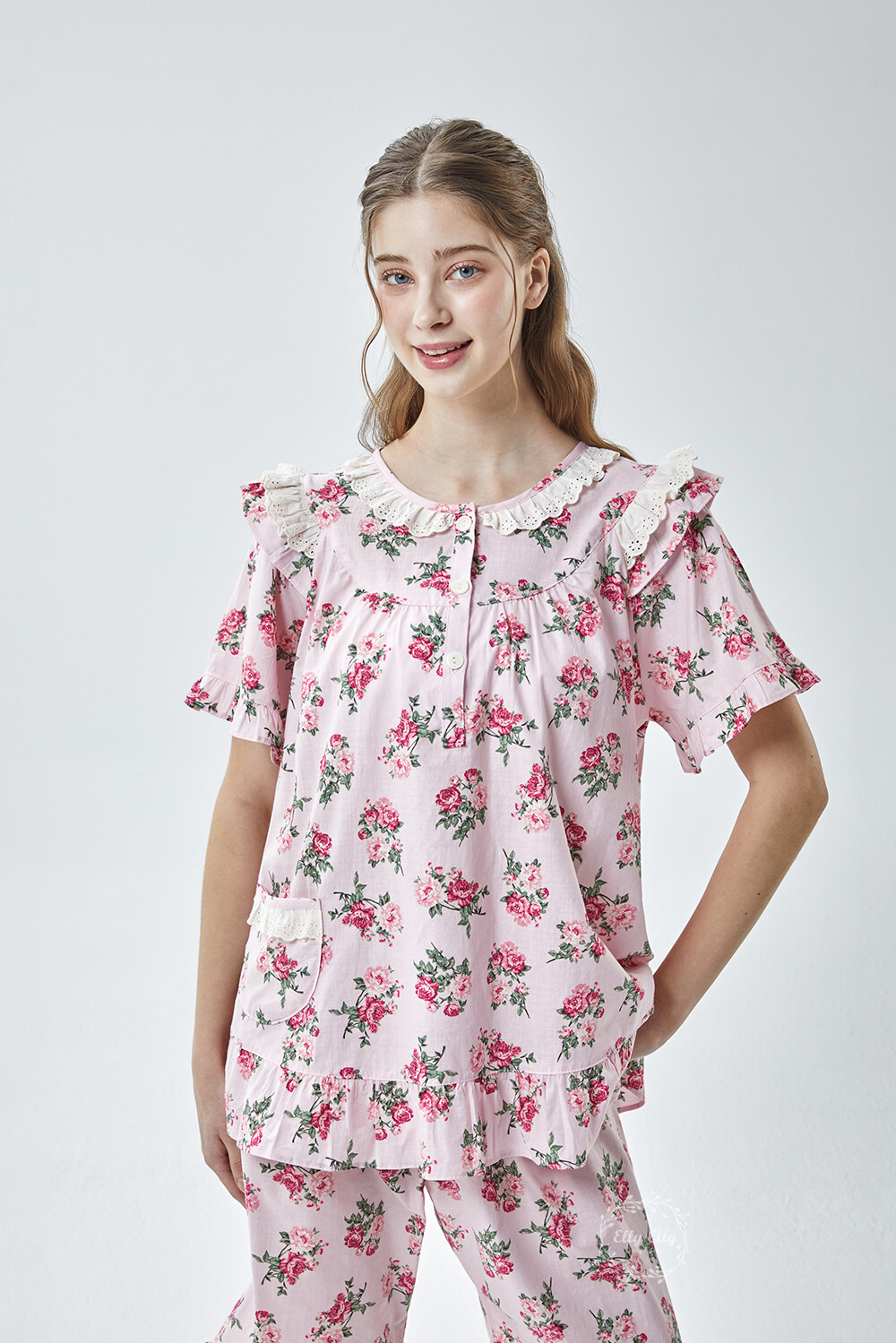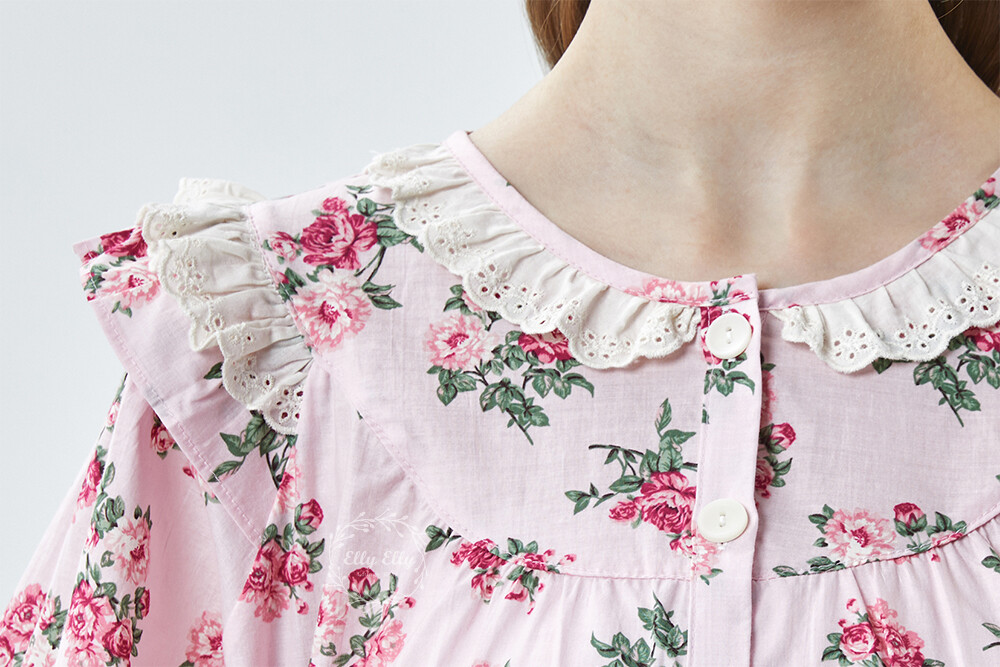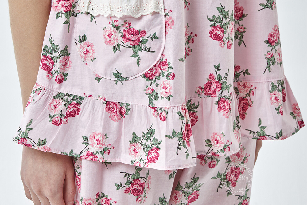 LL-907 엘리엘리 정품 꽃무늬 프릴레이스 반팔상하 2COLOR