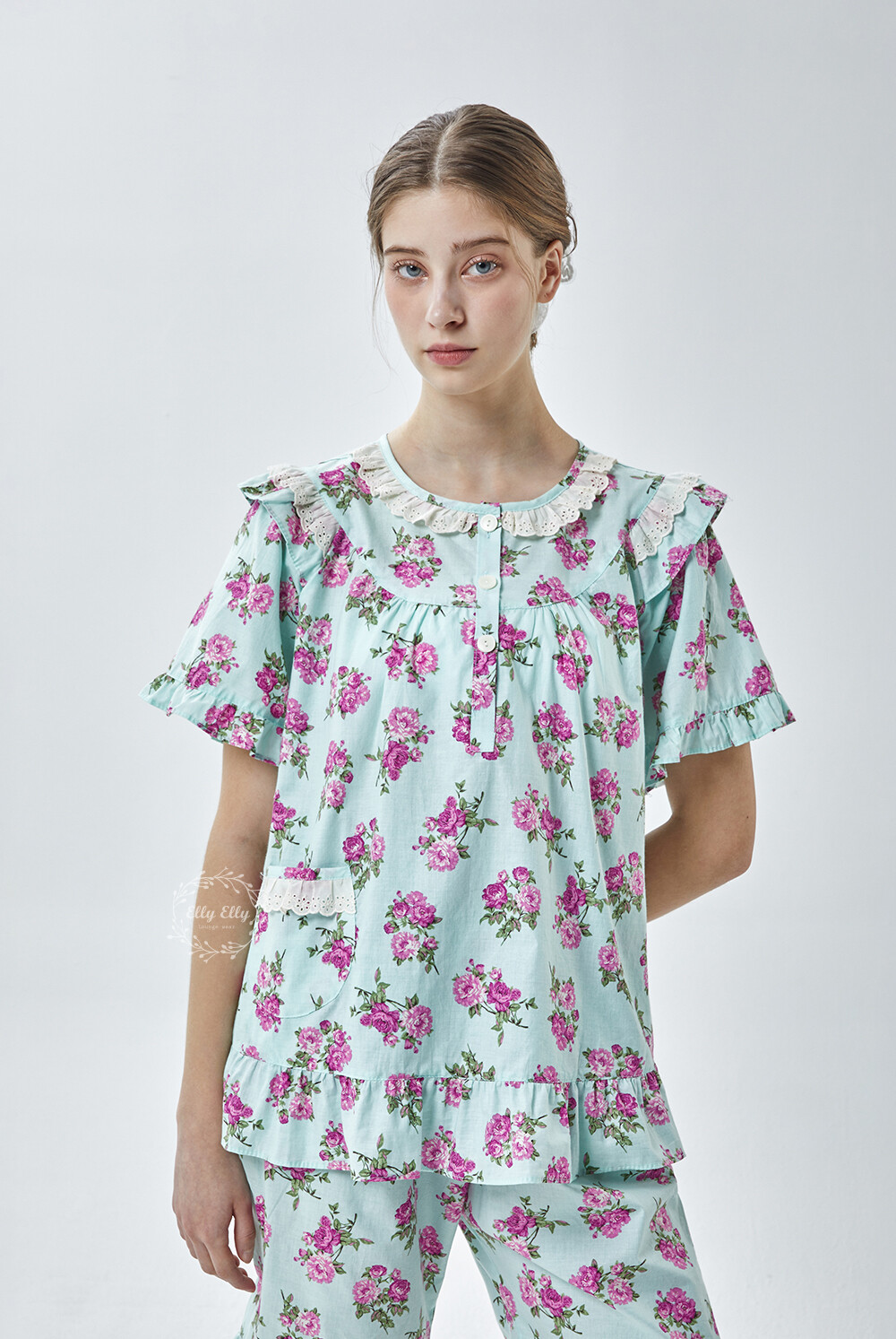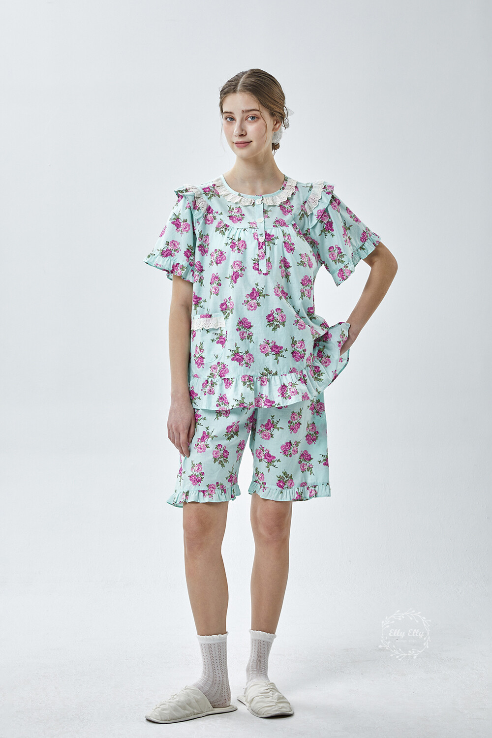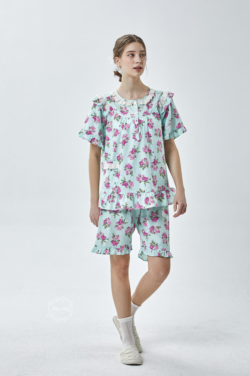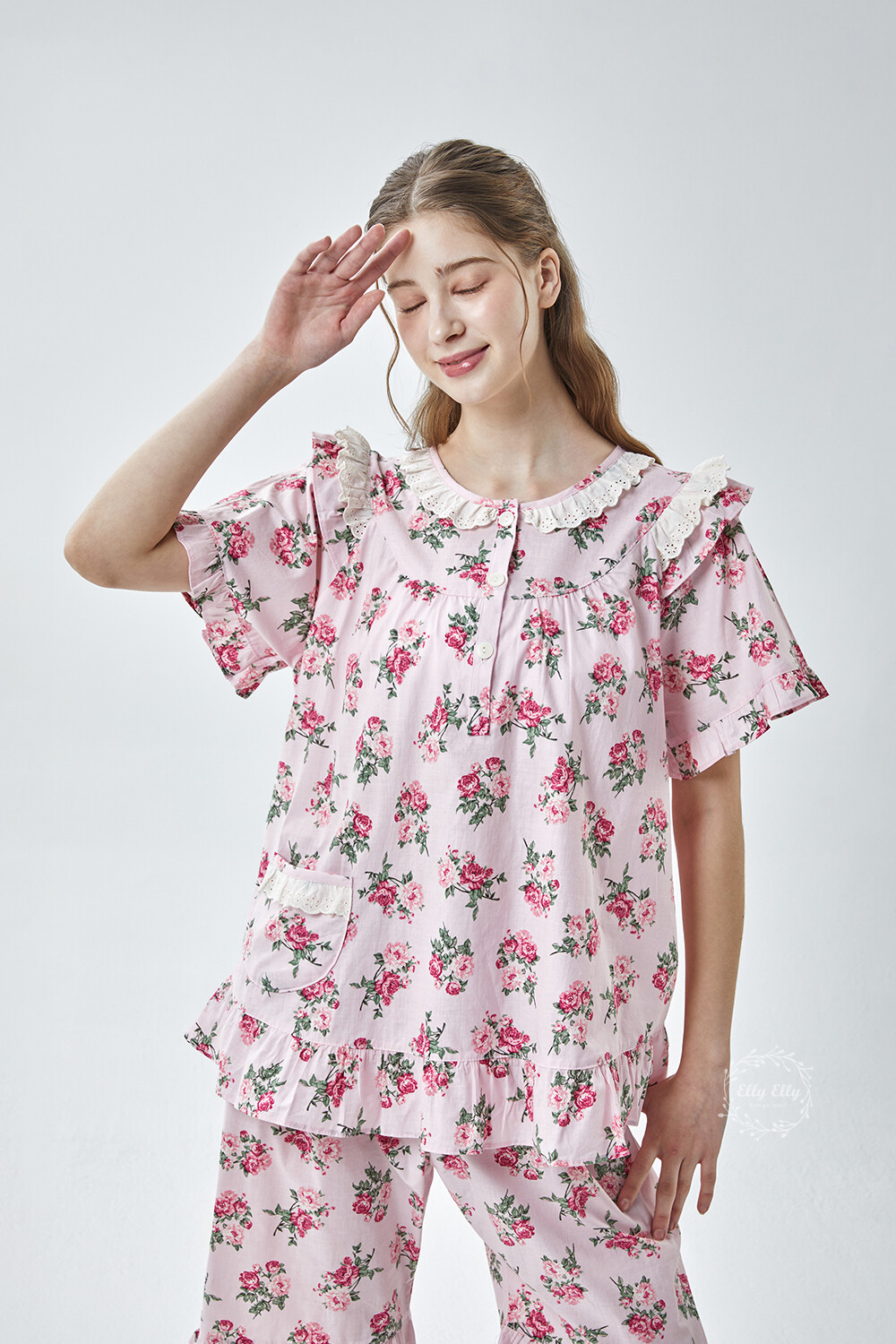 LL-907 엘리엘리 정품 꽃무늬 프릴레이스 반팔상하 2COLOR