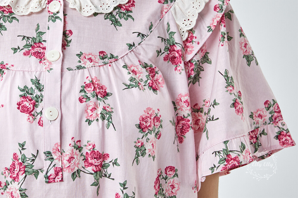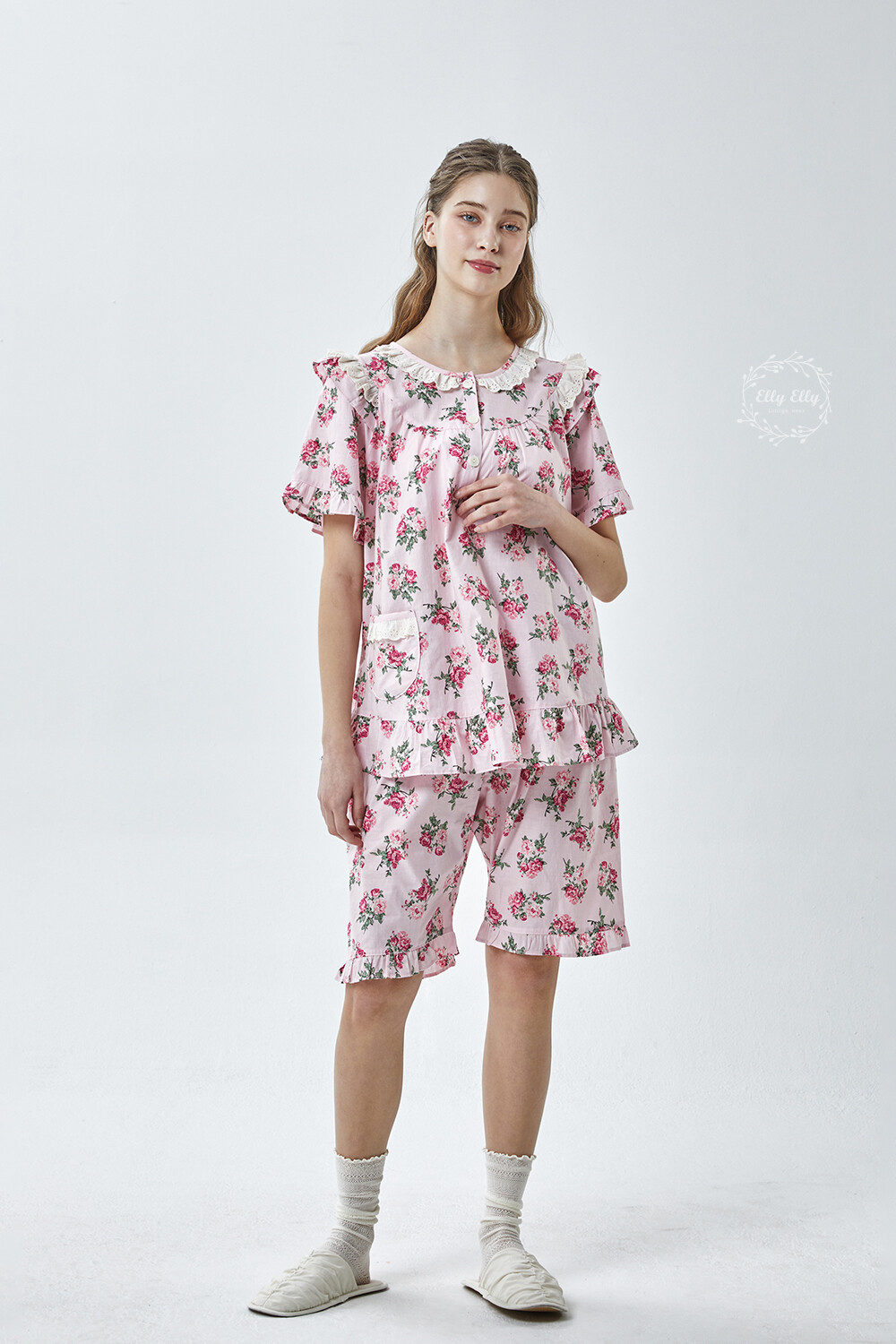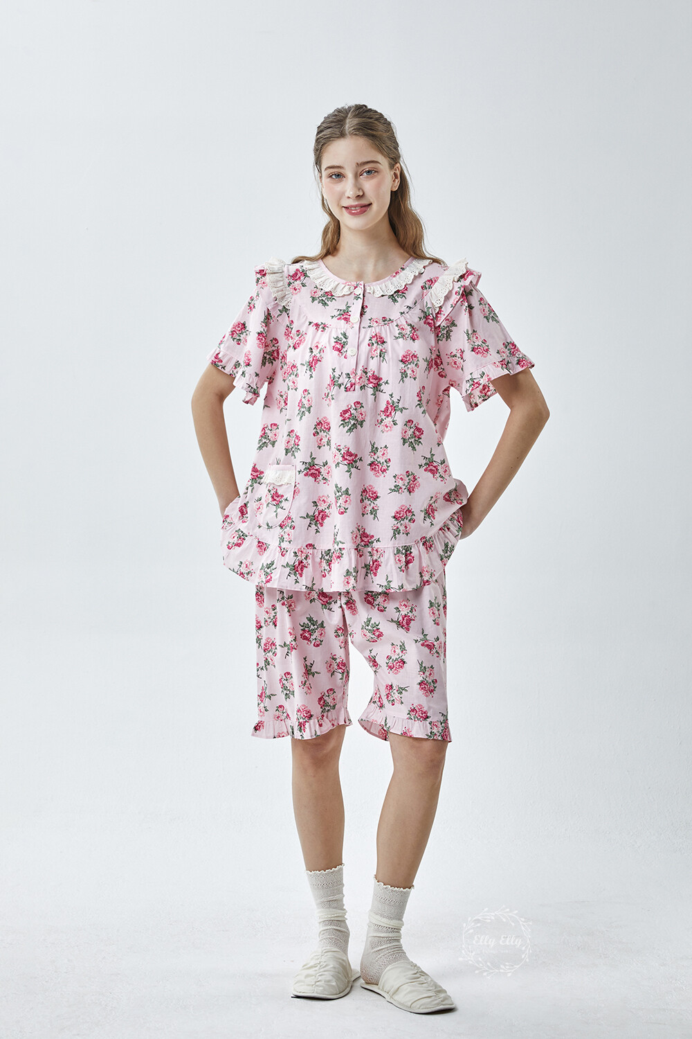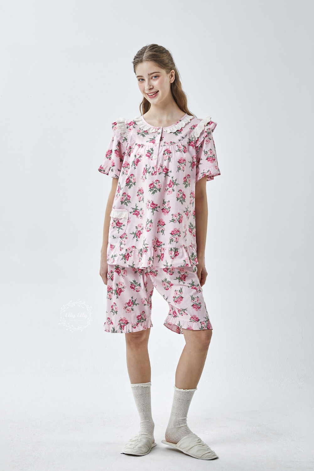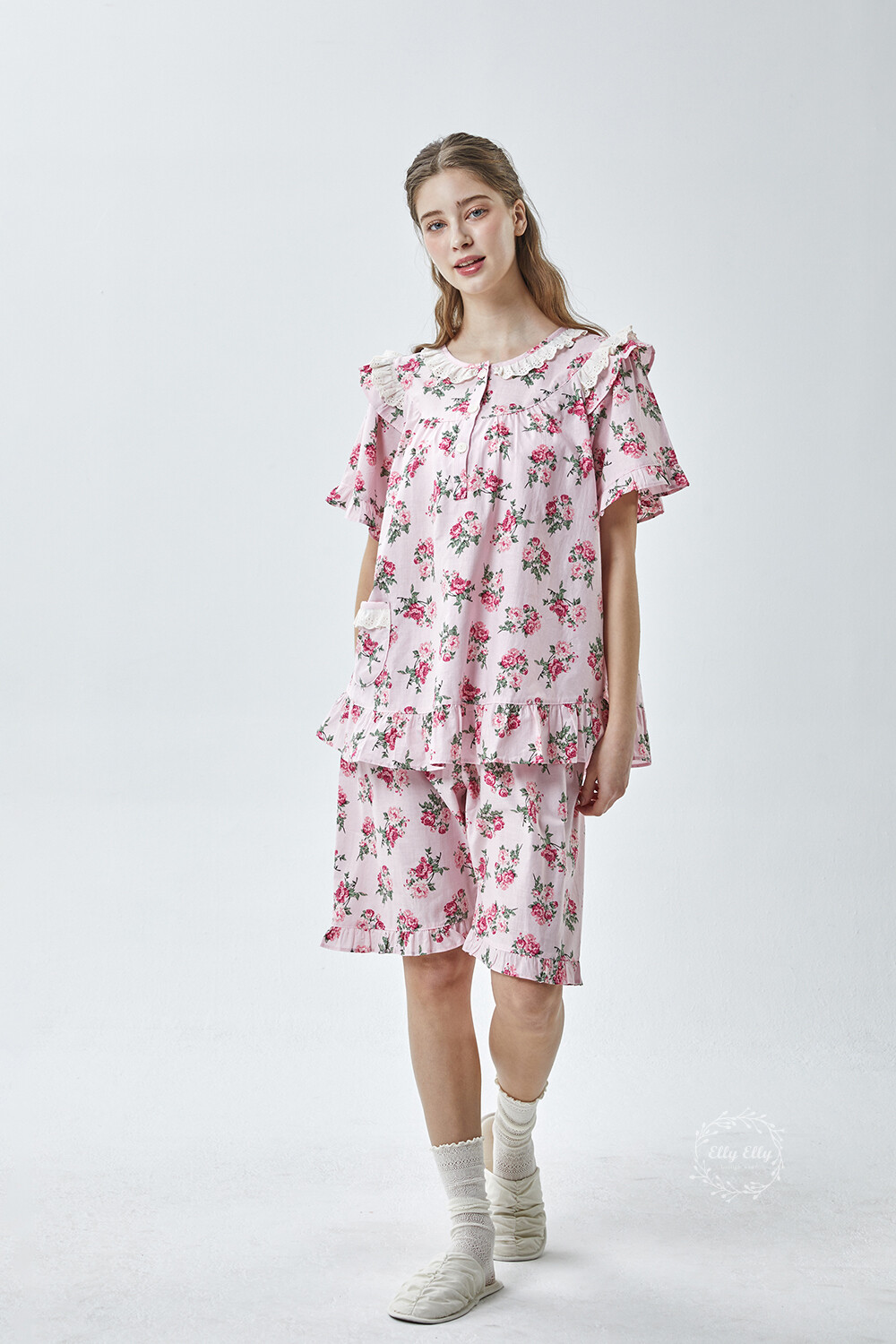 LL-907 엘리엘리 정품 꽃무늬 프릴레이스 반팔상하 2COLOR