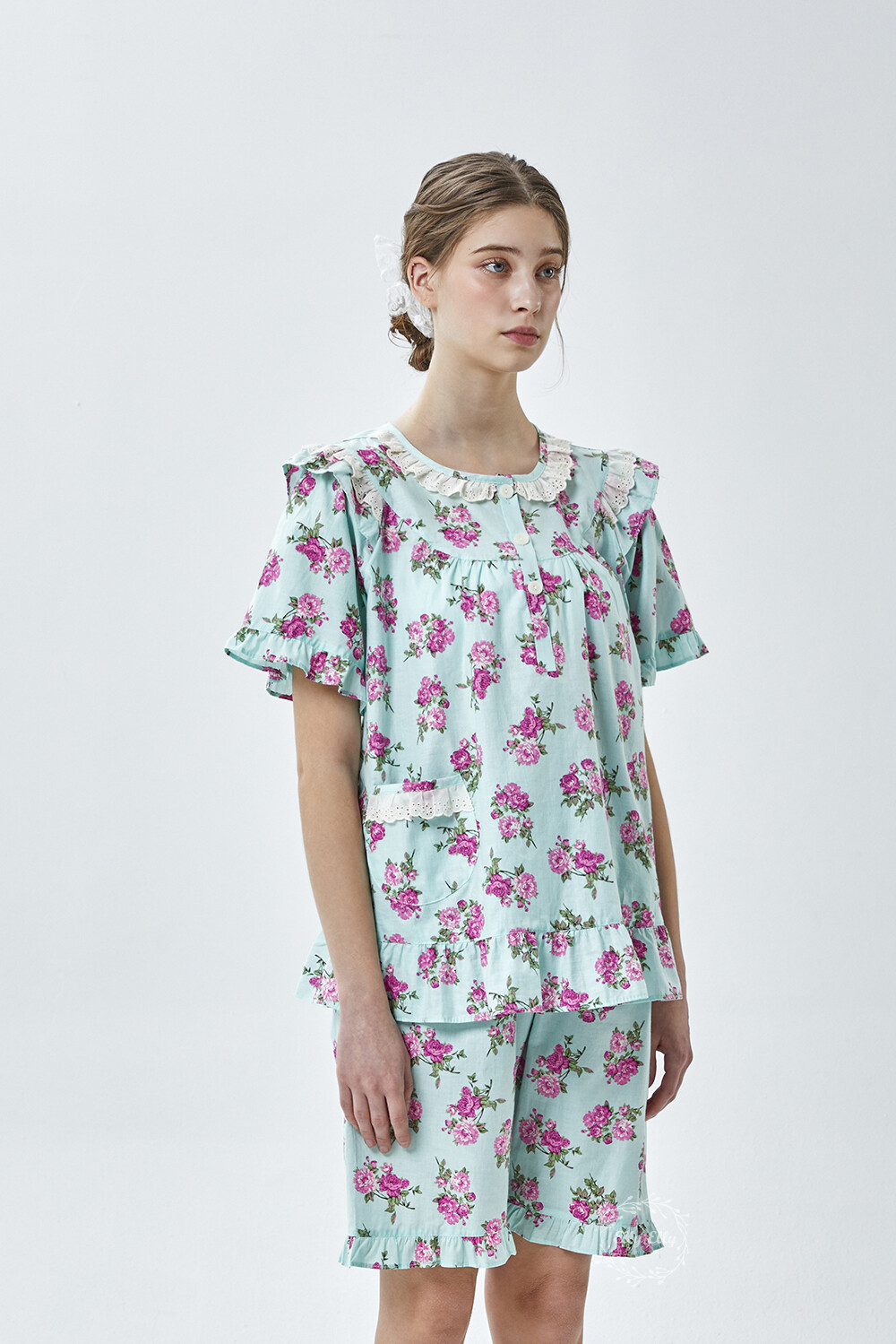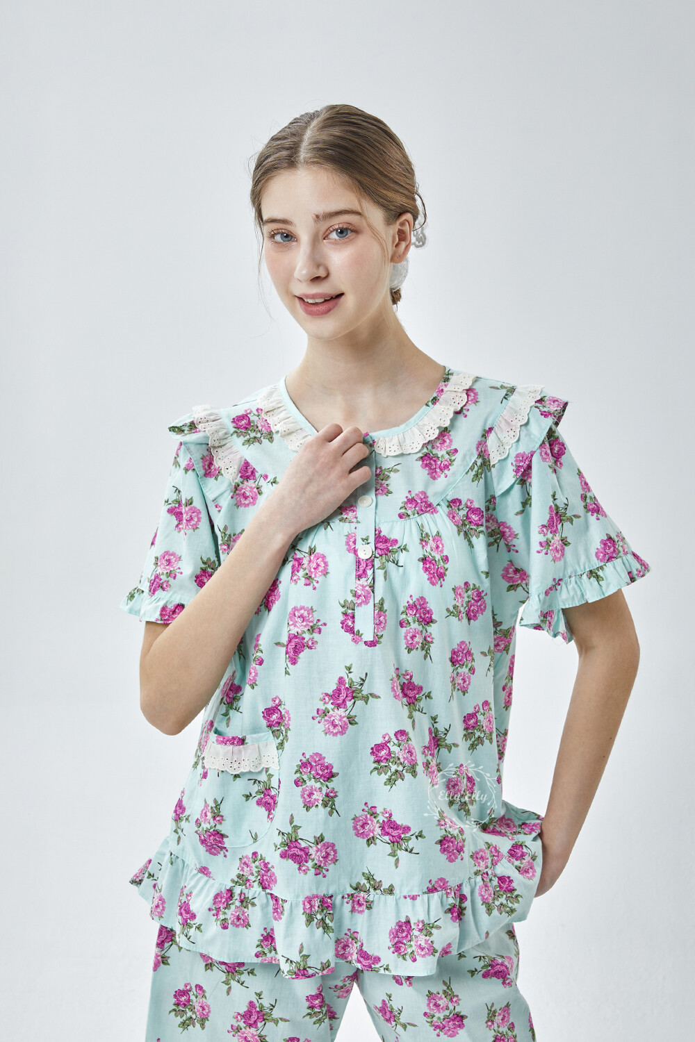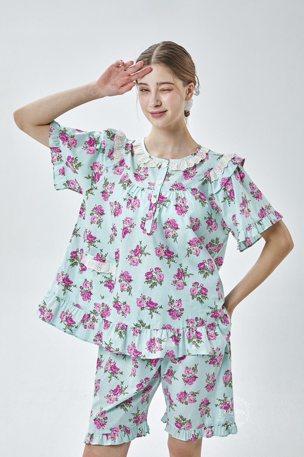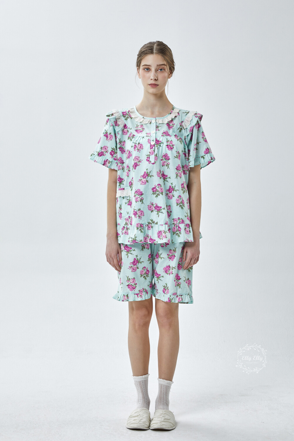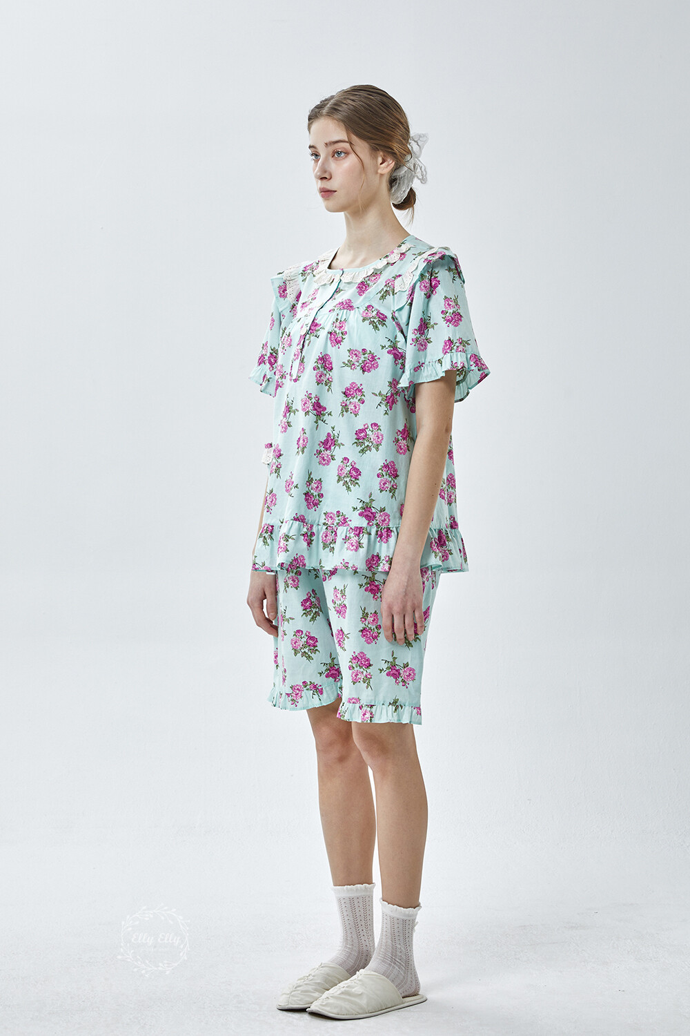 LL-907 엘리엘리 정품 꽃무늬 프릴레이스 반팔상하 2COLOR