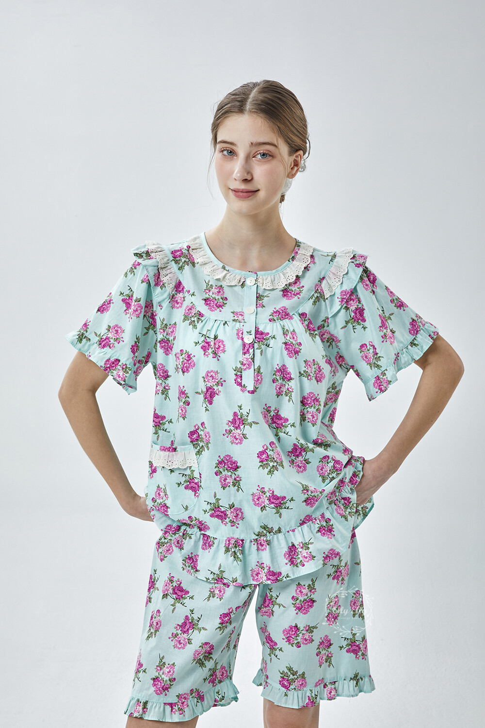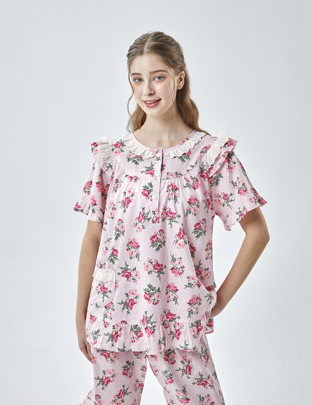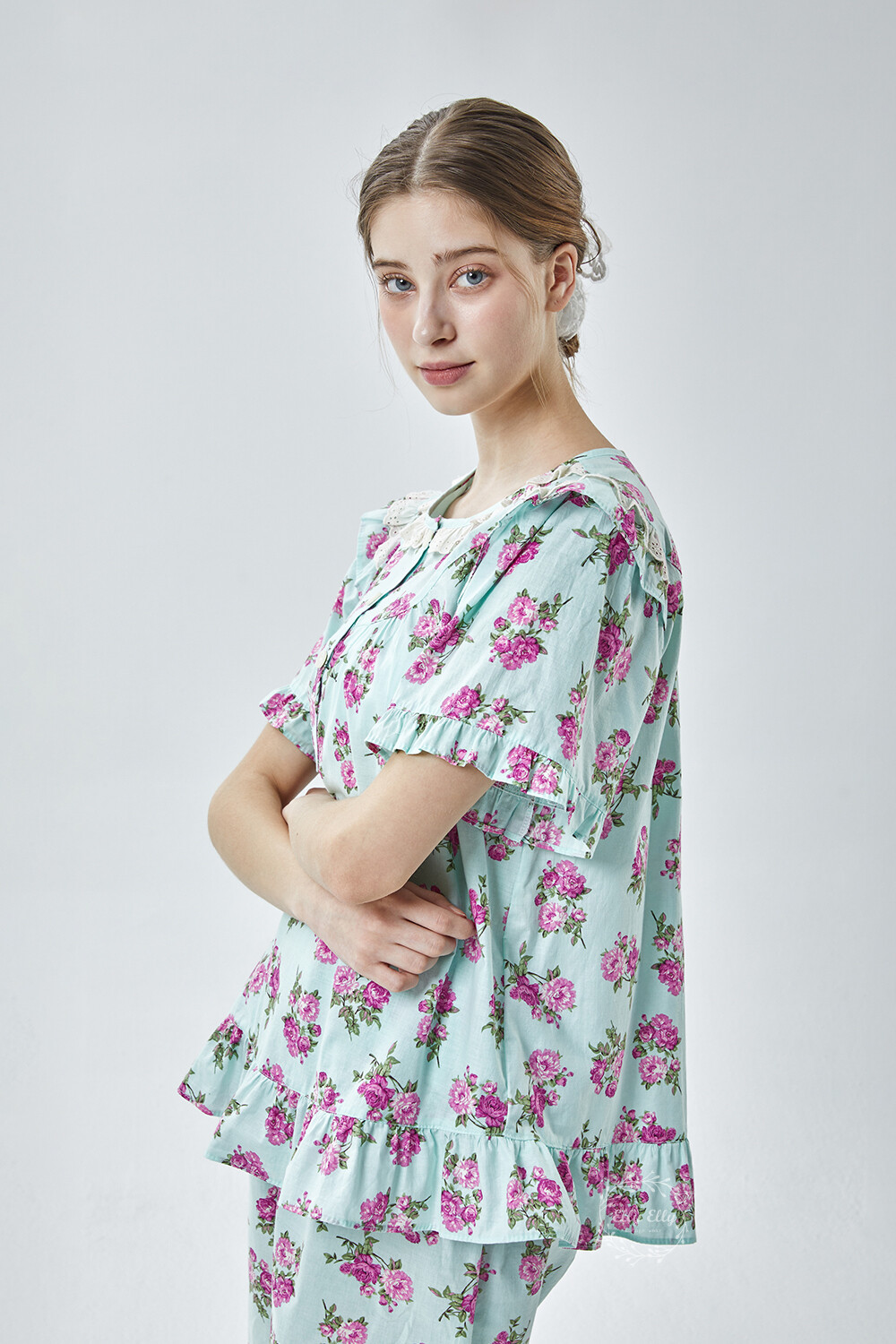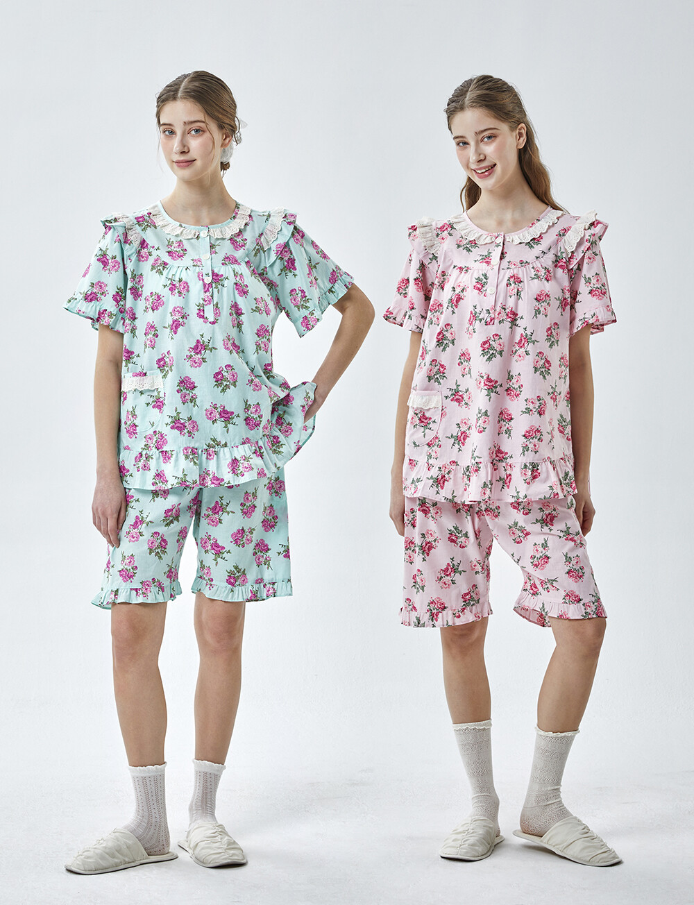 LL-907 엘리엘리 정품 꽃무늬 프릴레이스 반팔상하 2COLOR