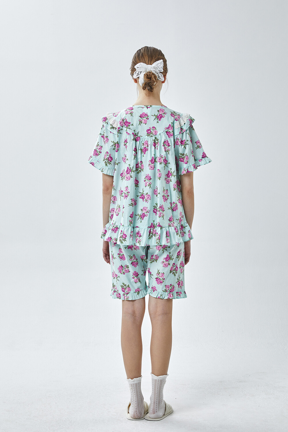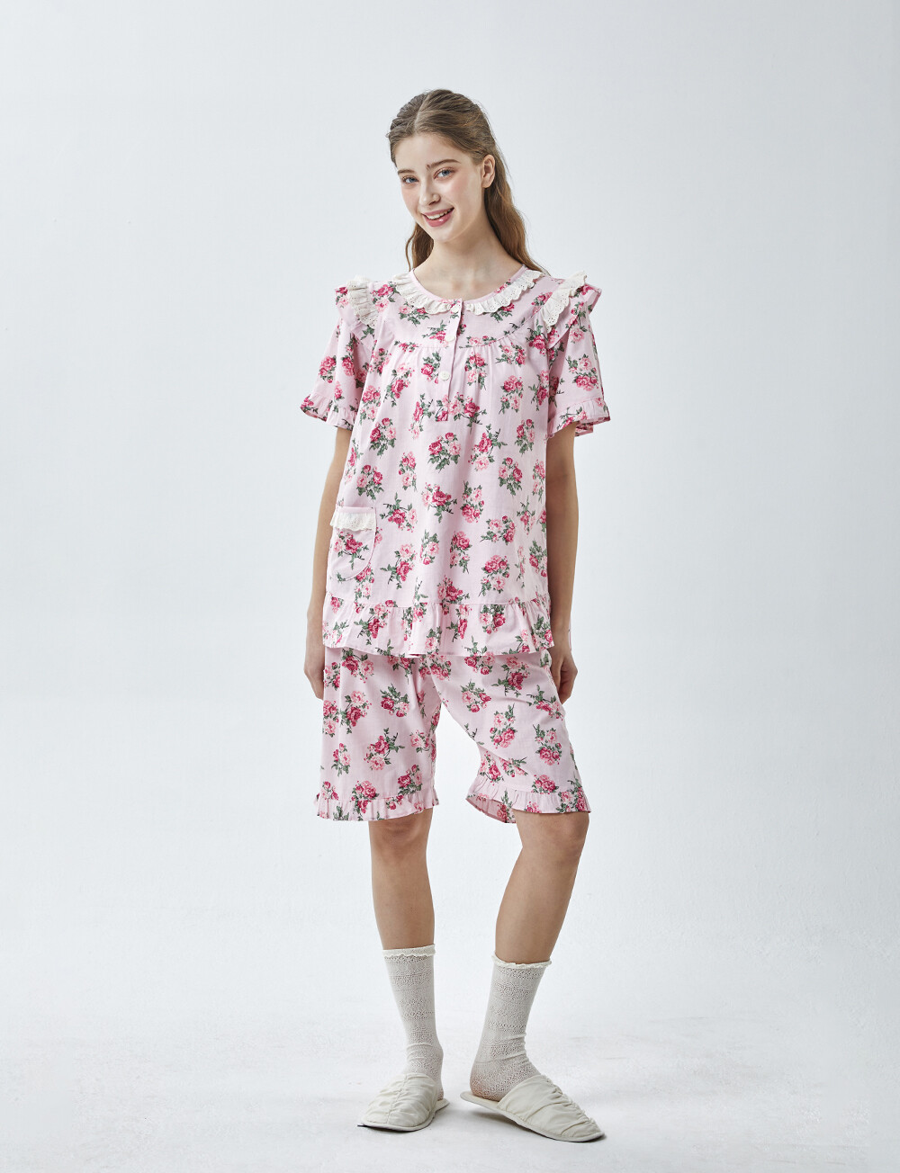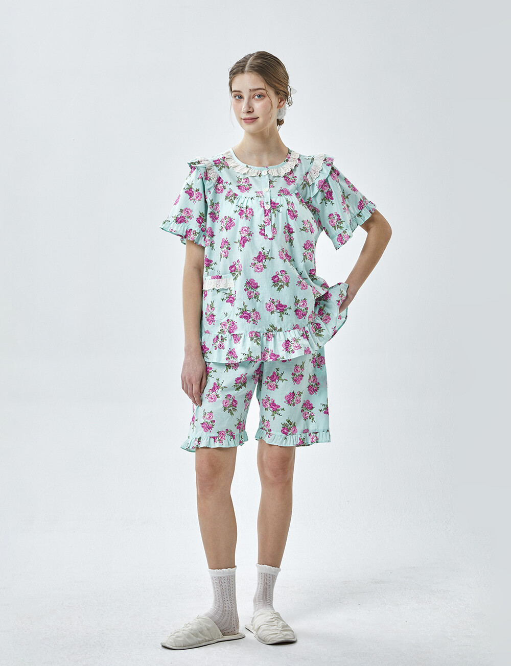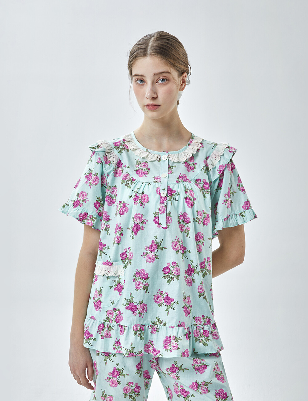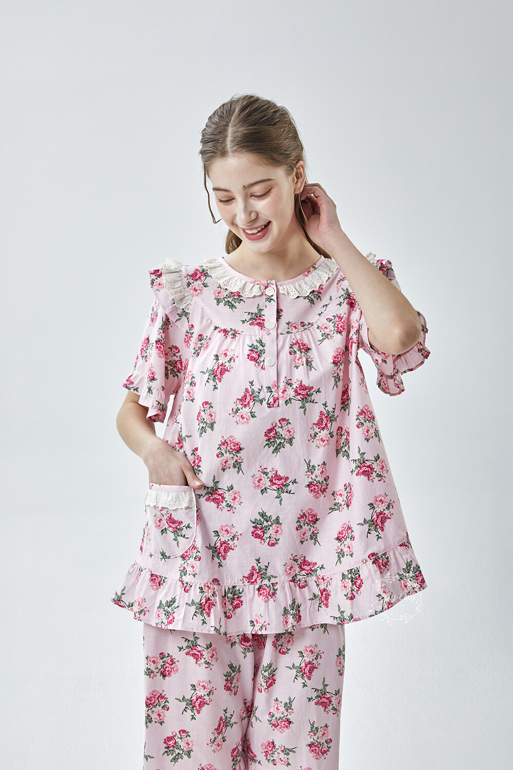 LL-907 엘리엘리 정품 꽃무늬 프릴레이스 반팔상하 2COLOR