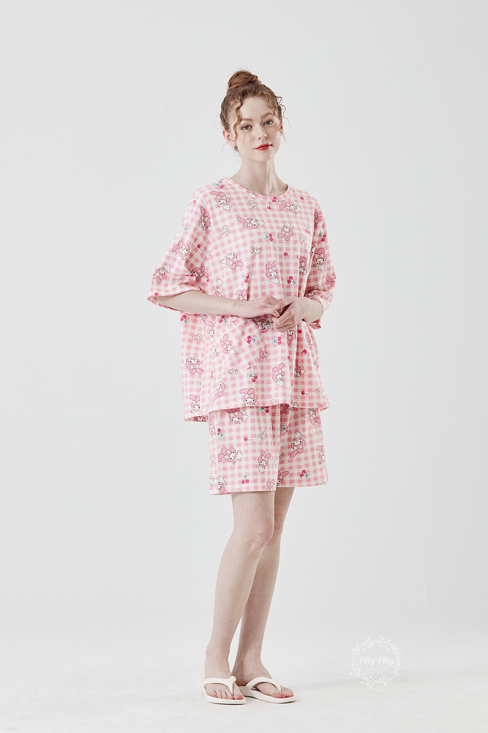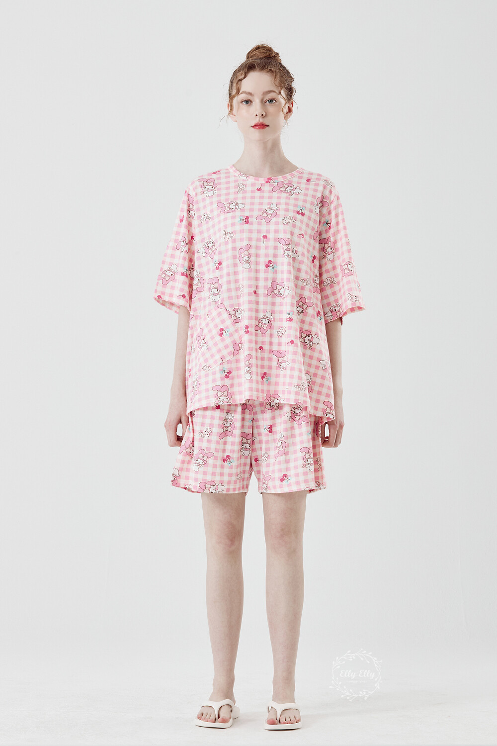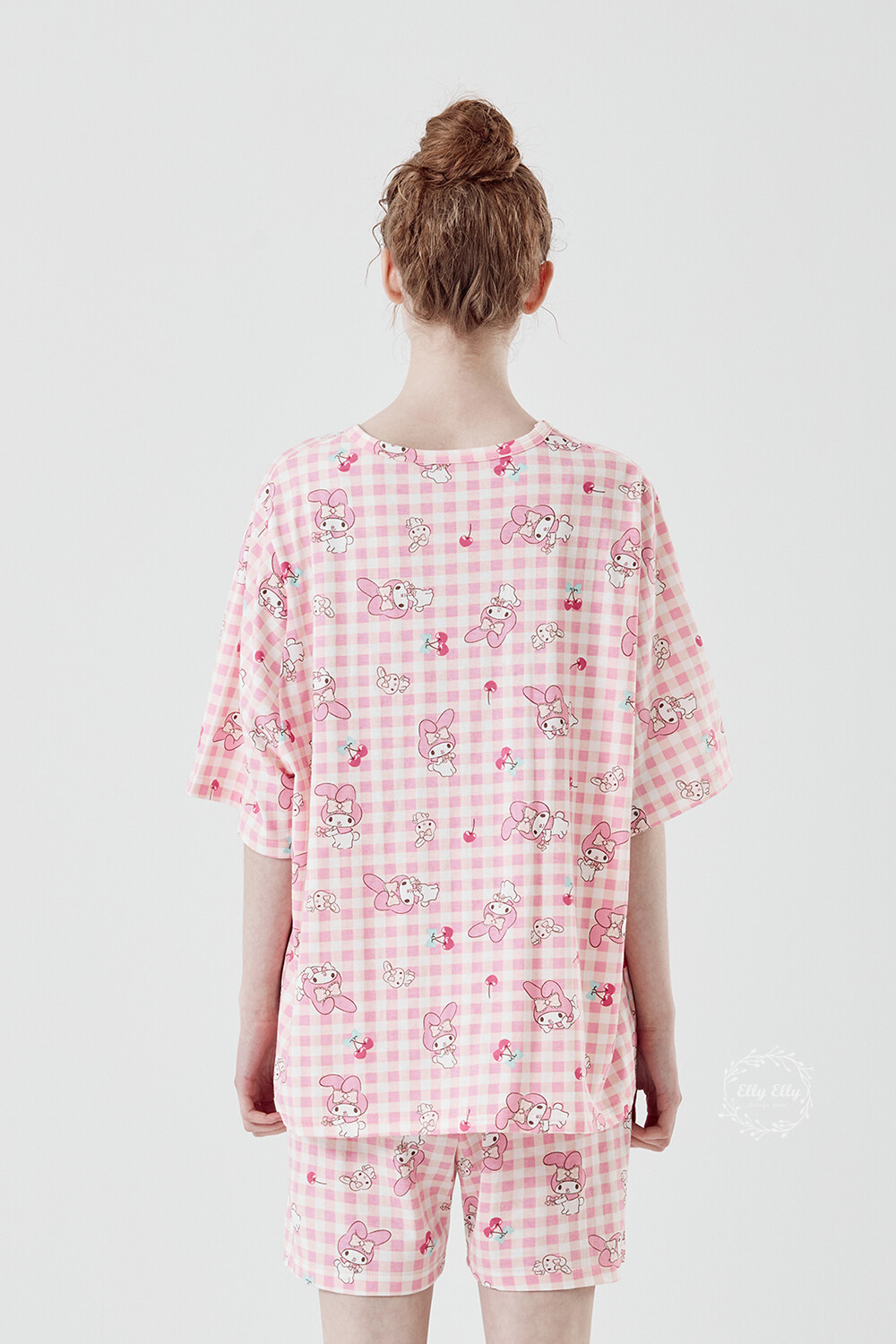 MM-0052 산리오정품 마이멜로디 체크무늬 다이마루 반팔상하